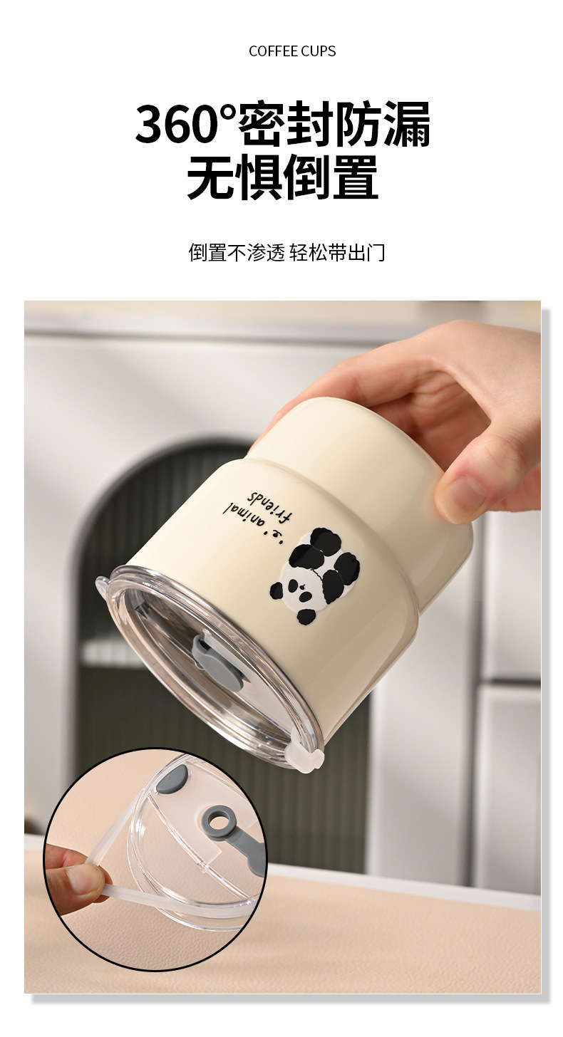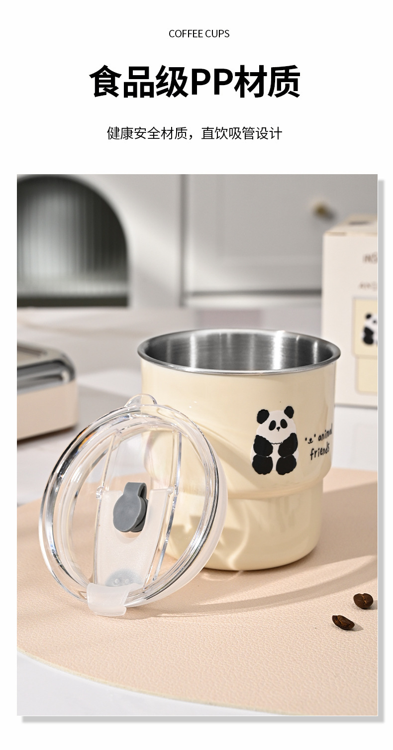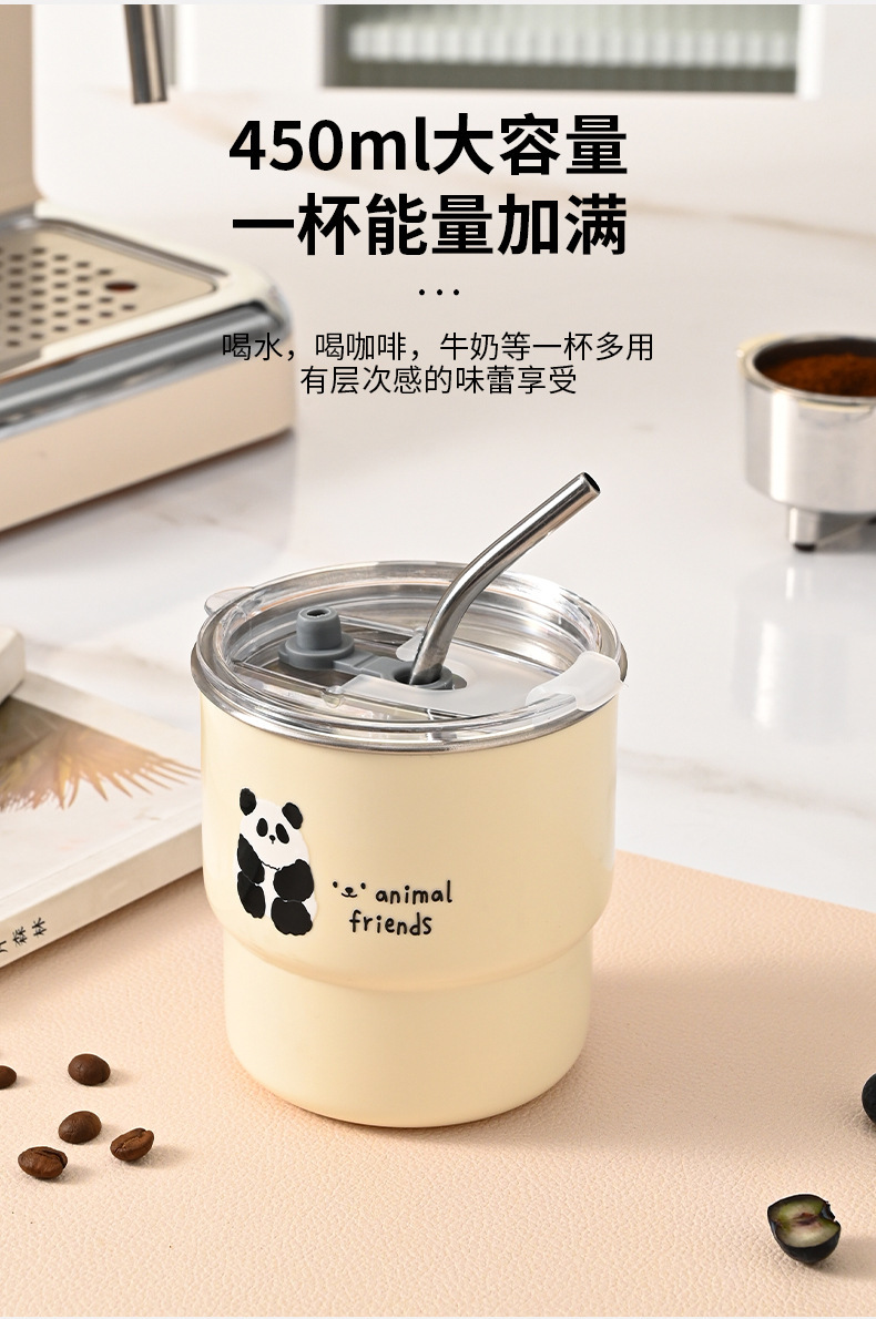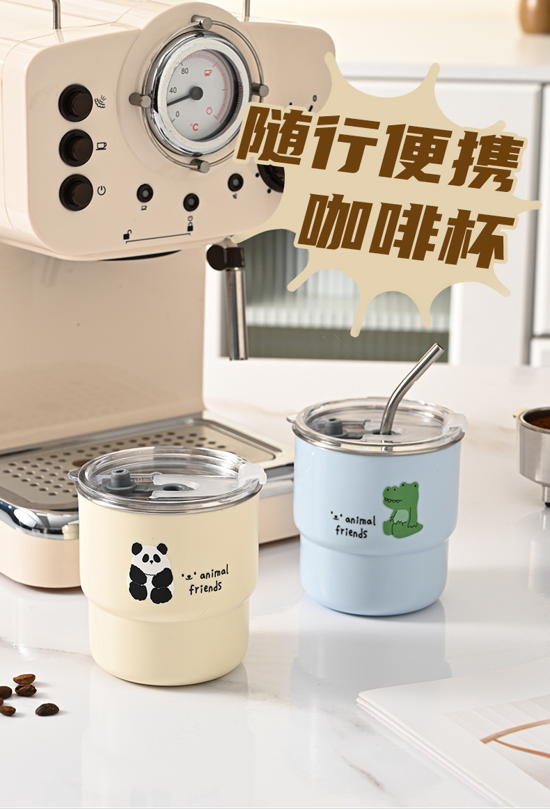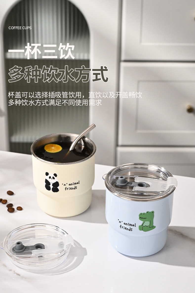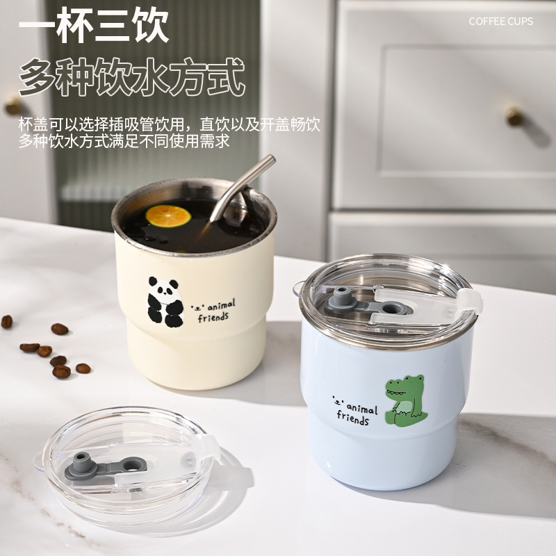 304不锈钢咖啡杯家用杯子上班族奶茶杯带盖吸管杯可爱卡通饮料杯
