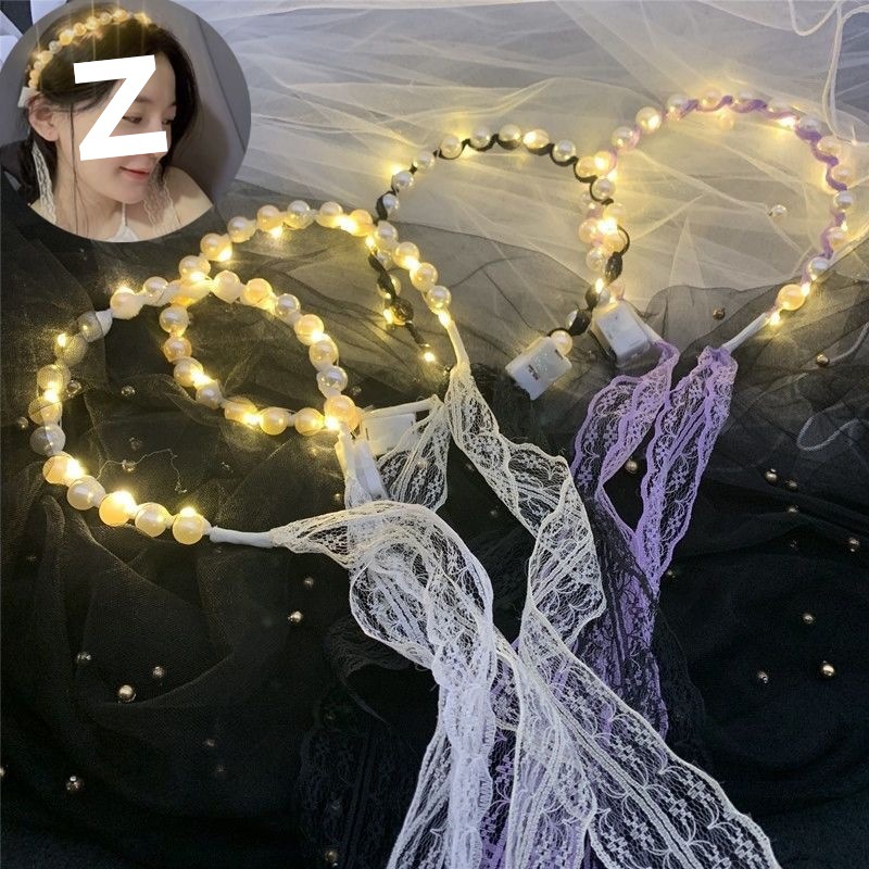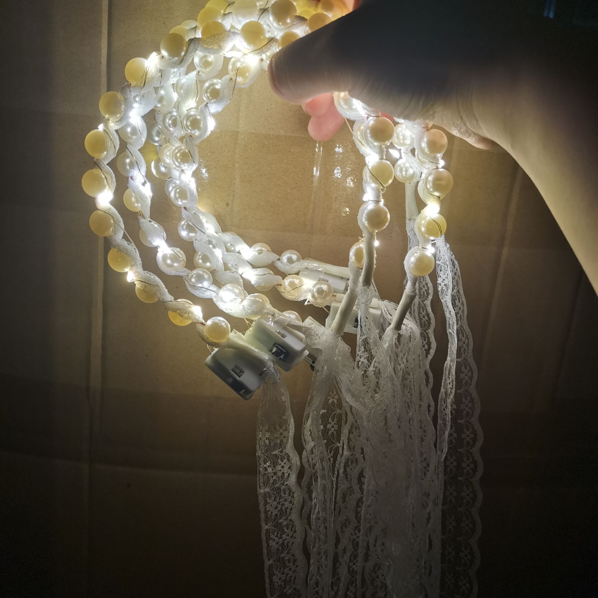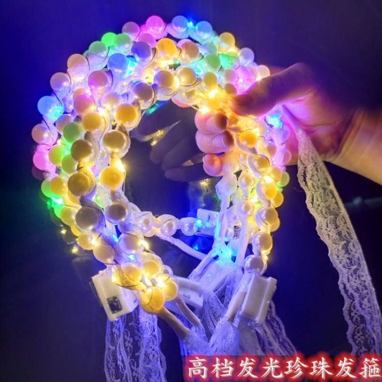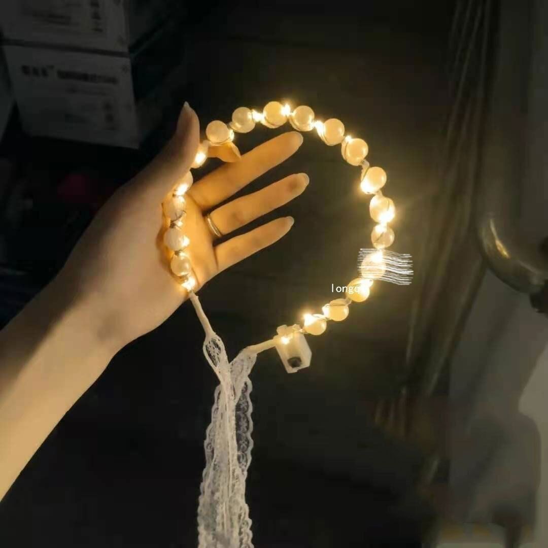 网红发光珍珠发箍彩灯发夹发带一体系带女绑发蕾丝闪光头纱仙气