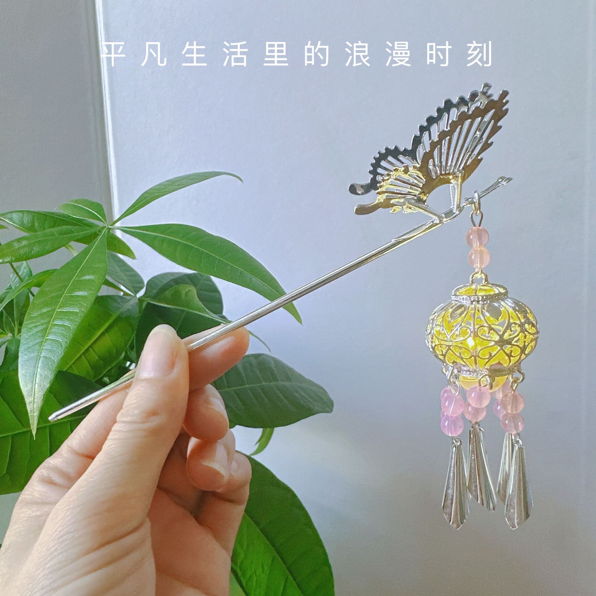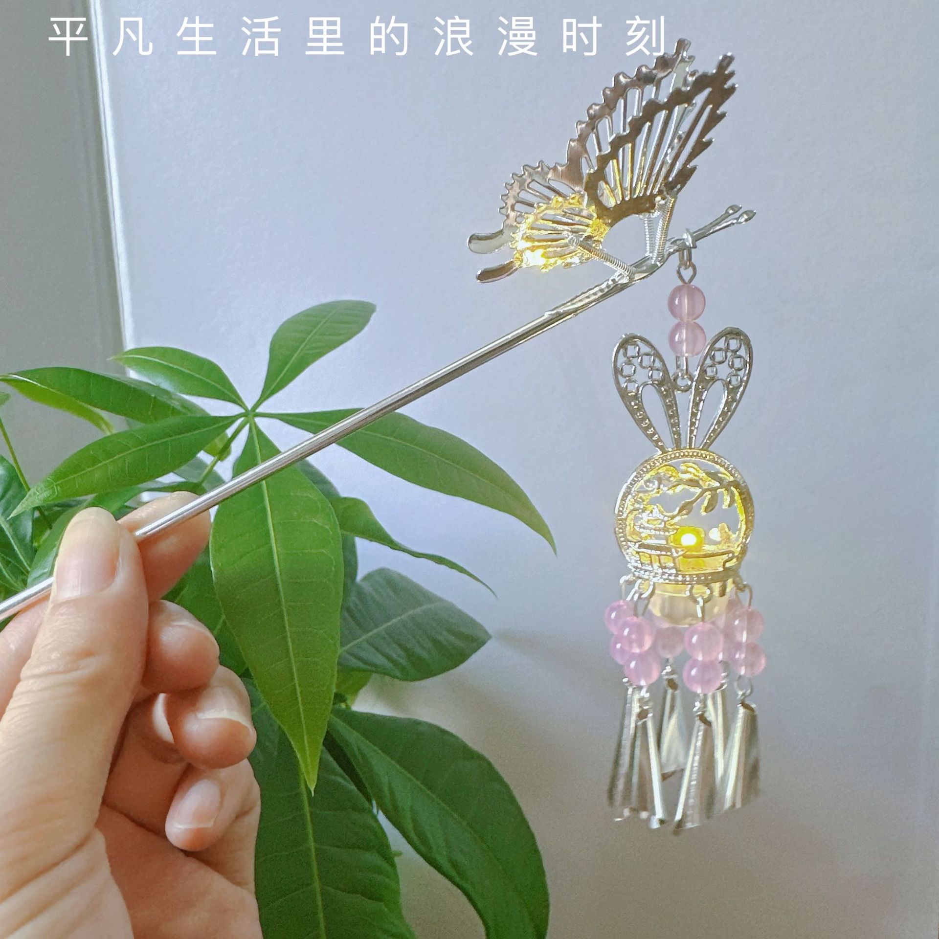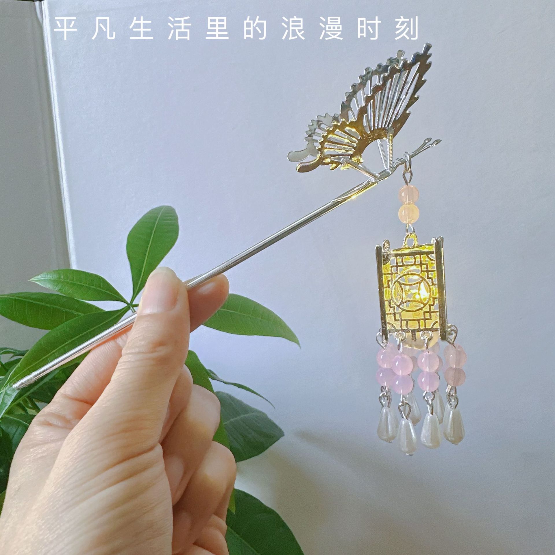 会动的蝴蝶簪子发光凉亭宫灯发簪复古宫廷仙气发光簪子头饰批发