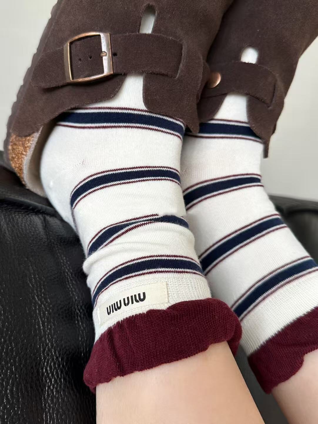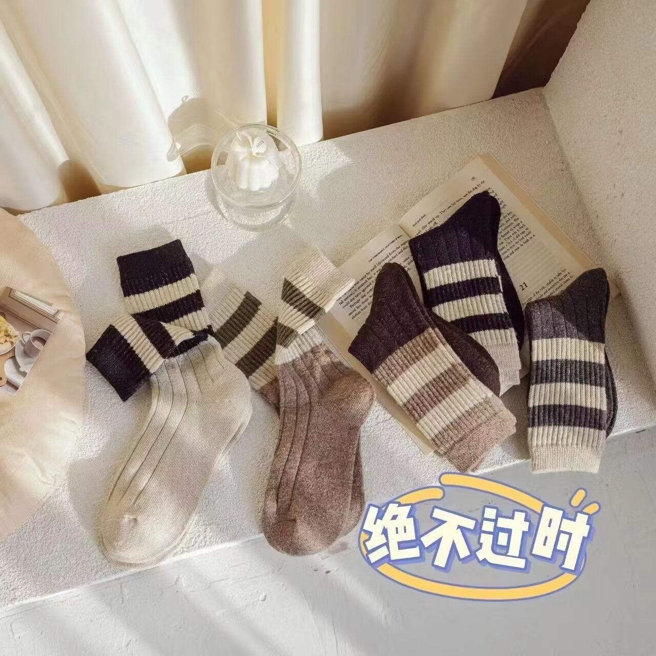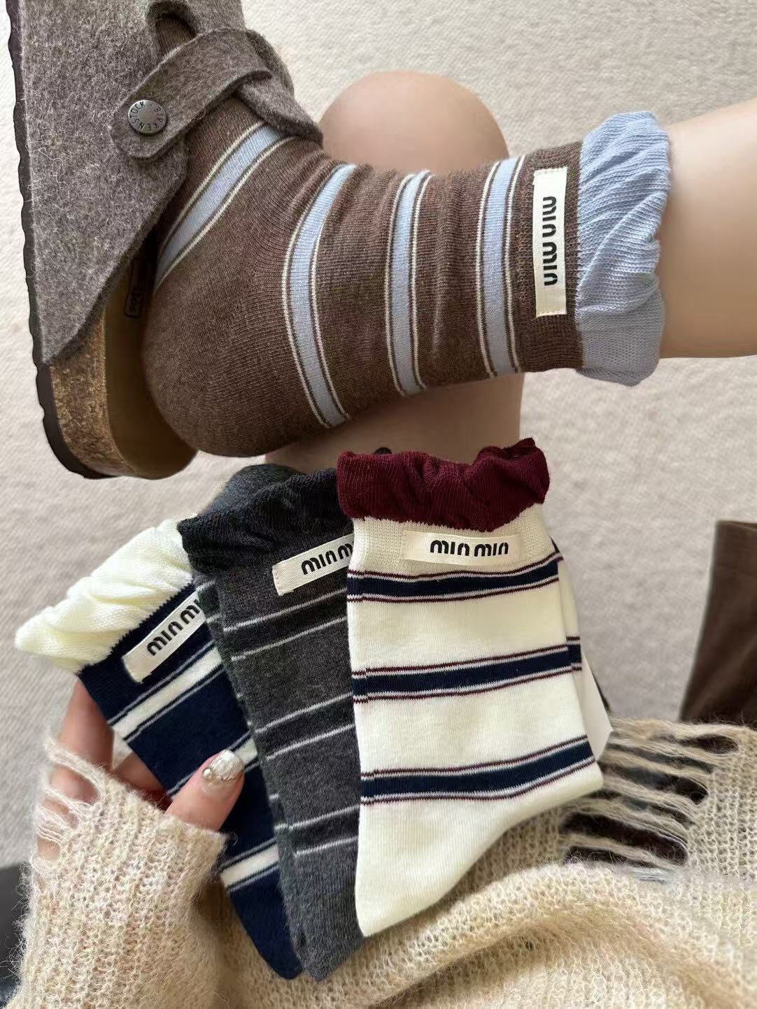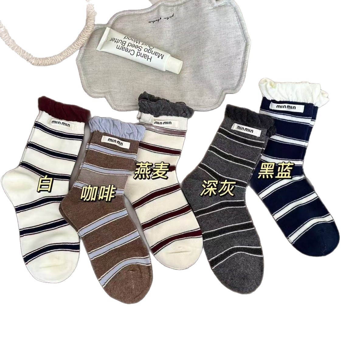 美拉德条纹袜子女春秋季棉袜ins潮复古花边中筒袜学院风咖色长袜
