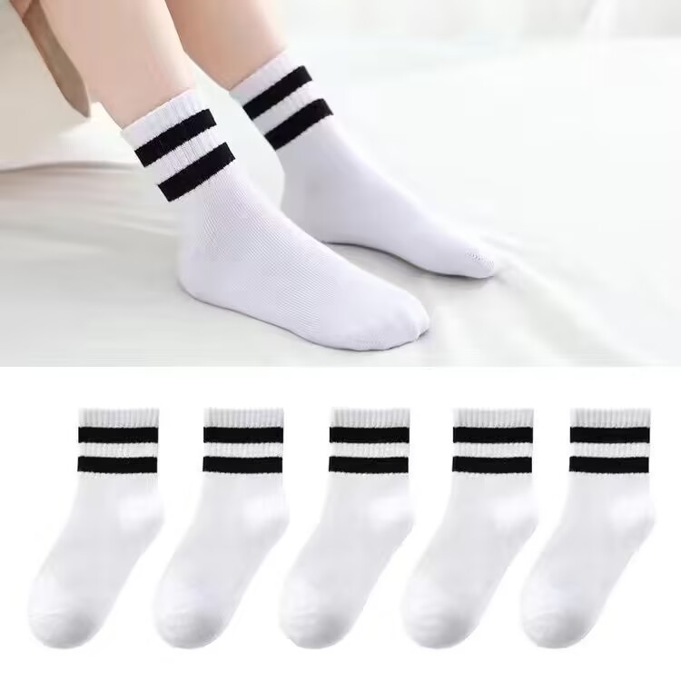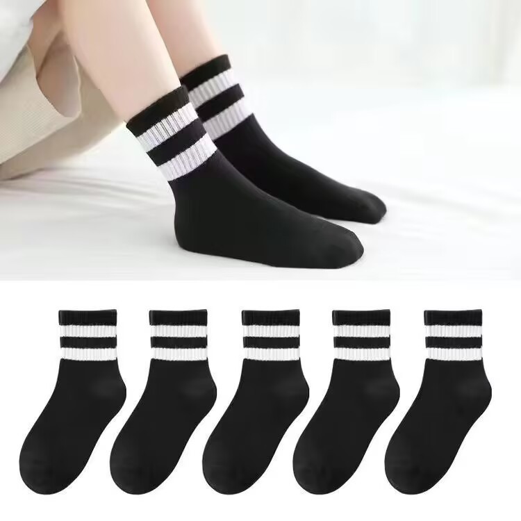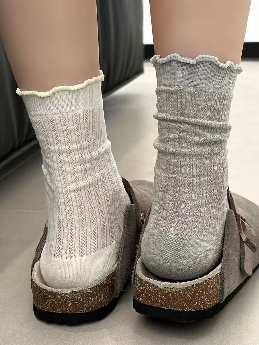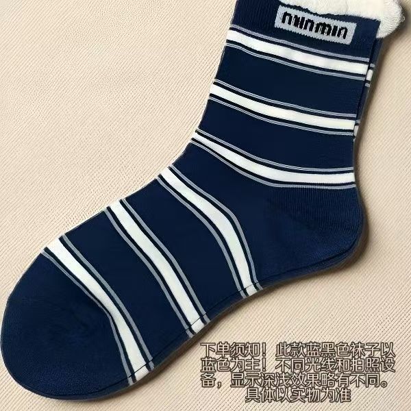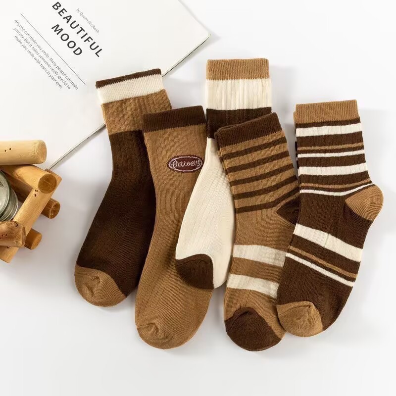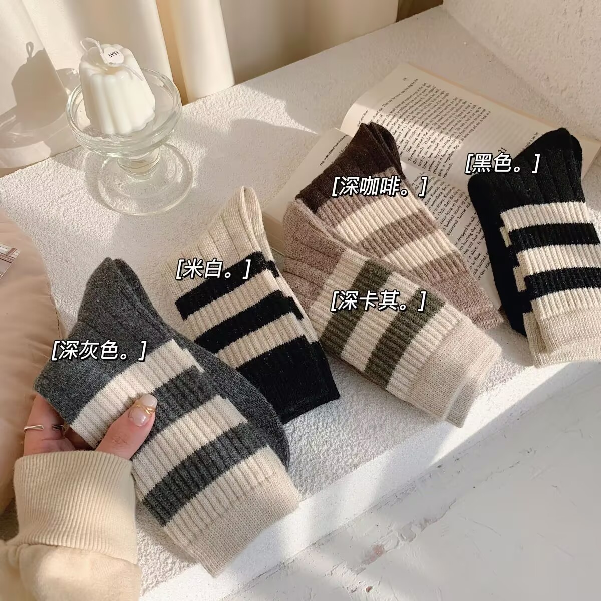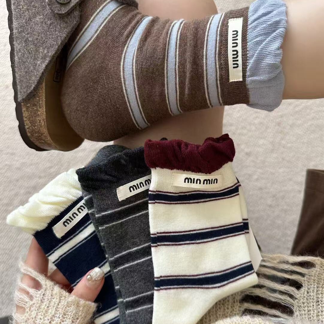 美拉德条纹袜子女春秋季棉袜ins潮复古花边中筒袜学院风咖色长袜