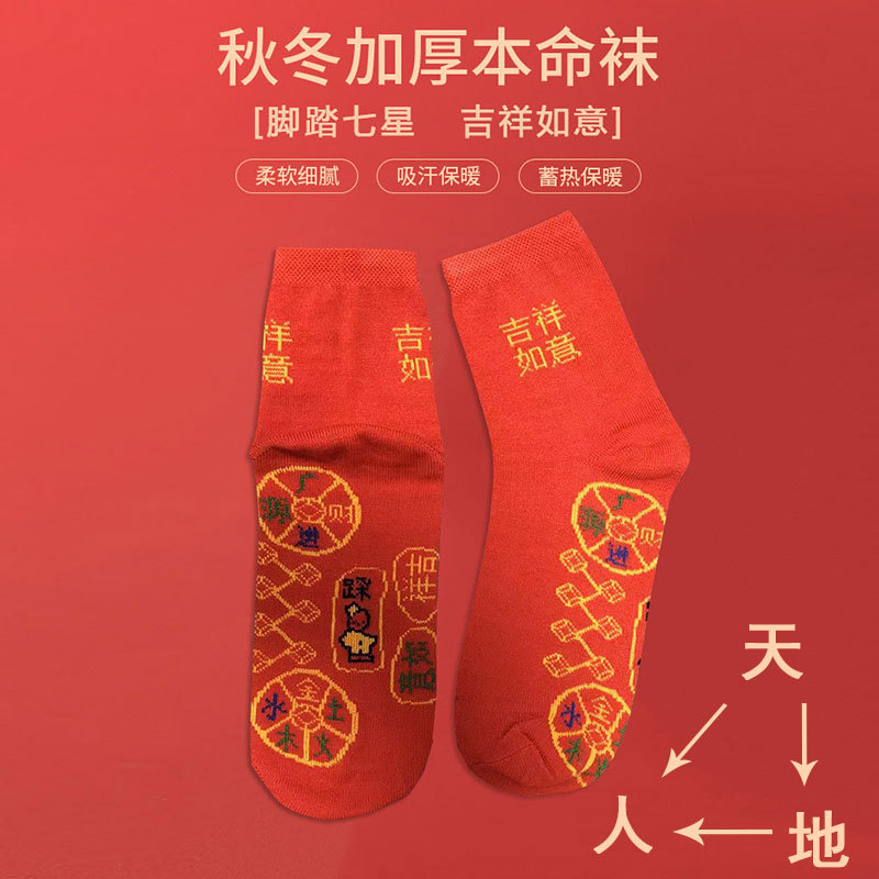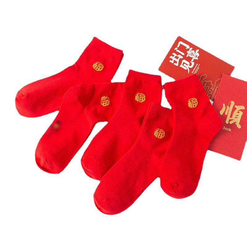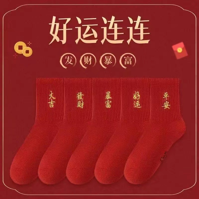 红袜子批发男女中筒棉袜秋冬款福字大红袜本命年脚踏铜钱吉祥如意