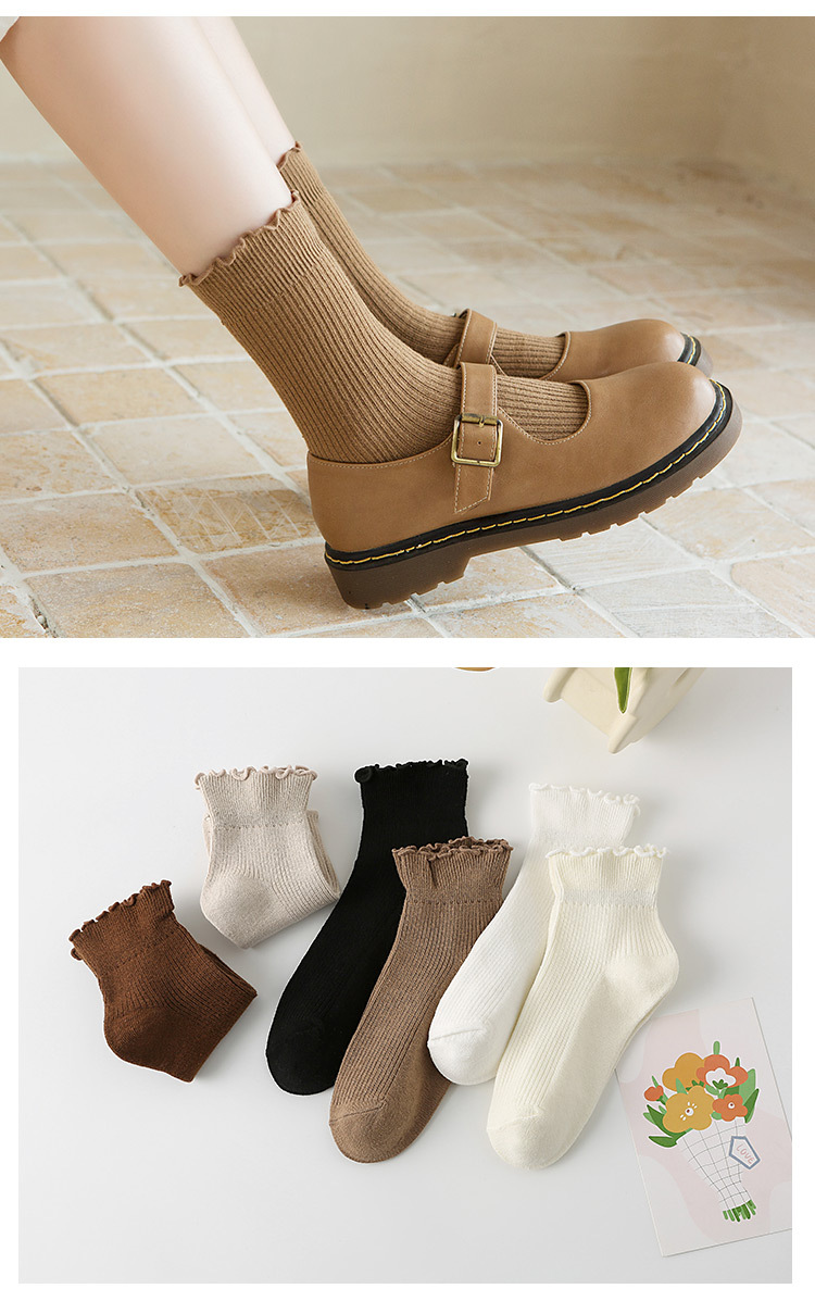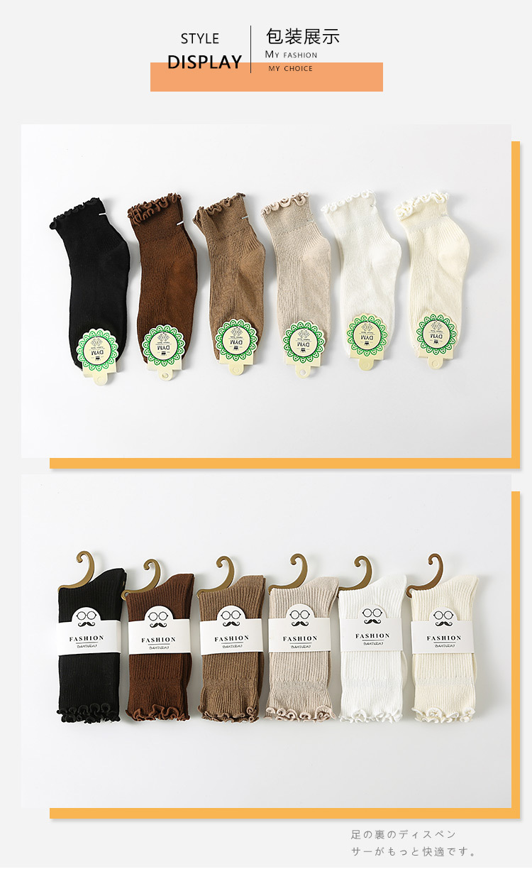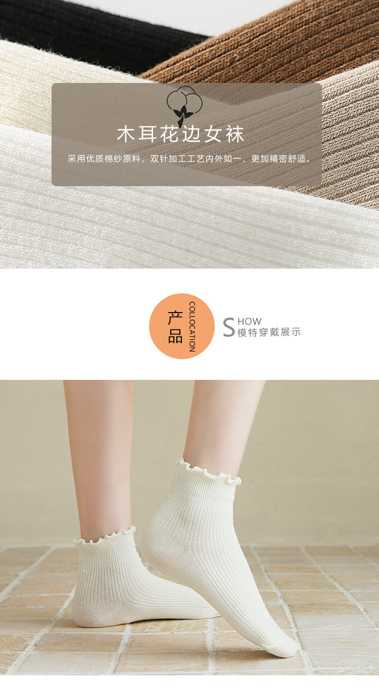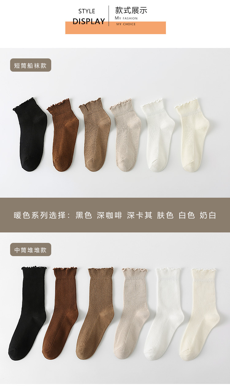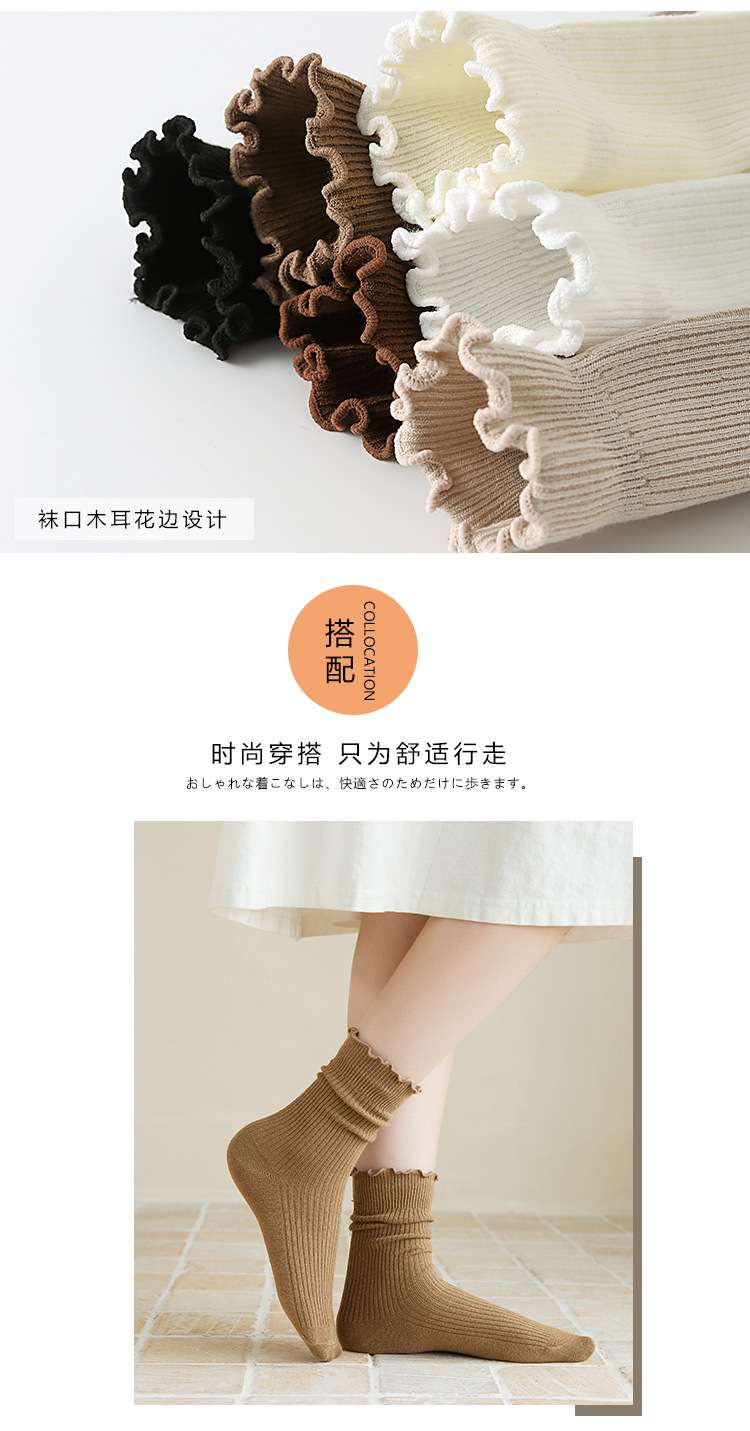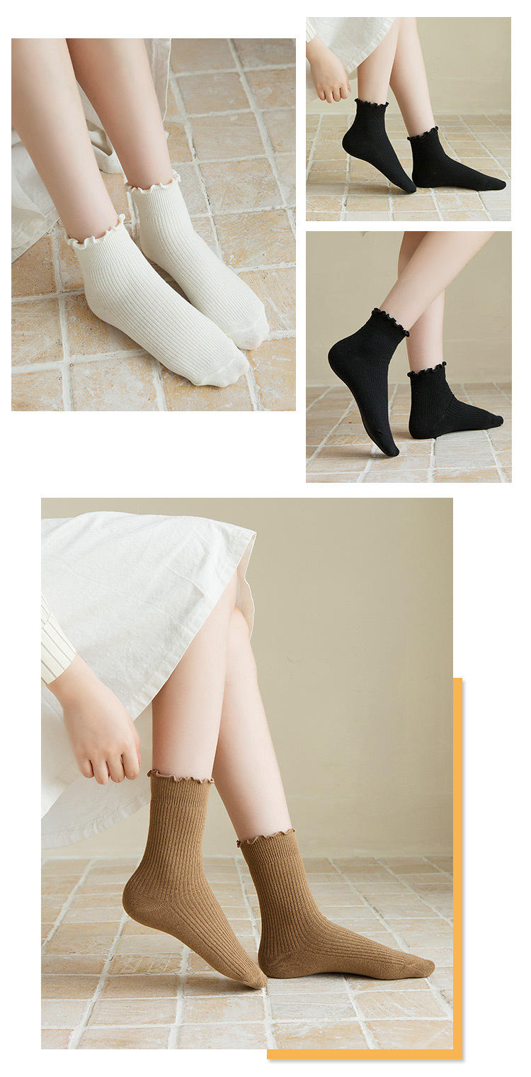 堆堆袜女 日系秋冬双针竖条棉质中筒袜 纯色木耳花边短筒女士袜子