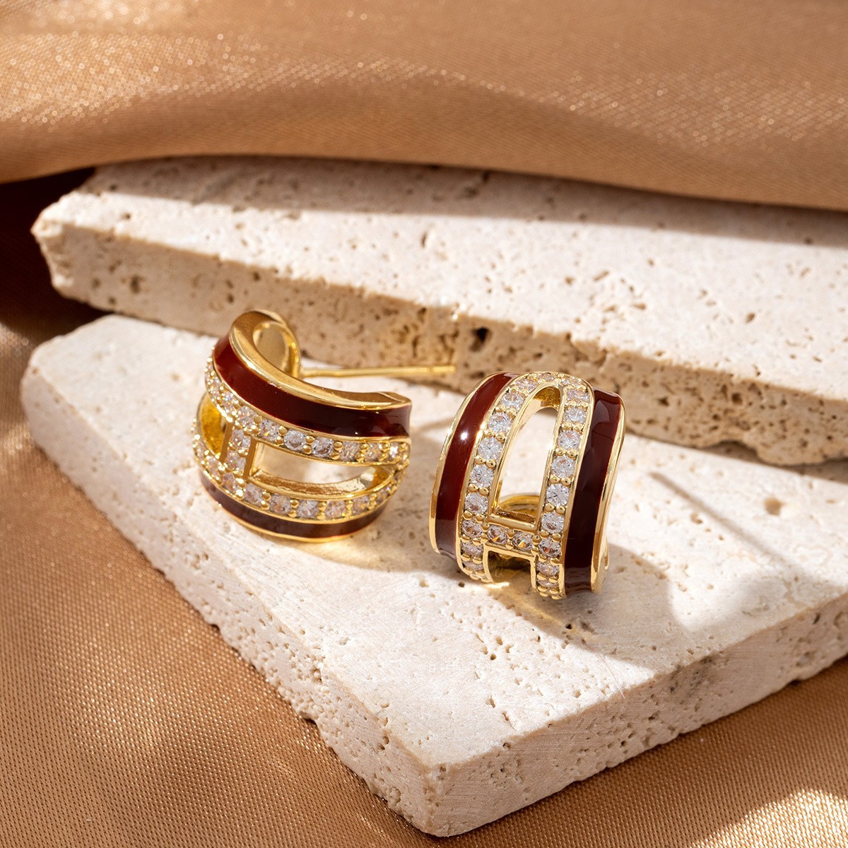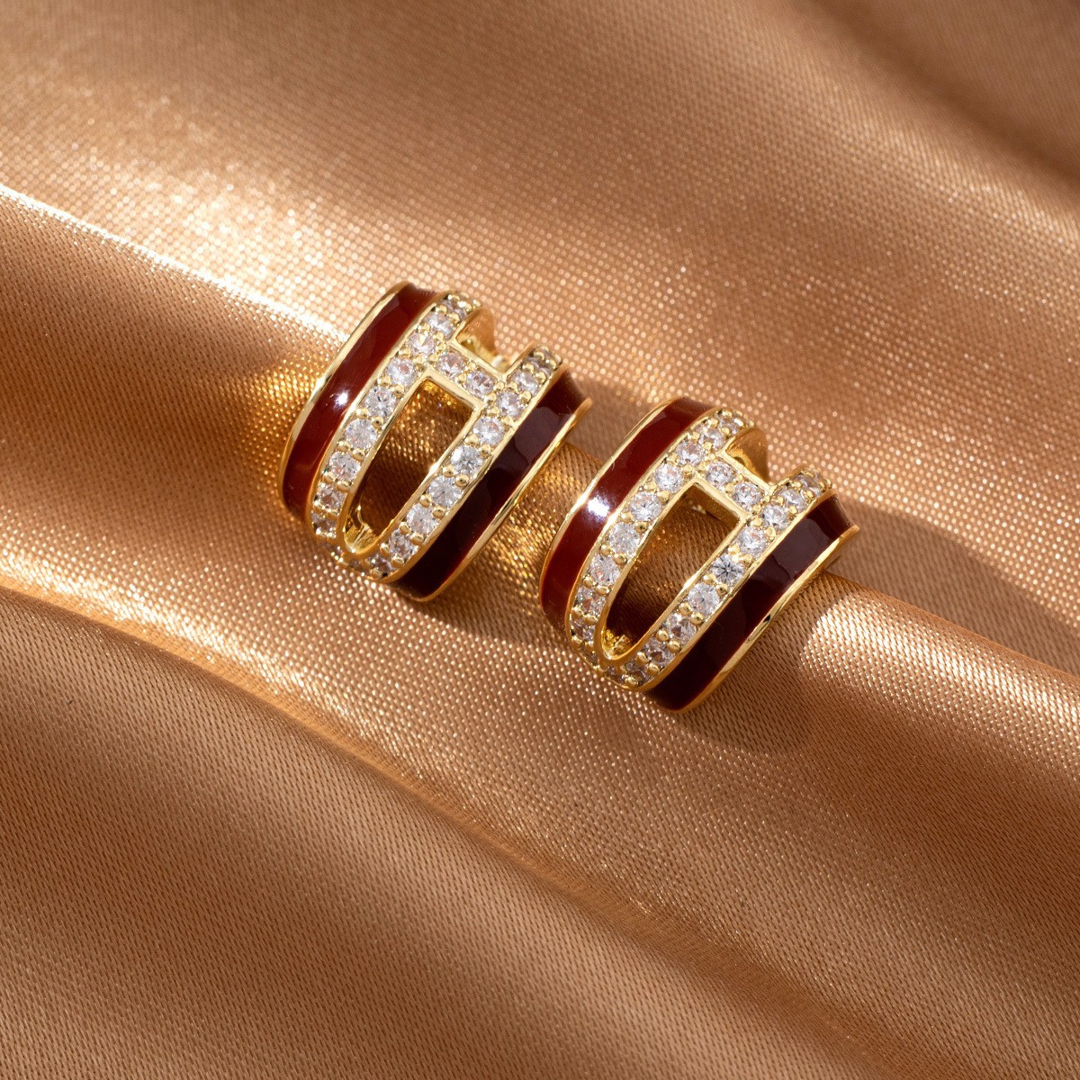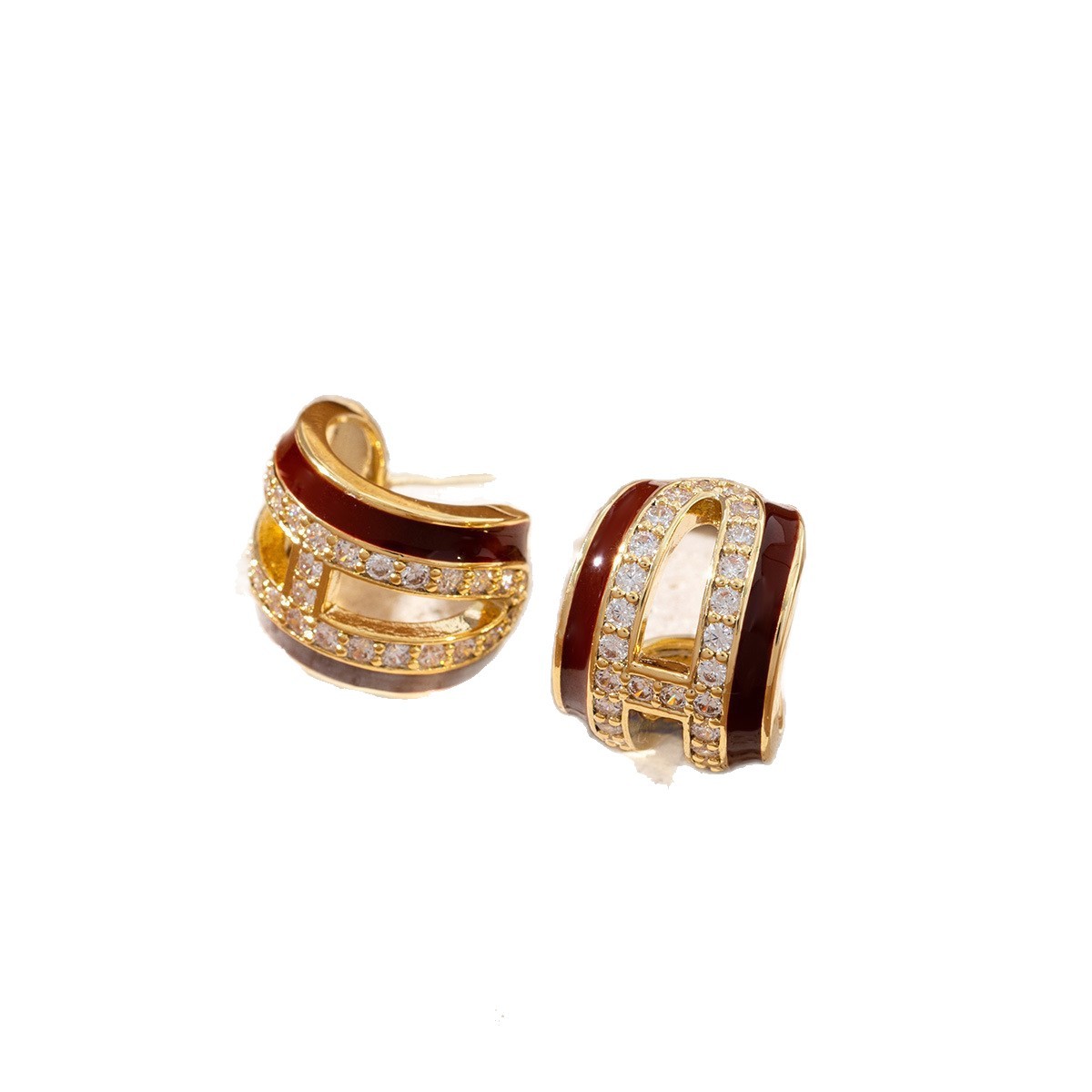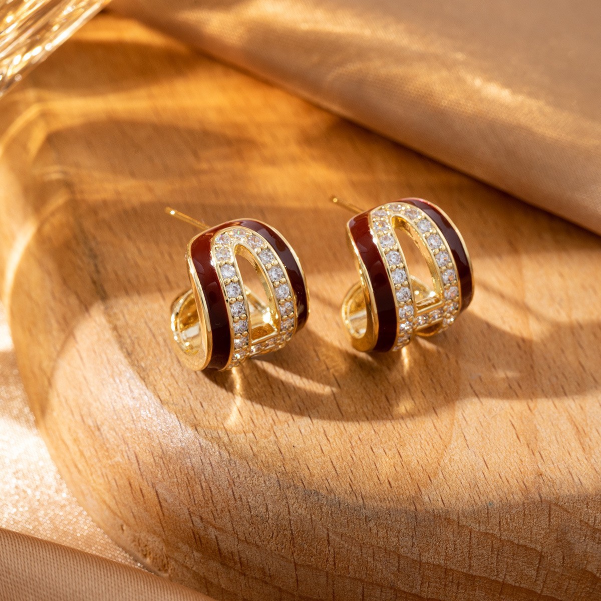 酒红色滴釉镶钻镂空双层C形耳环女轻奢高级感新年超闪耳钉耳圈女