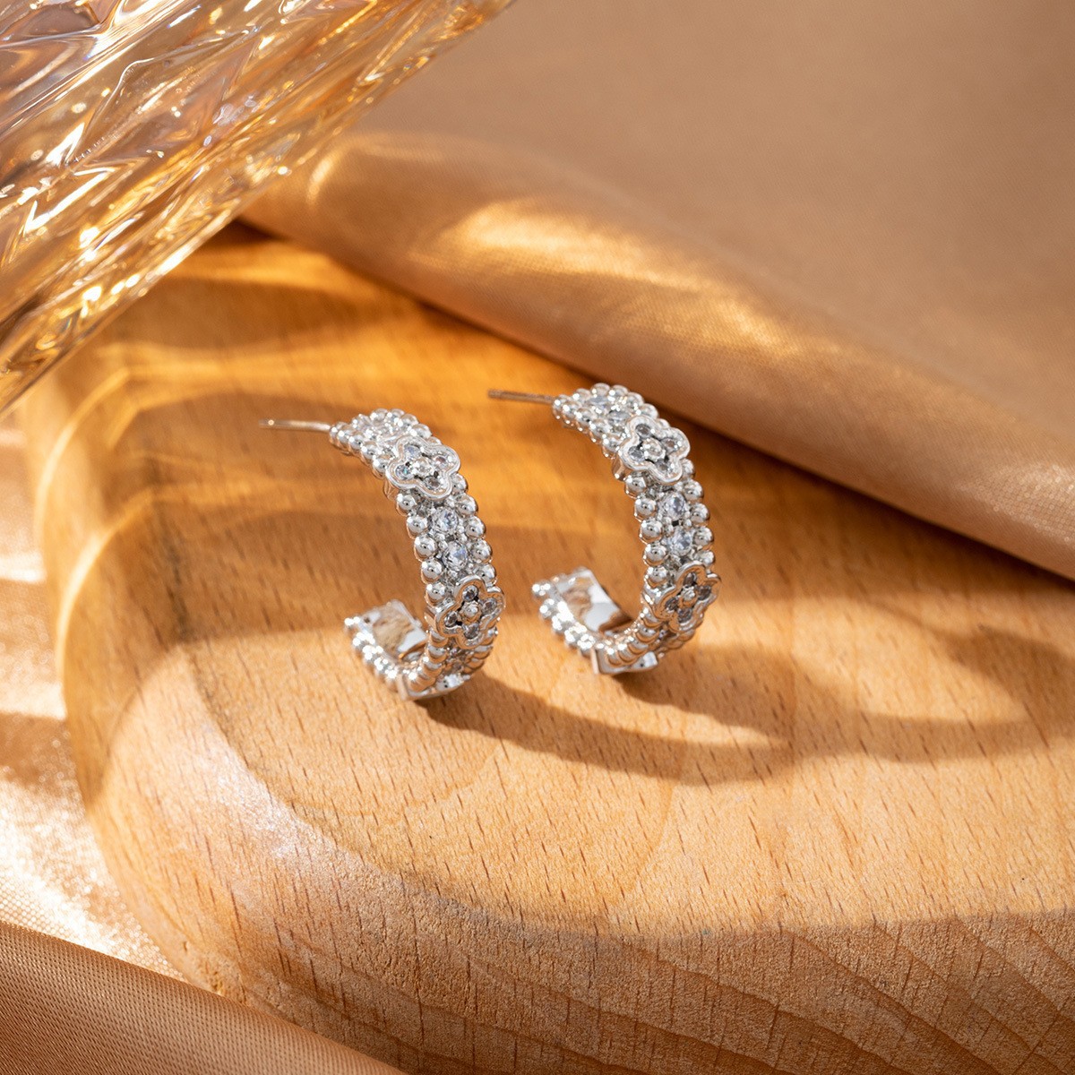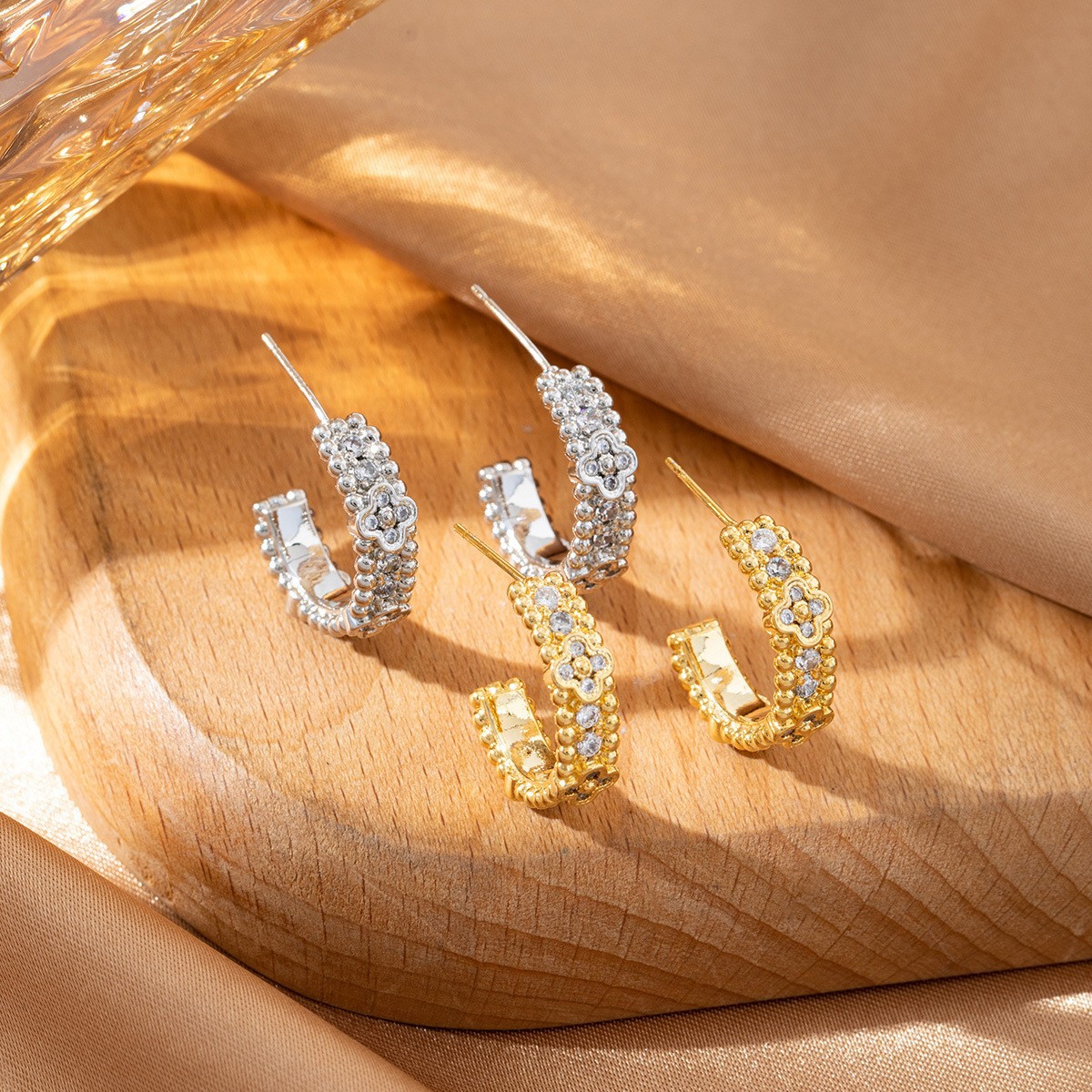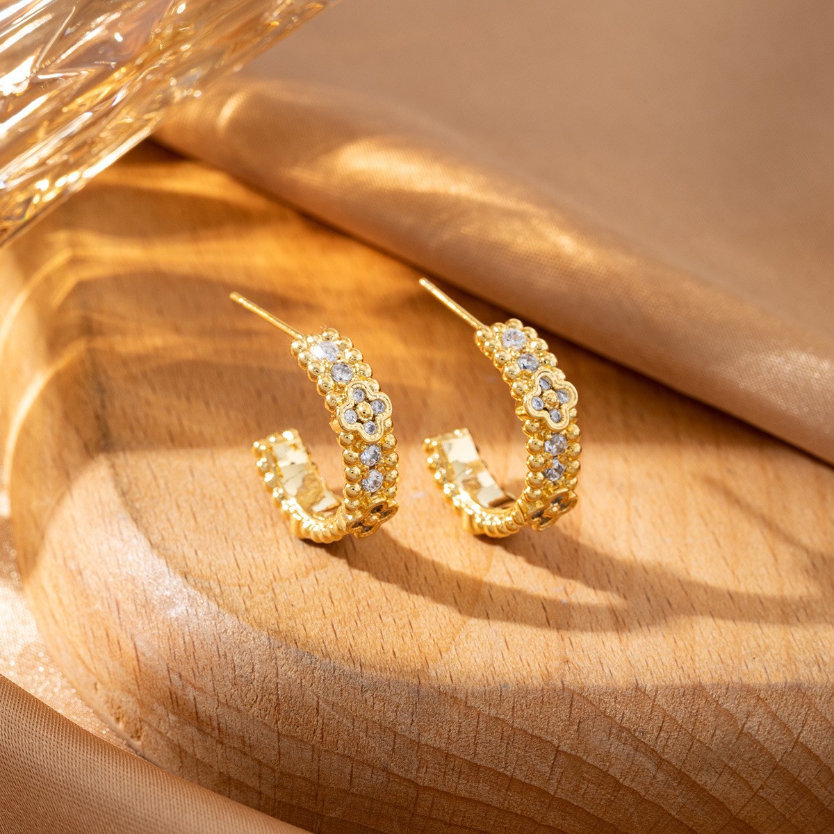 欧美风气质幸运四叶草C形耳环复古镶钻轻奢高级感时尚耳钉耳饰女