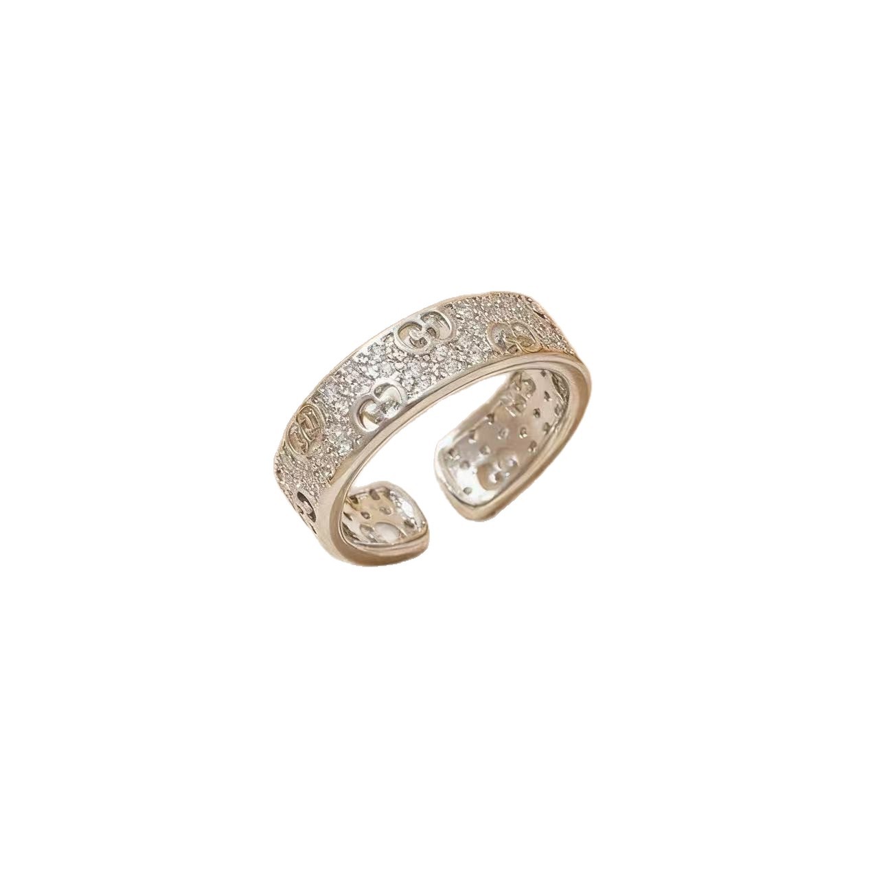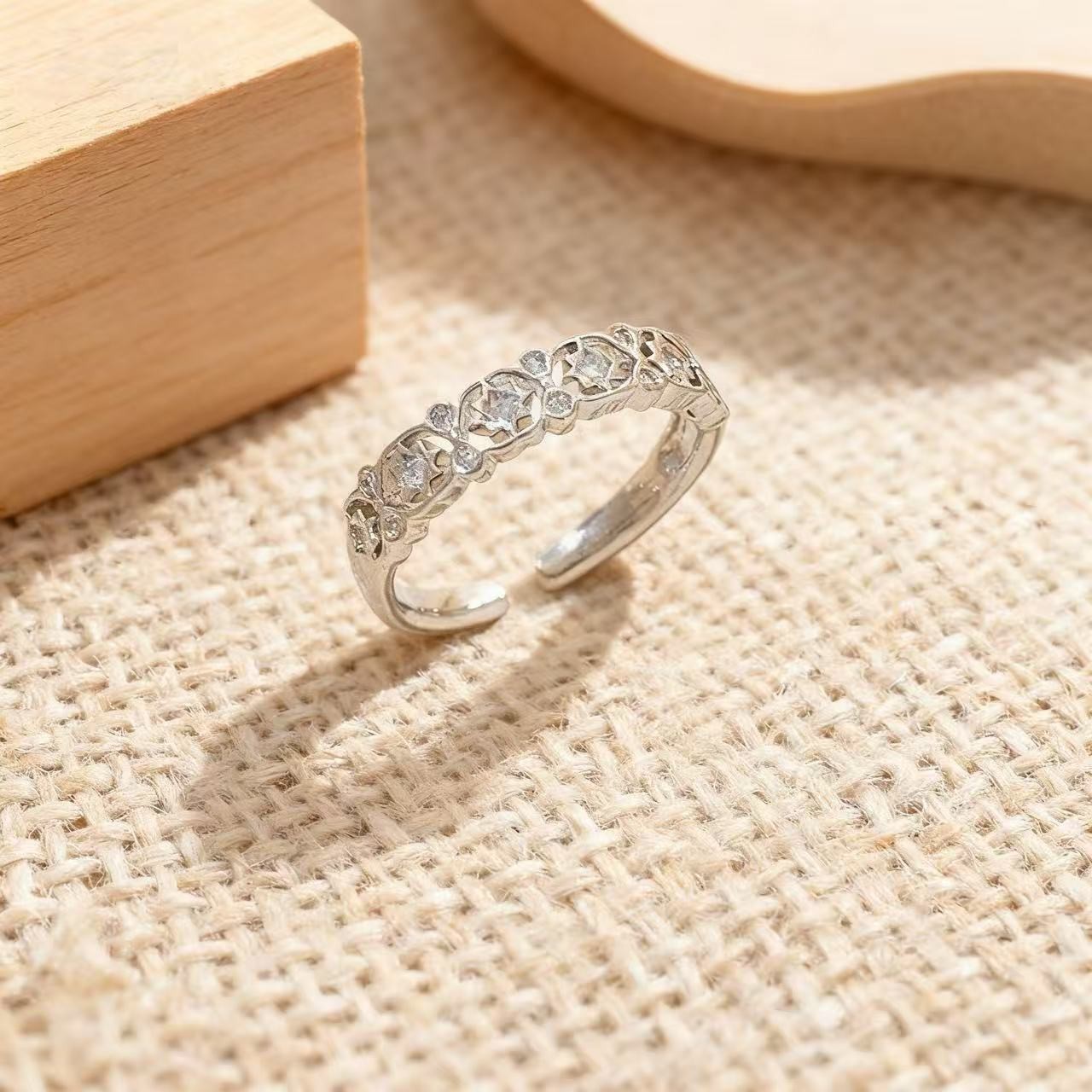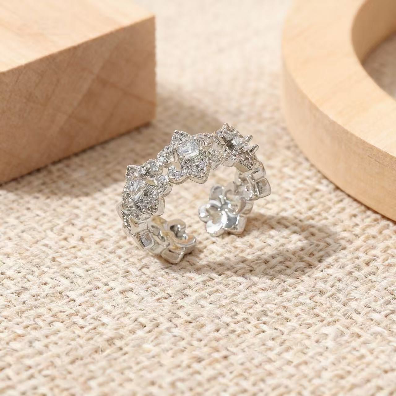 新款中古菱格镶钻戒指女轻奢小众设计可叠戴开口可调节食指指环