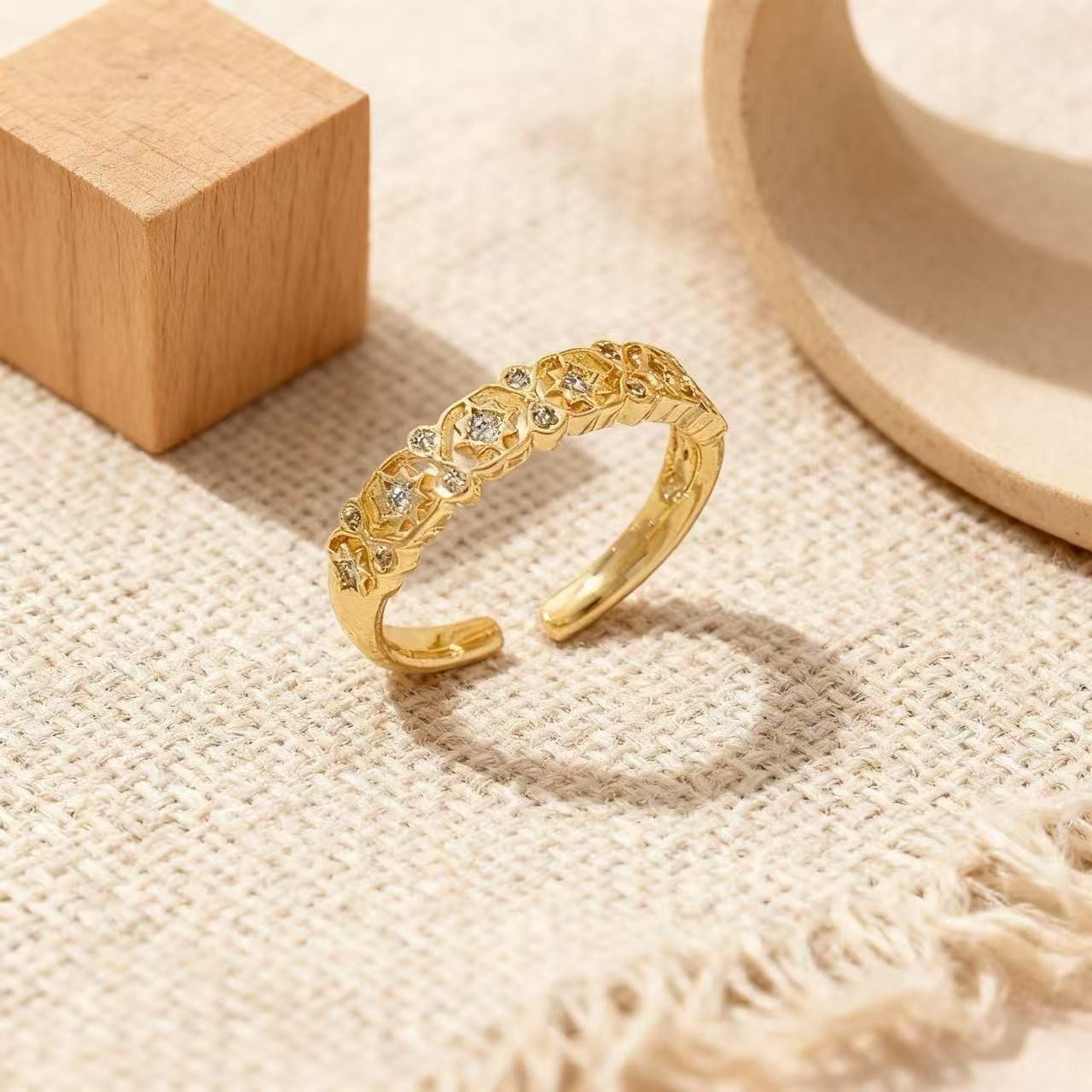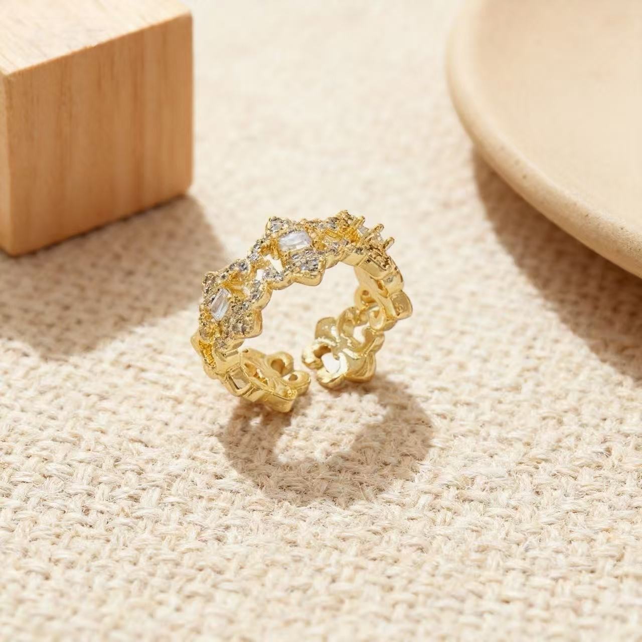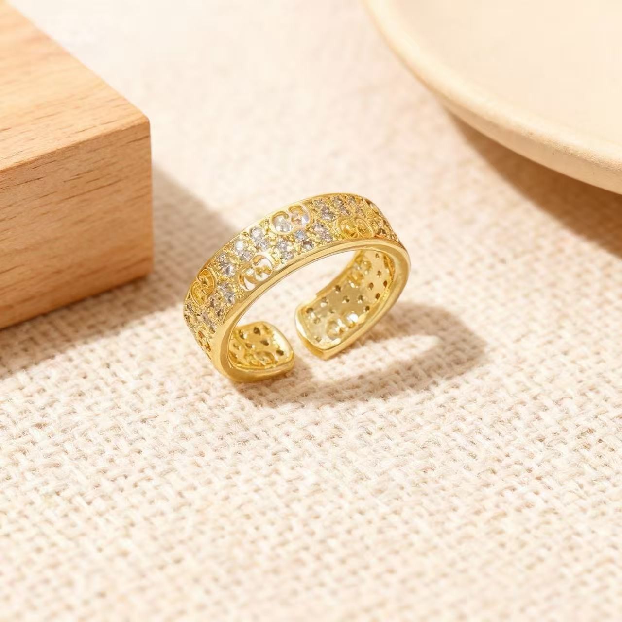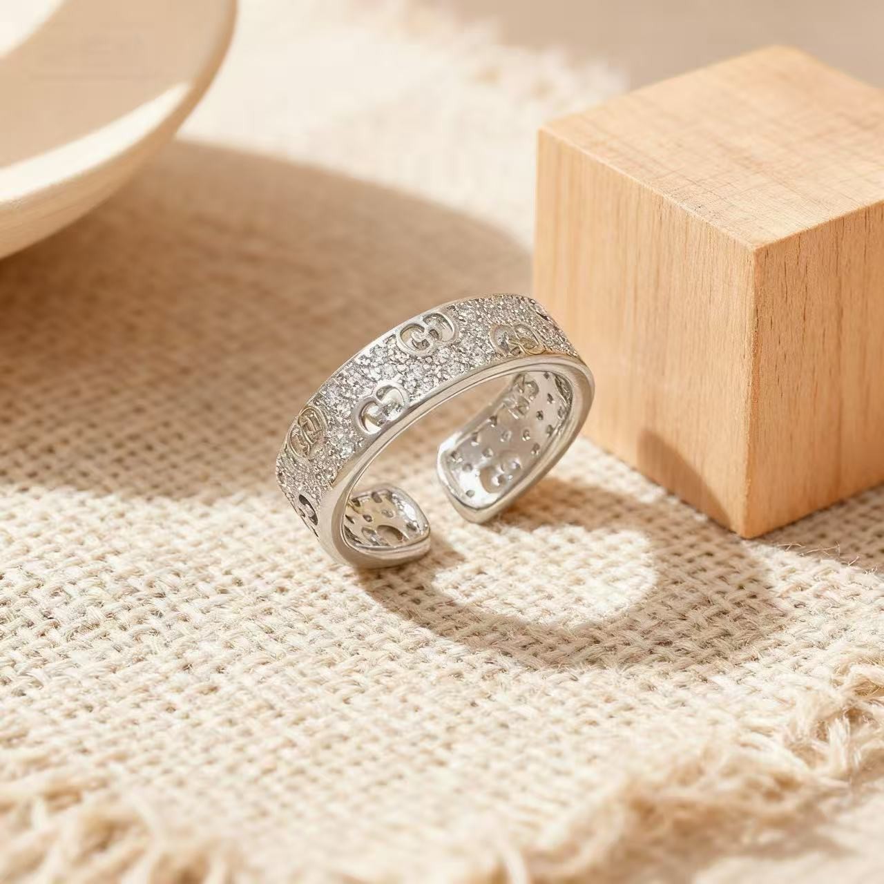 新款中古菱格镶钻戒指女轻奢小众设计可叠戴开口可调节食指指环