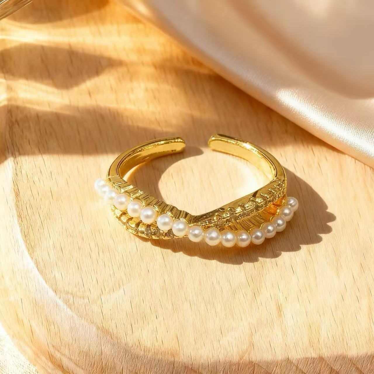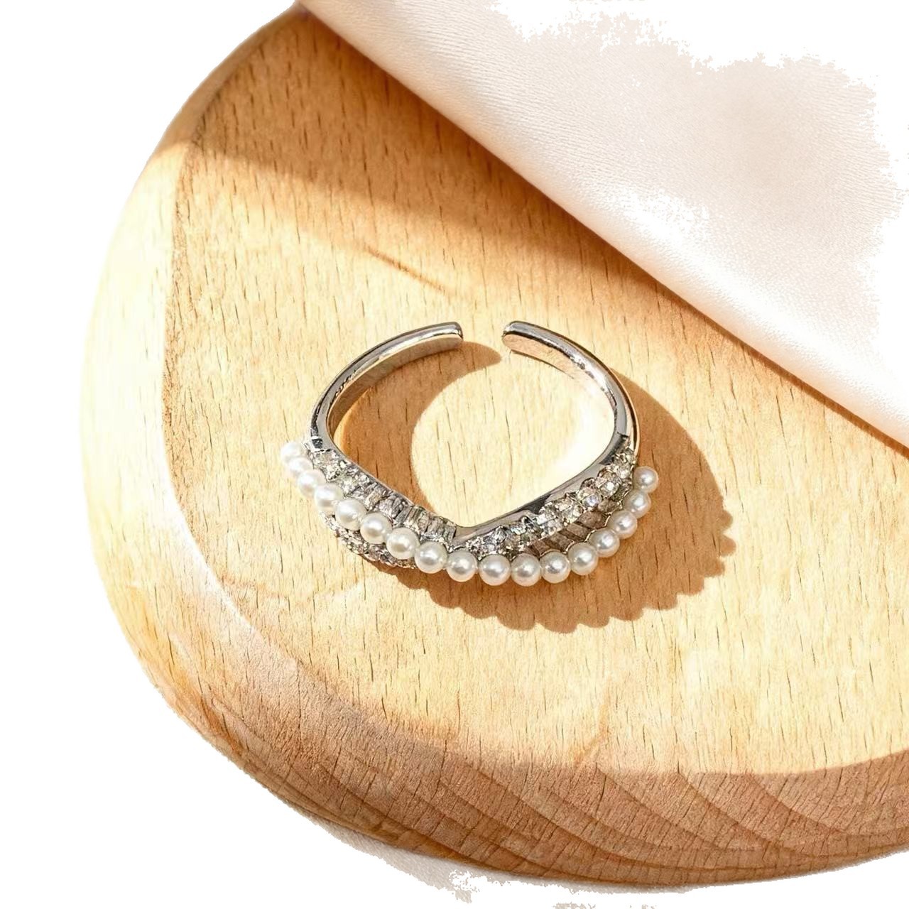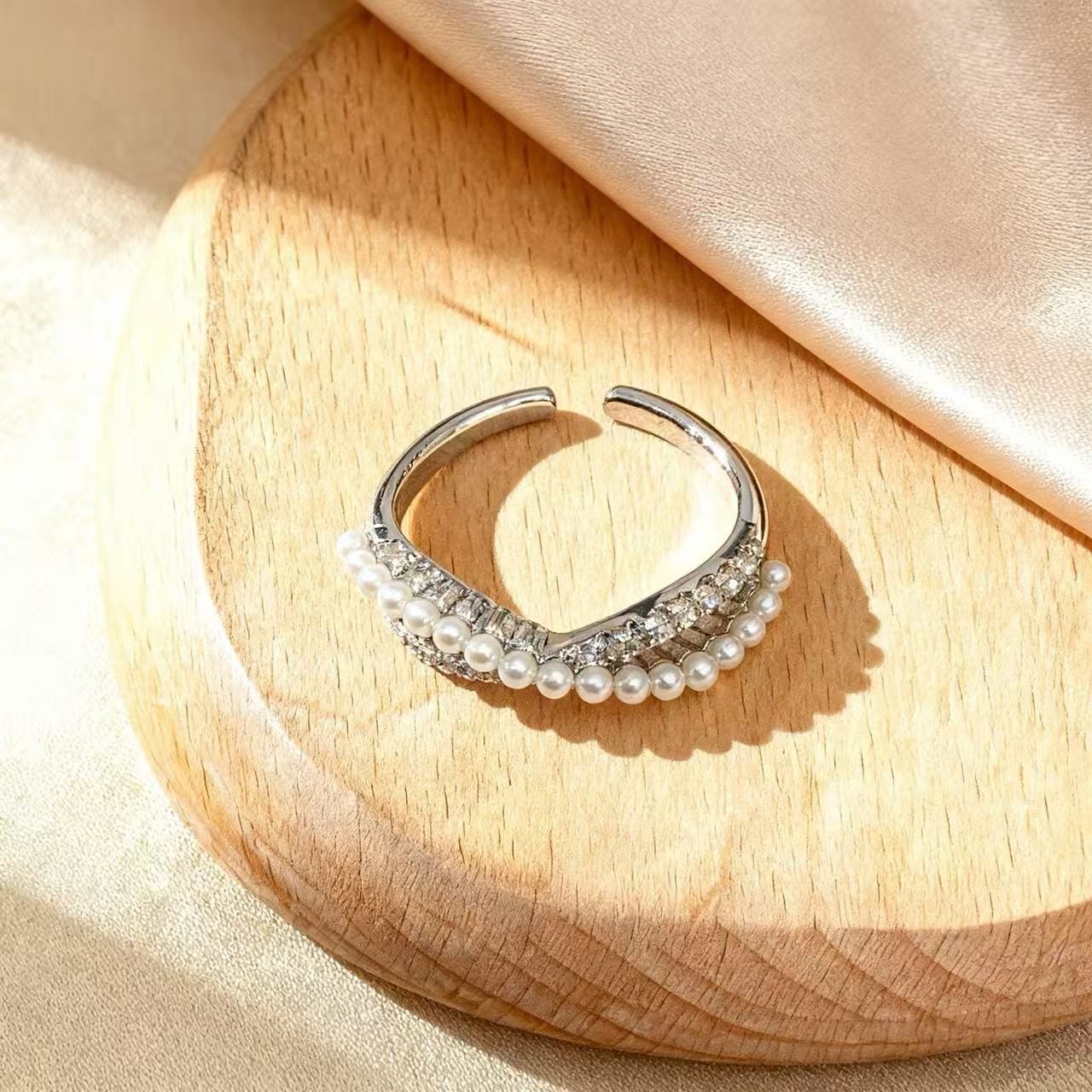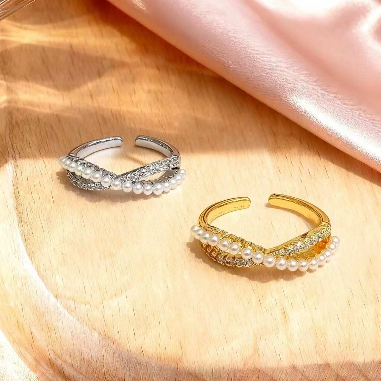 双层珍珠镶钻叠戴戒指女冬季时尚百搭轻奢高级感开口可调节指环