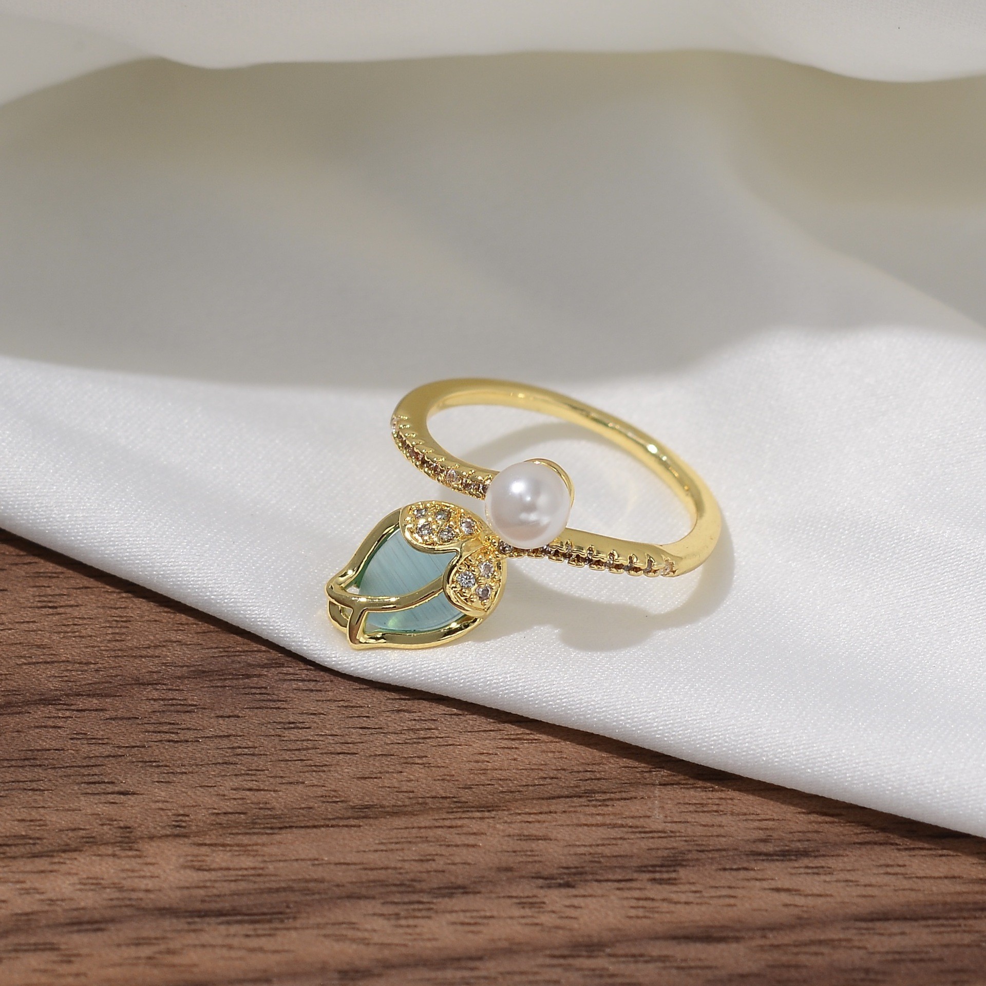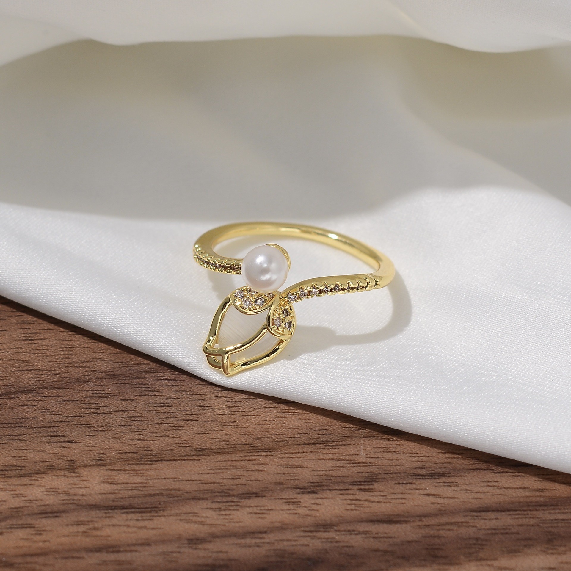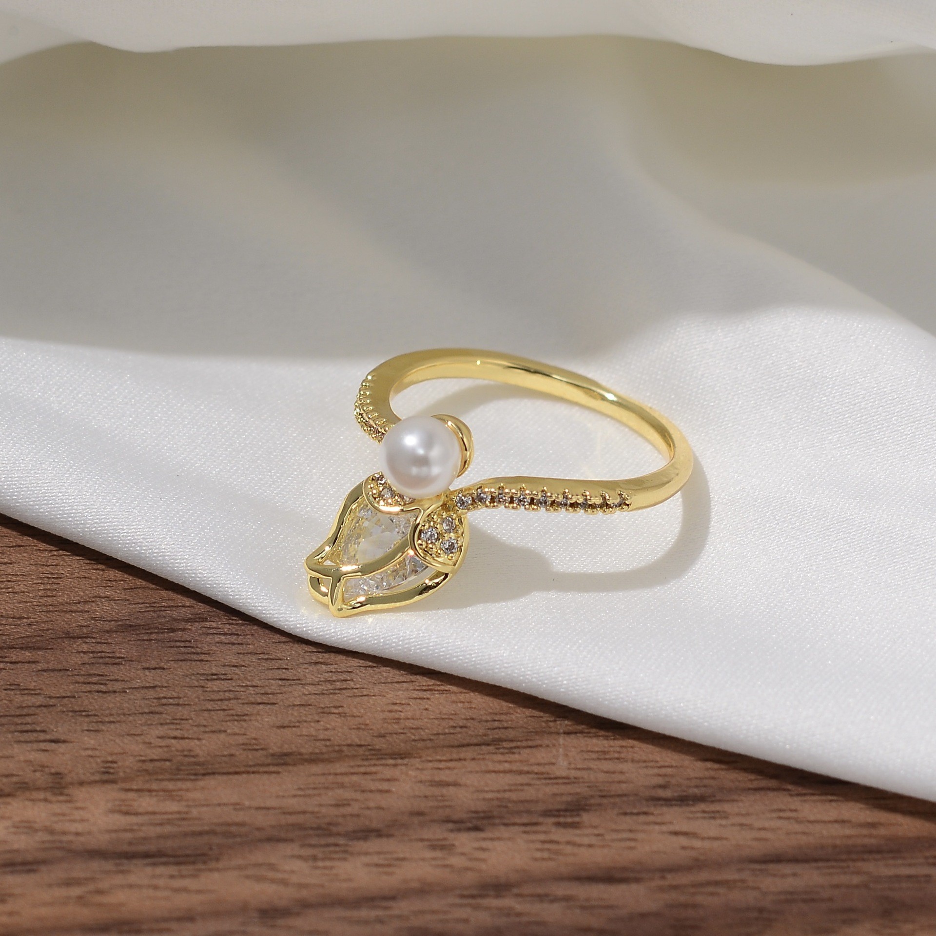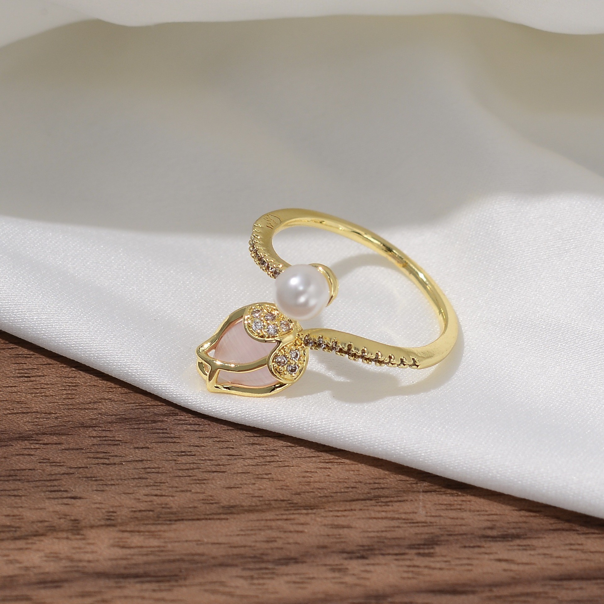 韩版甜美轻奢郁金香珍珠开口戒指高级感ins风花朵锆石可调节指环