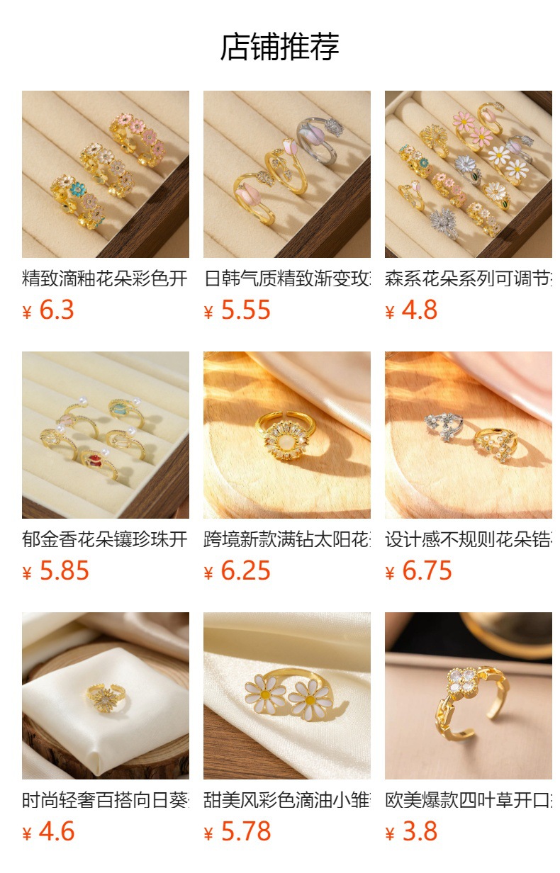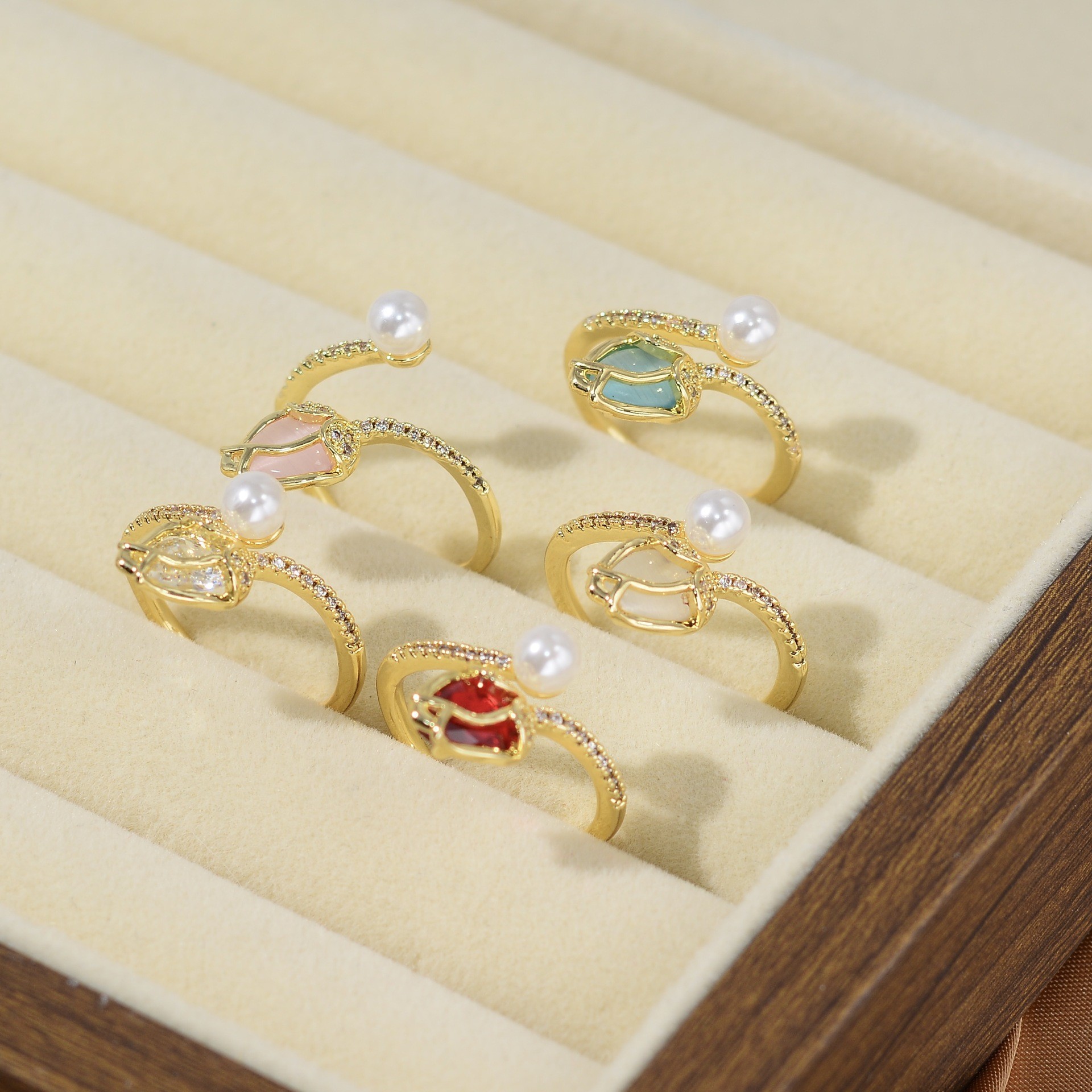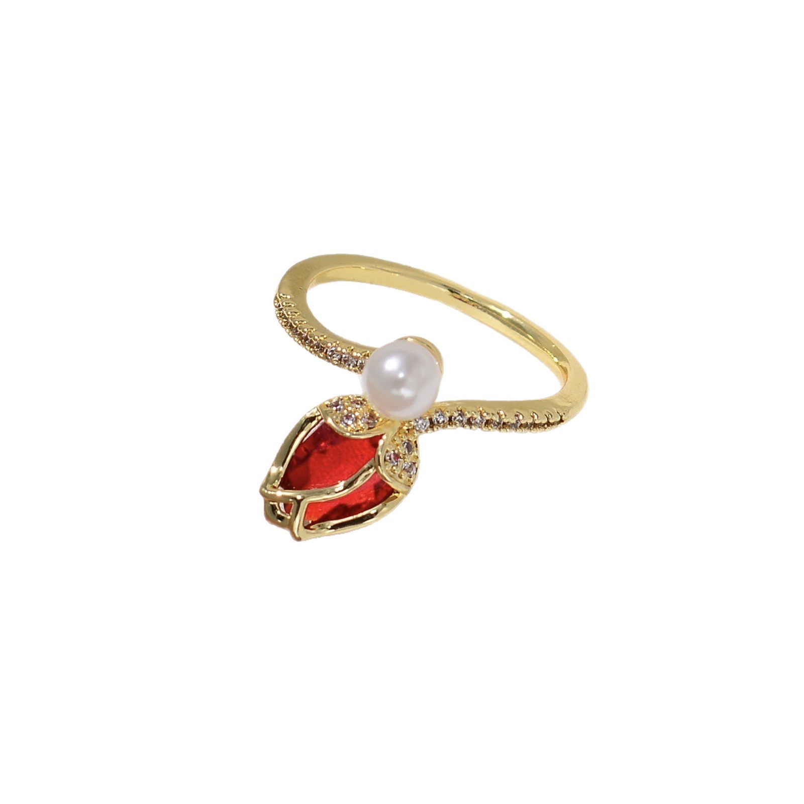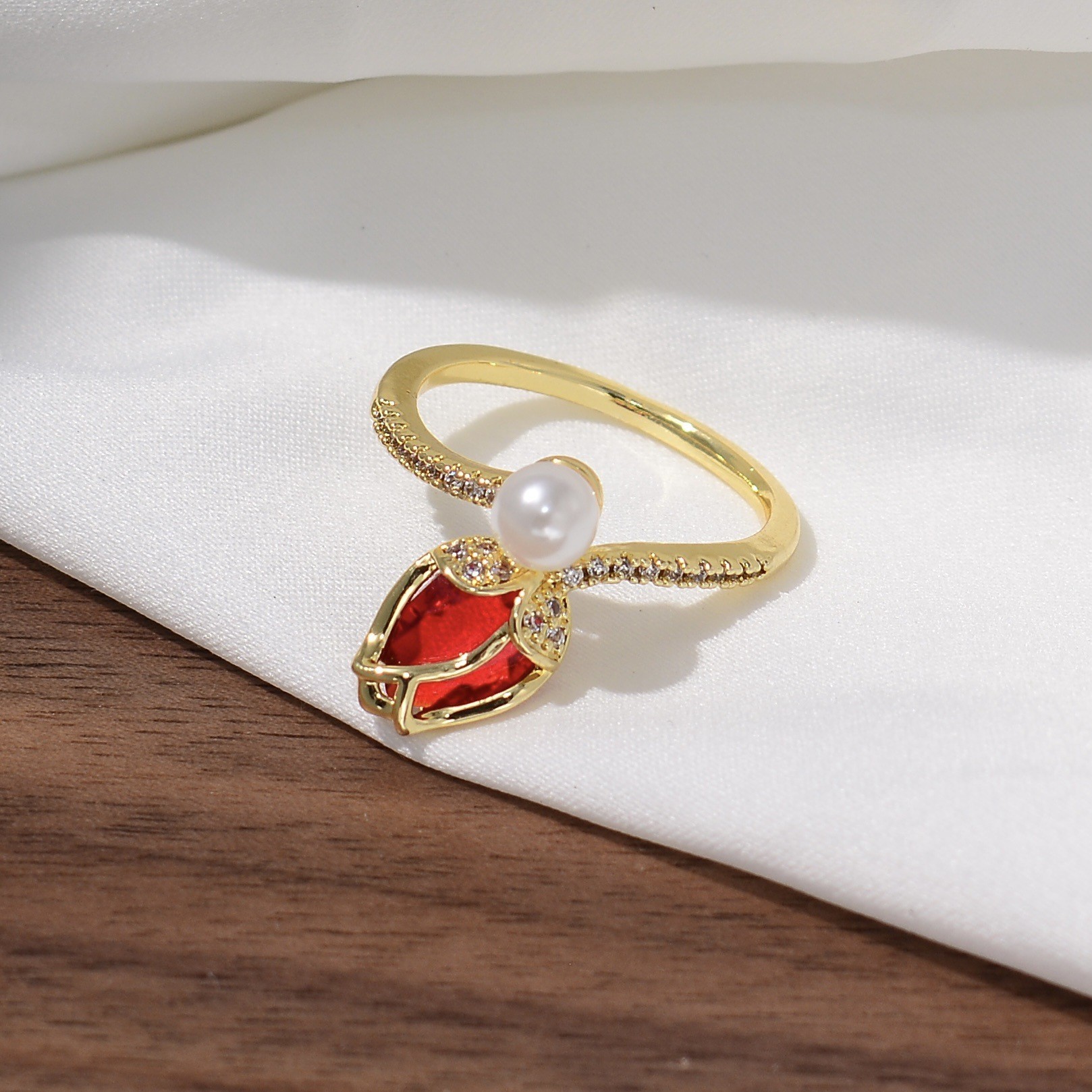 韩版甜美轻奢郁金香珍珠开口戒指高级感ins风花朵锆石可调节指环