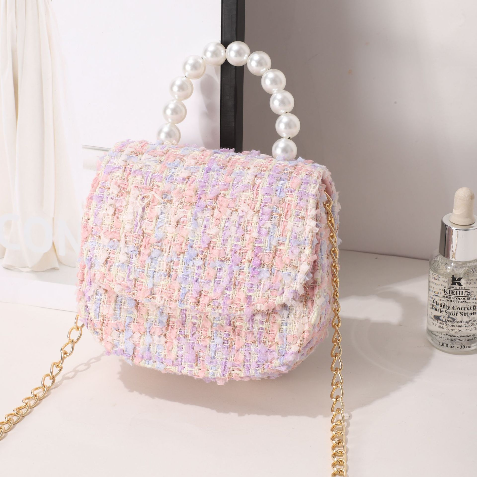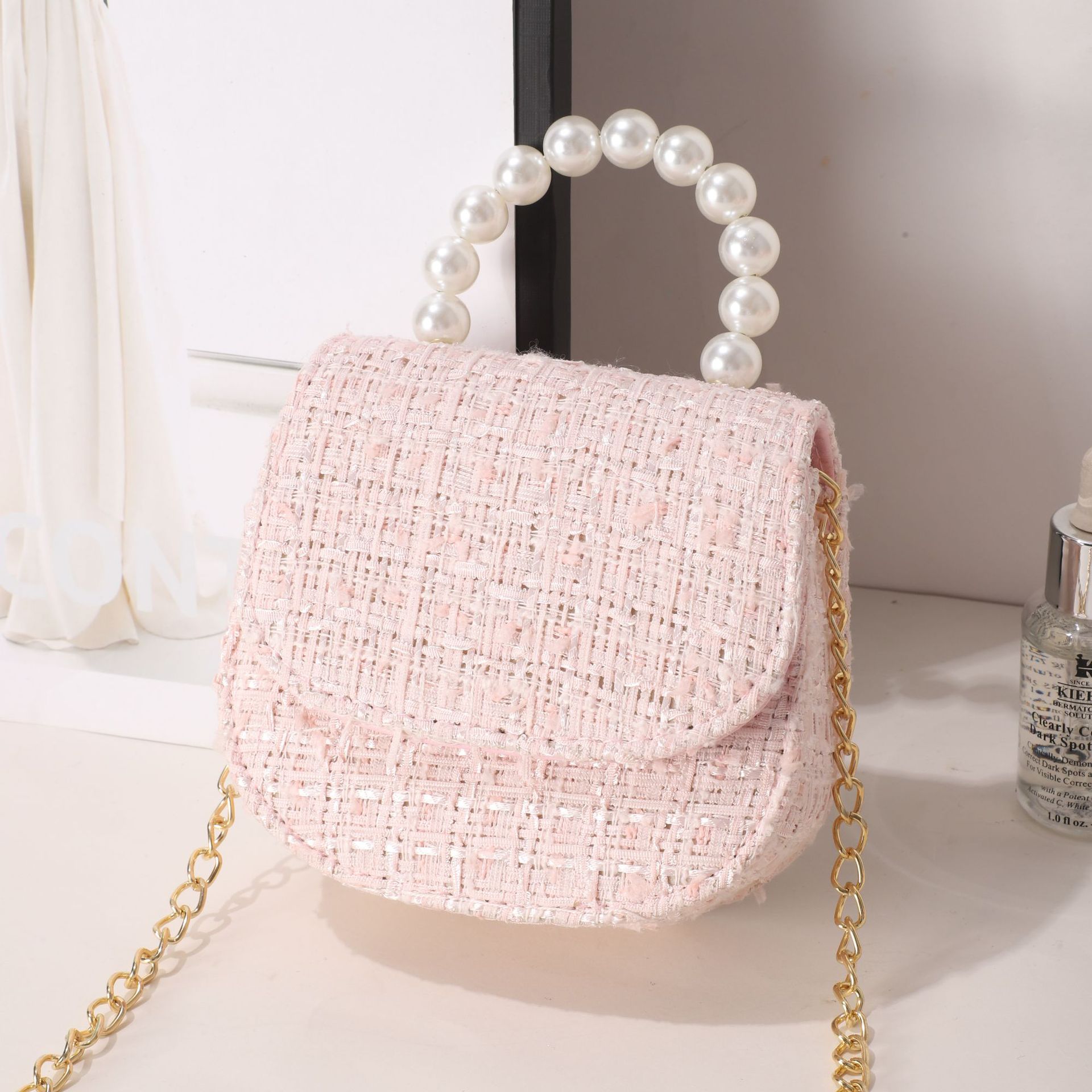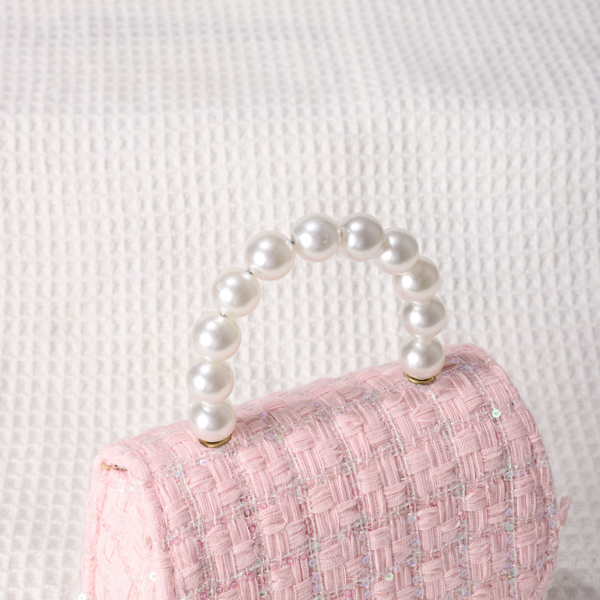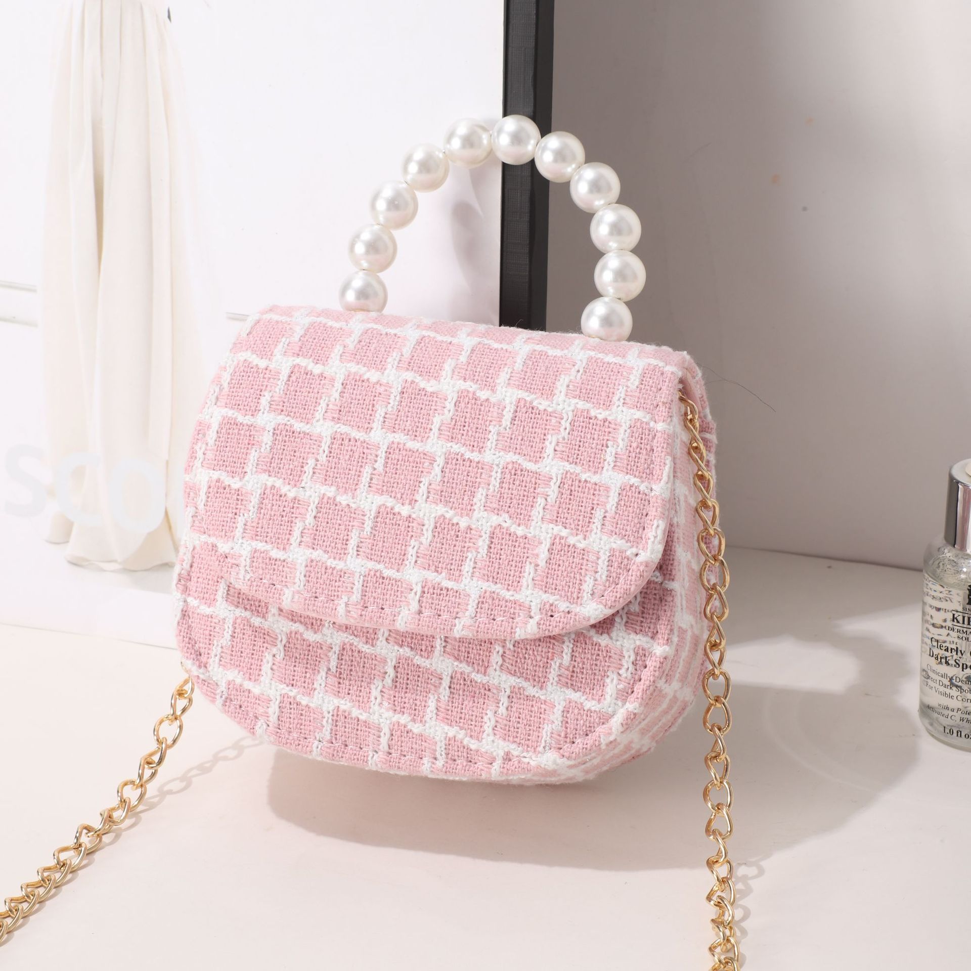 女式包包小皮包秋冬格子小香风女士斜挎包小众设计珍珠手提小方包