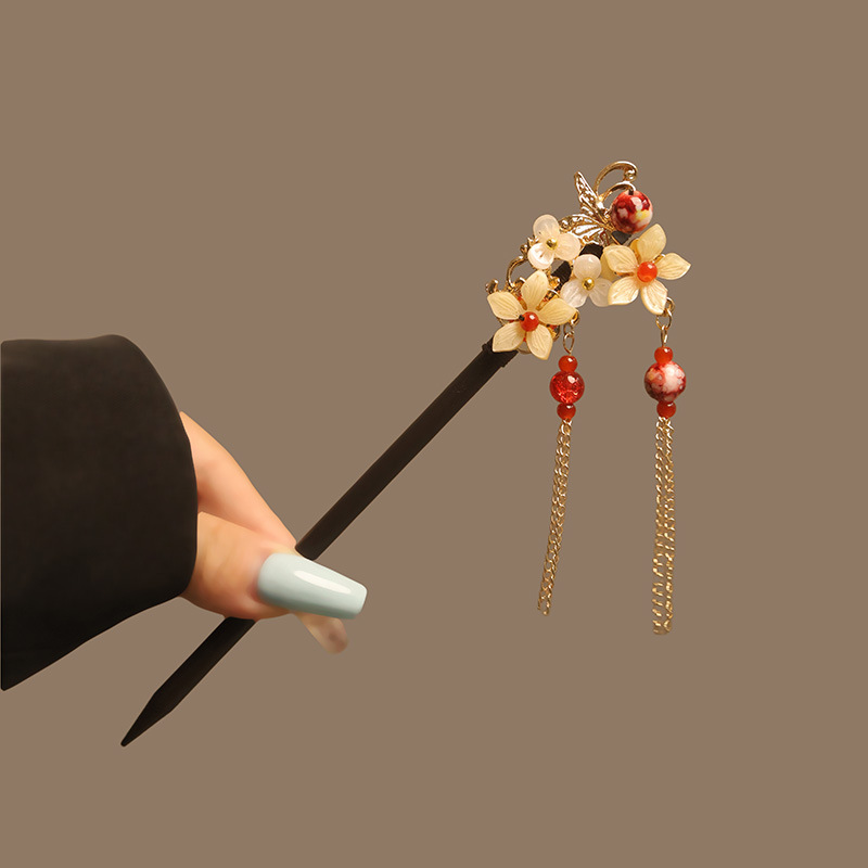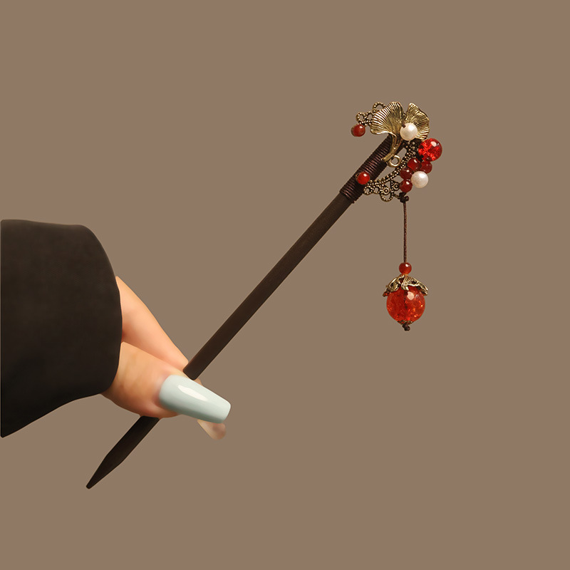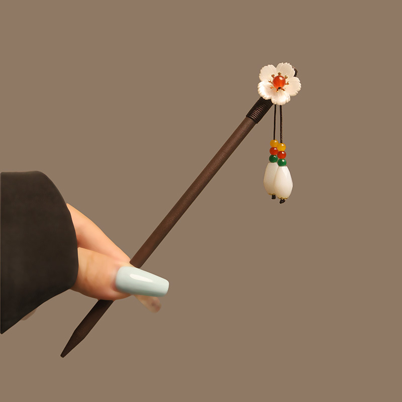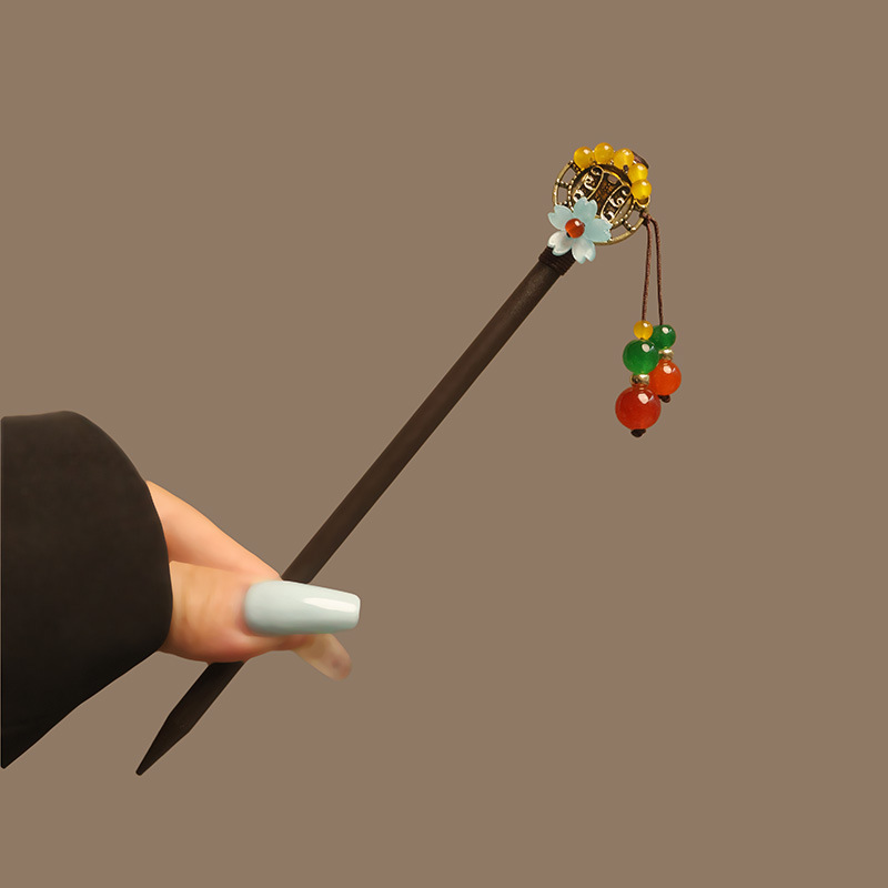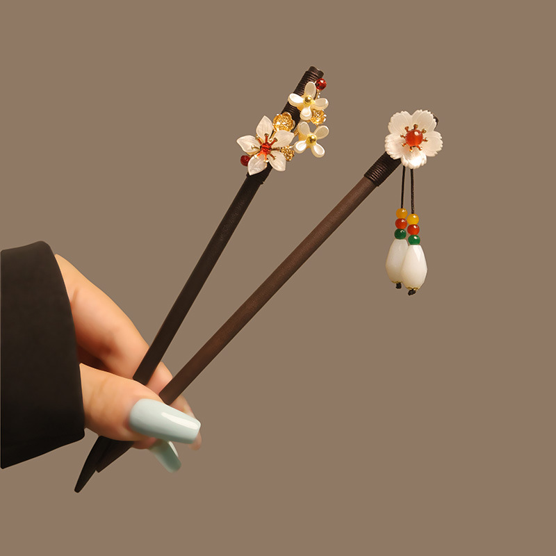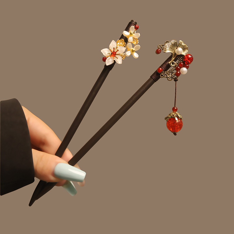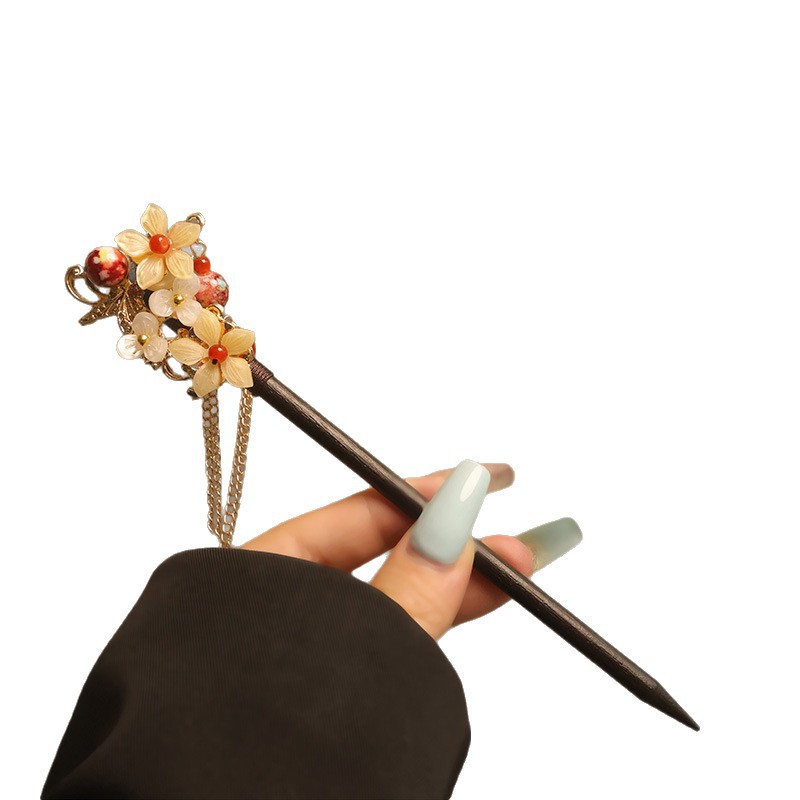 宫廷风木簪黑檀木发簪古风汉服花朵复古流苏步摇簪子古装丸子盘发
