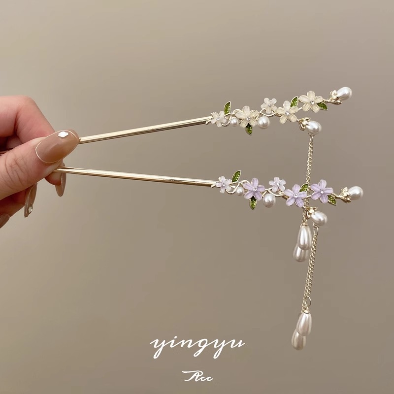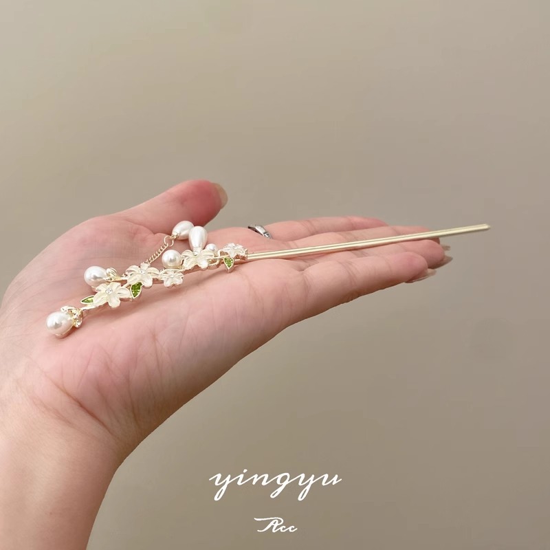 精致高级感花朵珍珠发簪女新中式旗袍盘发簪子古风流苏步摇发钗