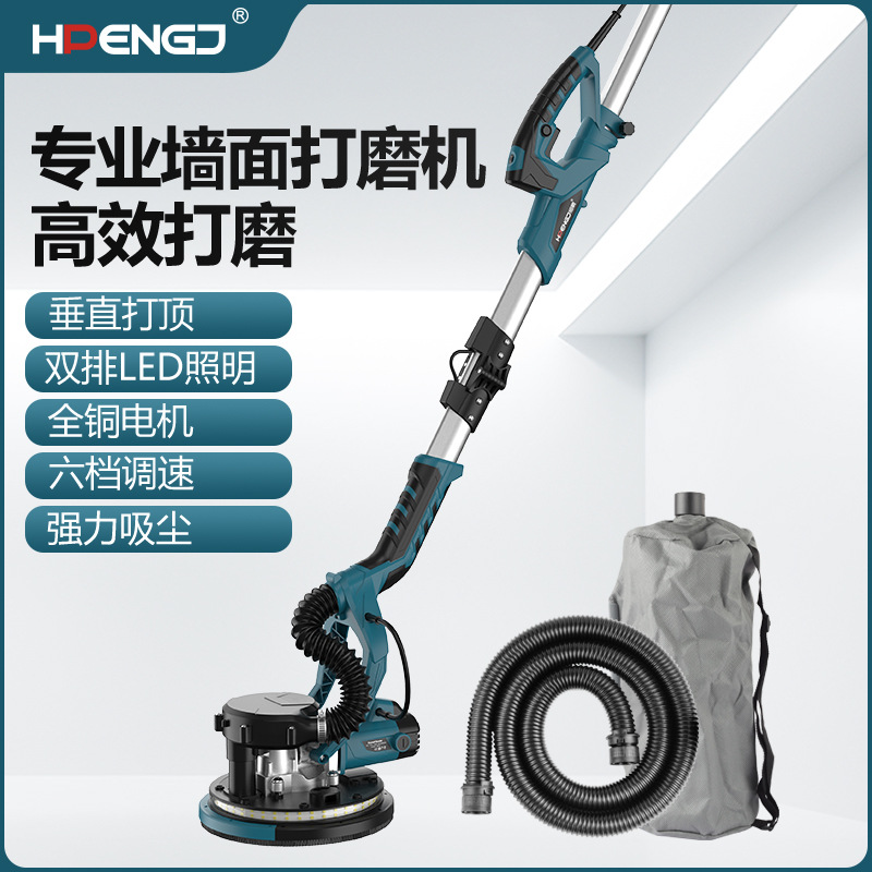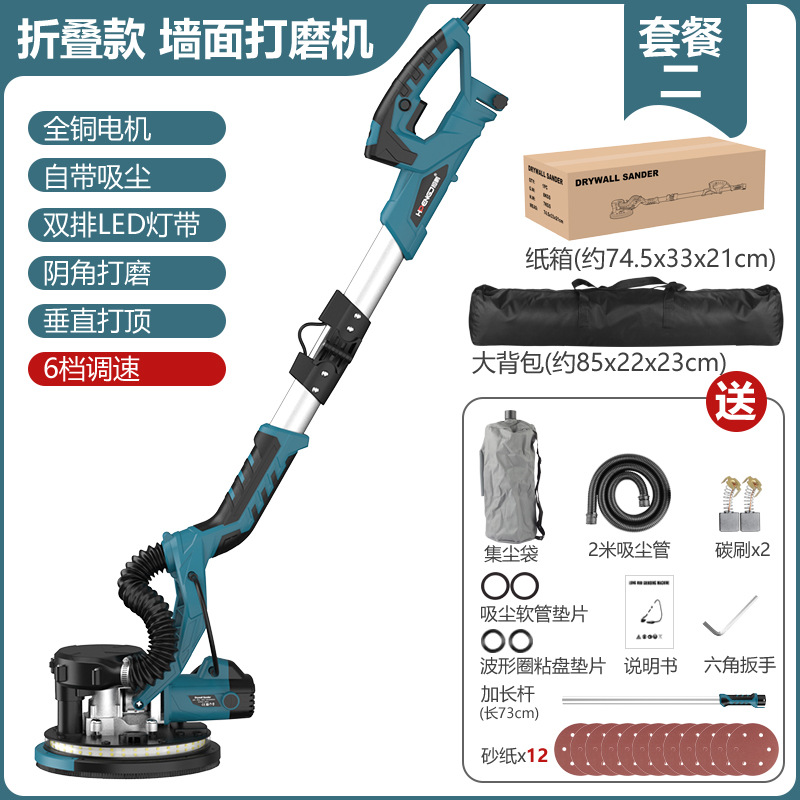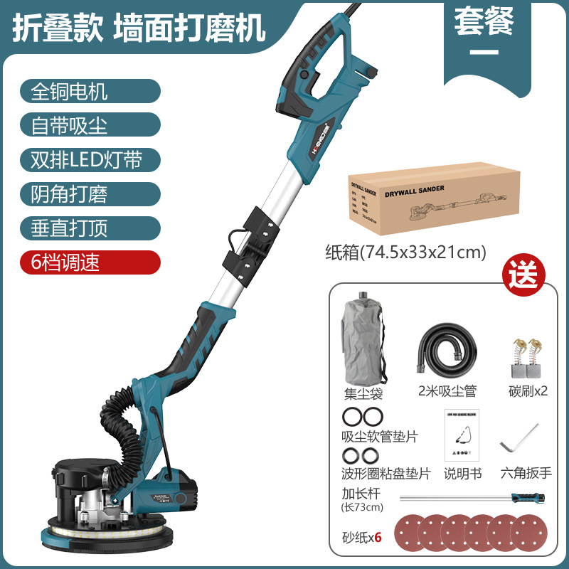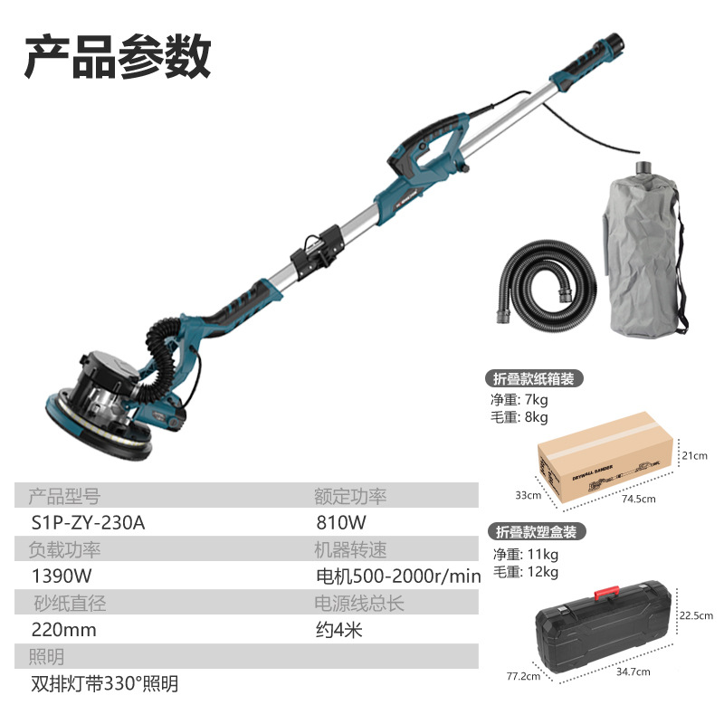 9寸225折叠墙壁打磨机墙面腻子打磨机砂纸机自吸尘双灯长杆磨墙机