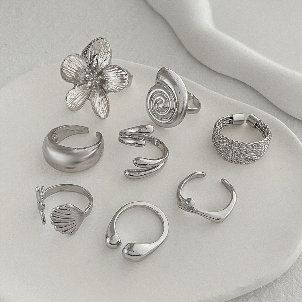 欧美跨境海洋度假风海螺扇贝壳戒指套装 ins风金属花朵开口指环女