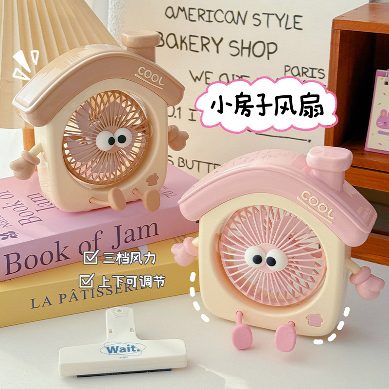 爆款创意ins可爱小屋桌面风扇USB充电三档调速台式小电扇迷你便携