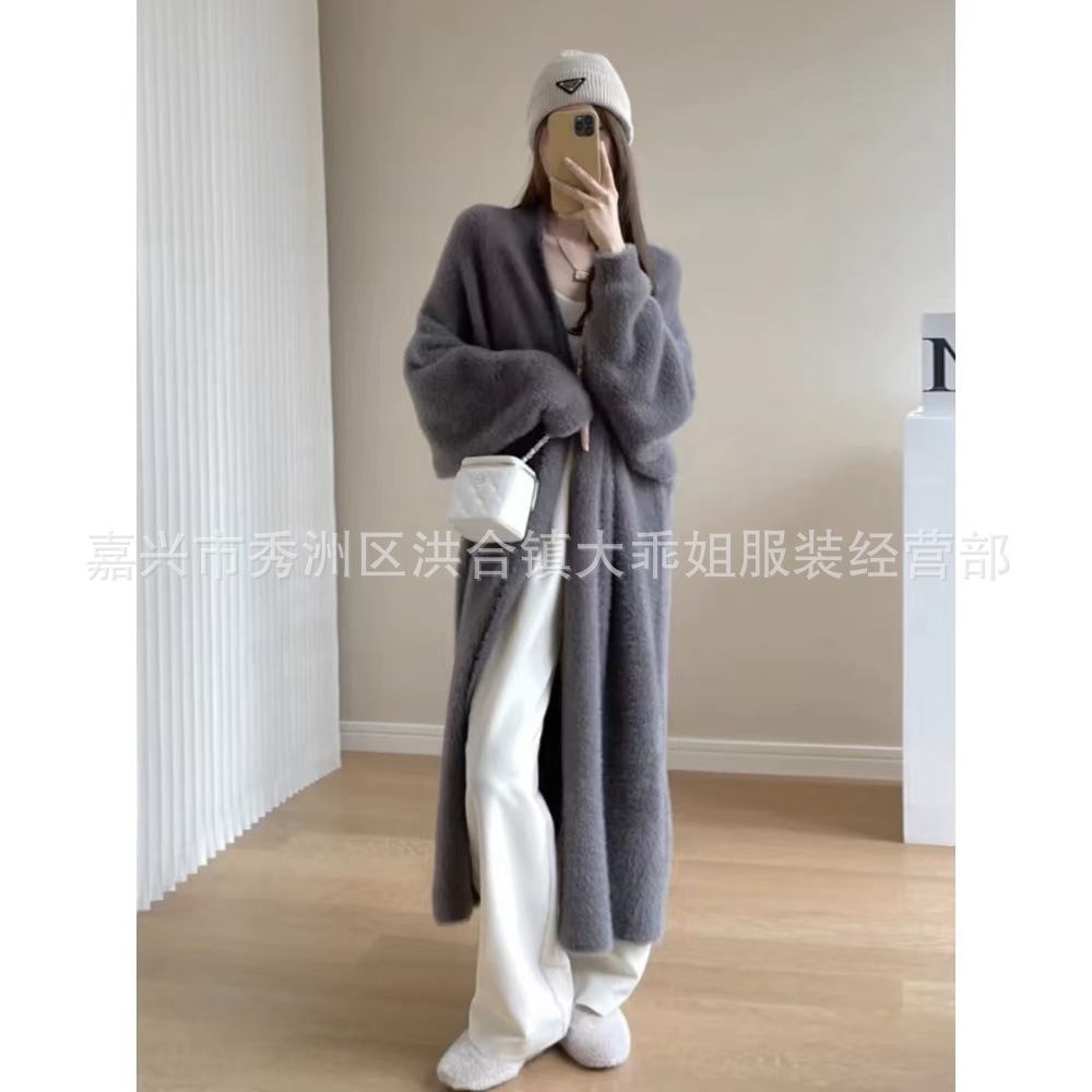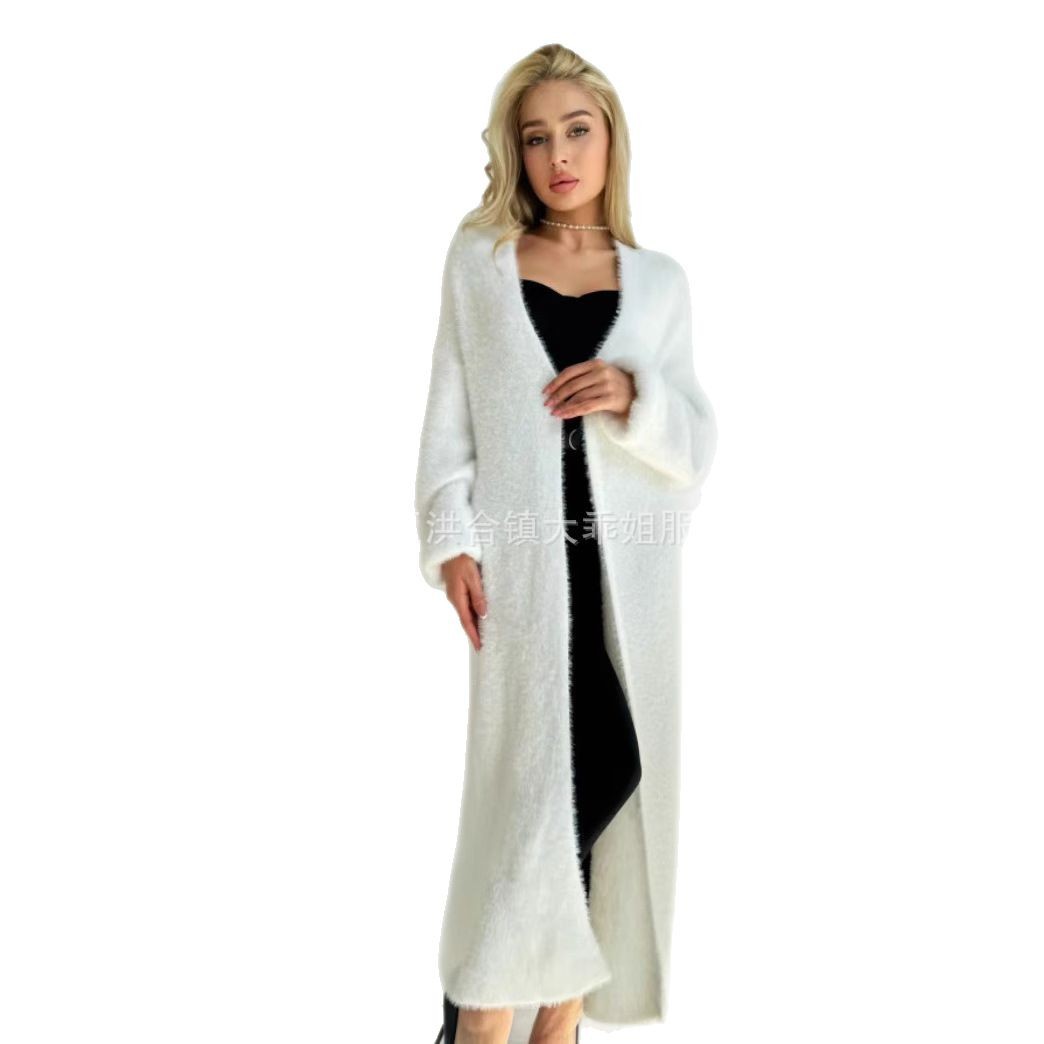 白色水貂绒开衫毛衣长款宽松慵懒风针织衫外套女春秋纯色外搭大衣