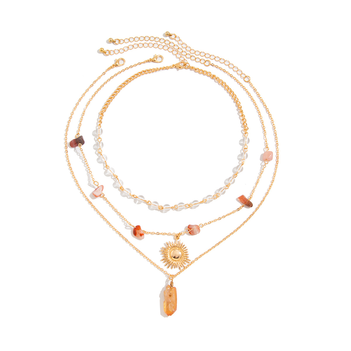 欧美跨境ins度假风不规则碎石项链女 叠戴金属太阳花吊坠锁骨项饰