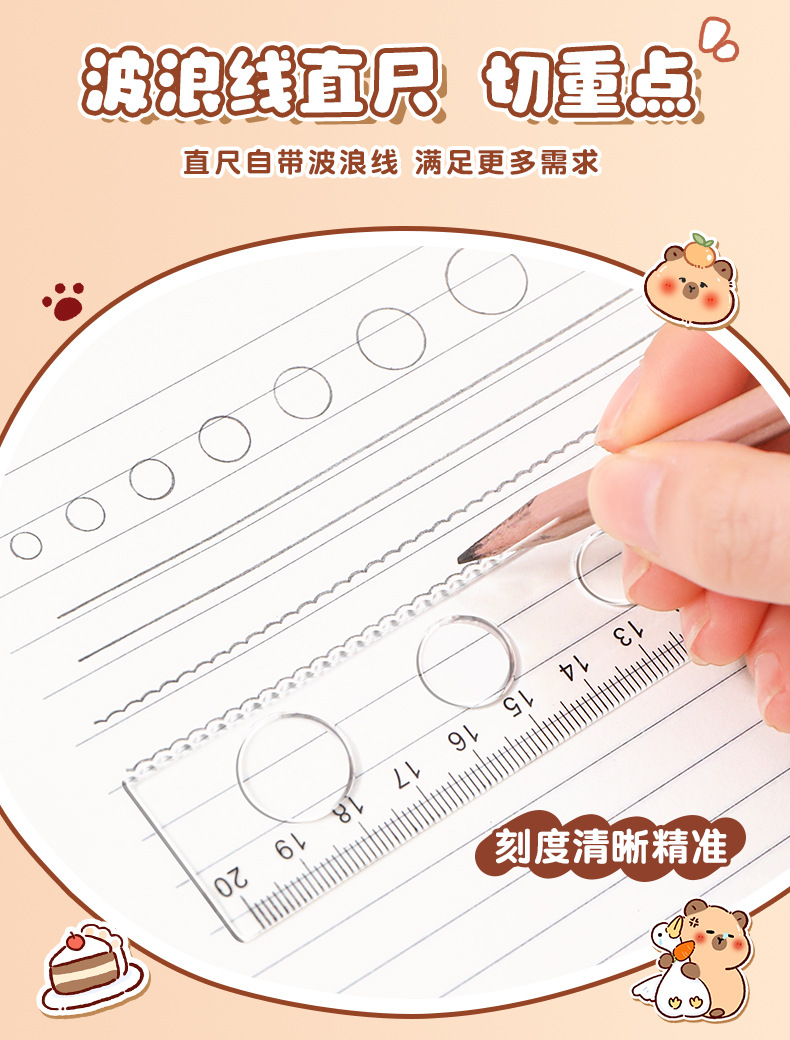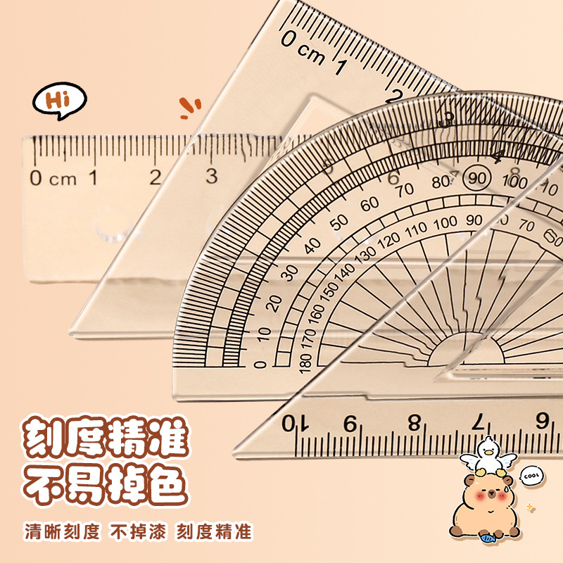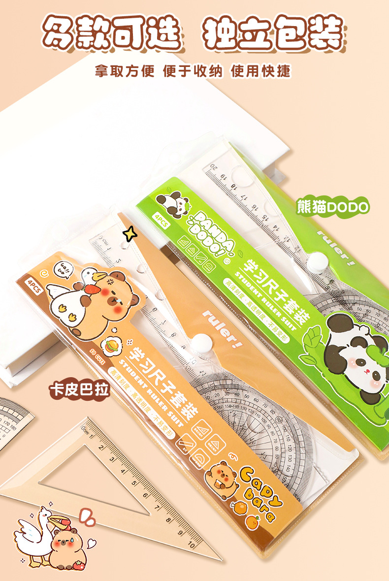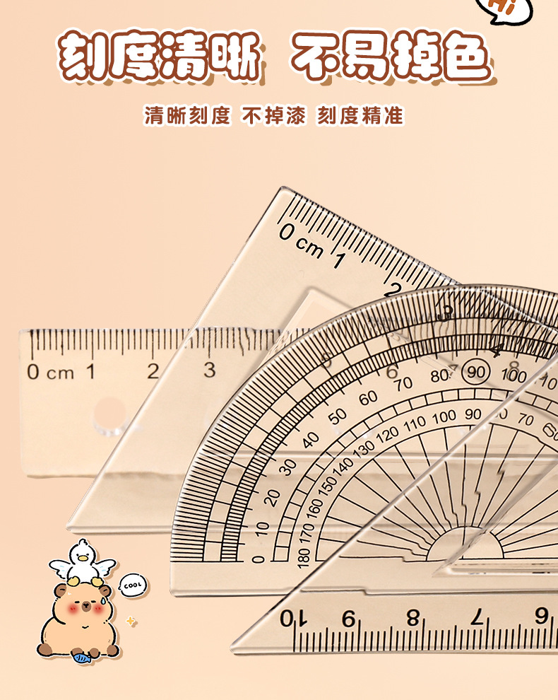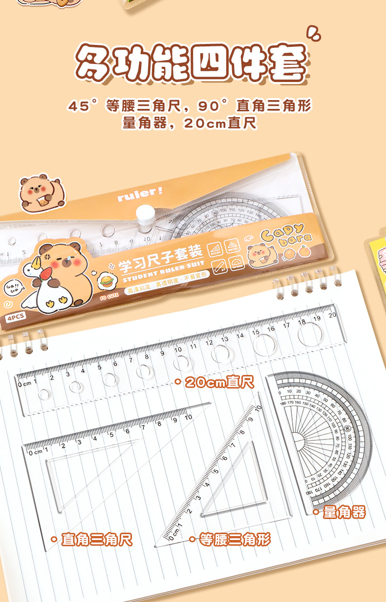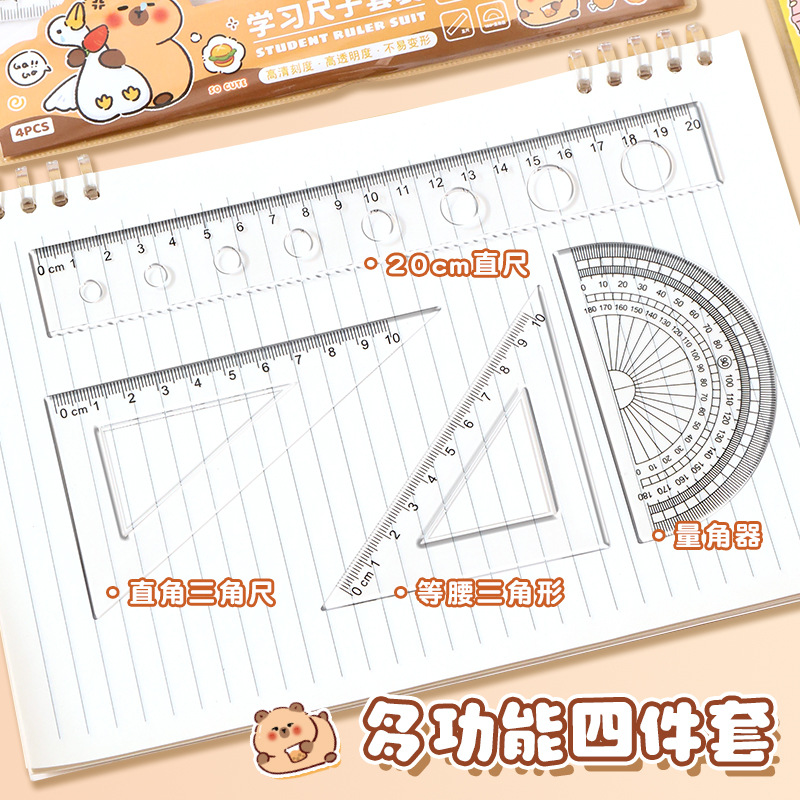 卡皮巴拉尺子套装小学生可爱套尺卡通儿童直尺三角板量角器四件套