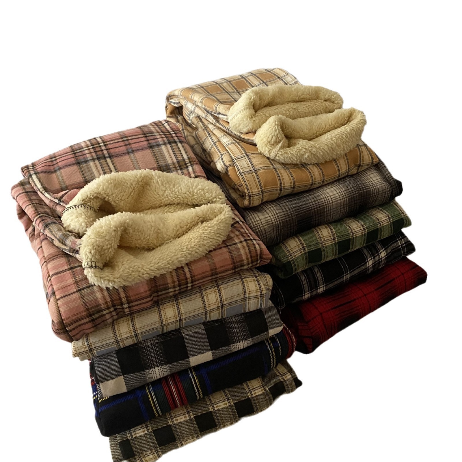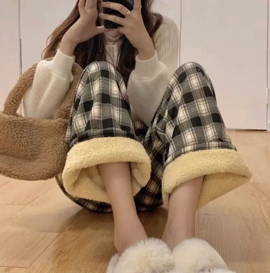加绒羊羔绒格子裤小个子阔腿裤秋冬女款女高腰直筒裤女垂坠感裤子