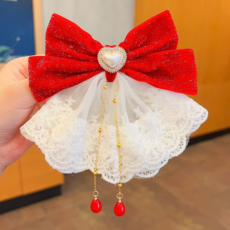 新年毛绒发夹女儿童中国风红色流苏对夹古风汉服百搭发卡过年头饰