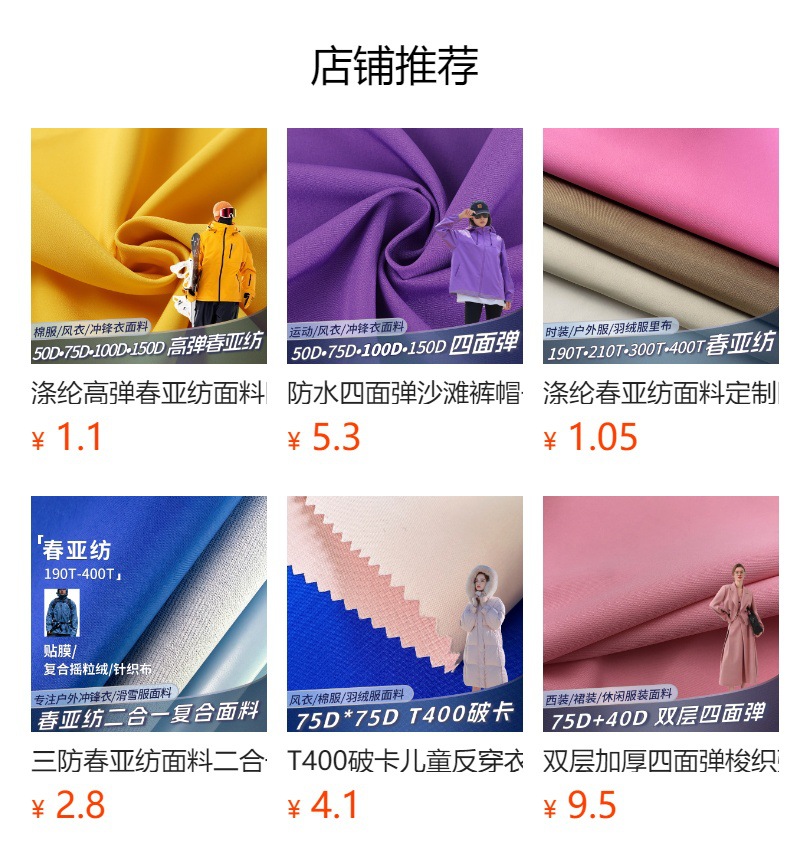 | 190t polyester taffeta(190T涤塔夫) | USD $0.18 | 77218 m available |