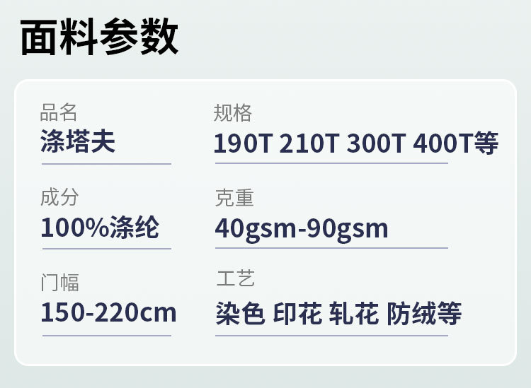| 210T涤塔夫 | USD $0.2 | 92838 m available |