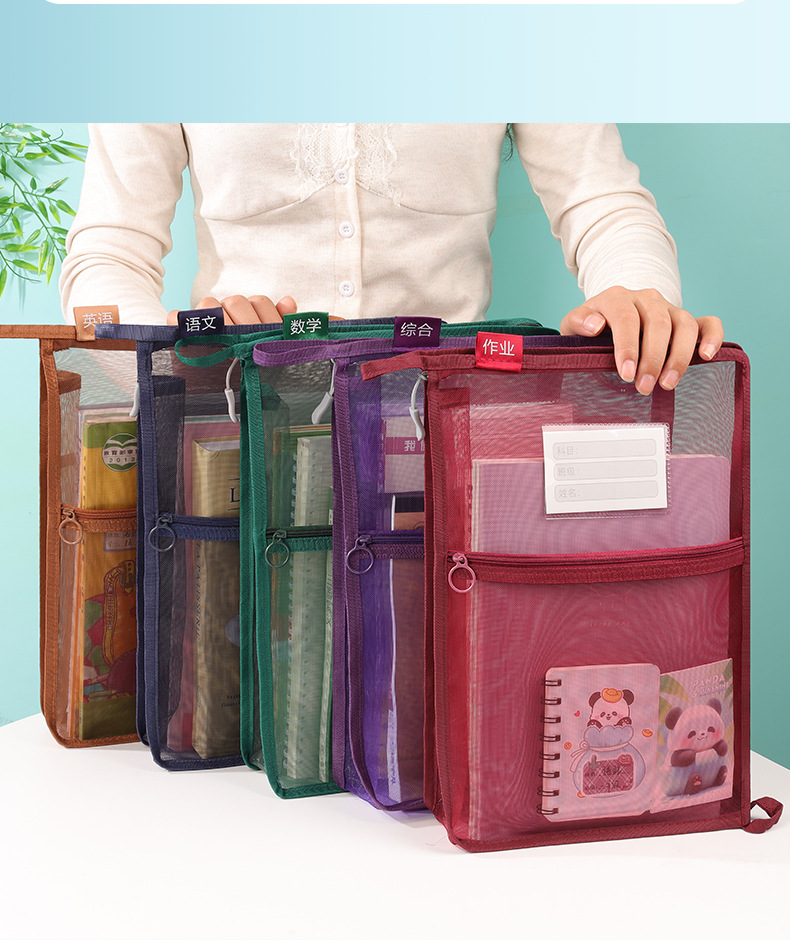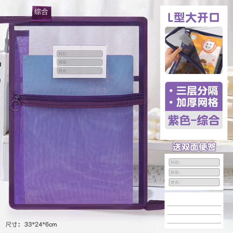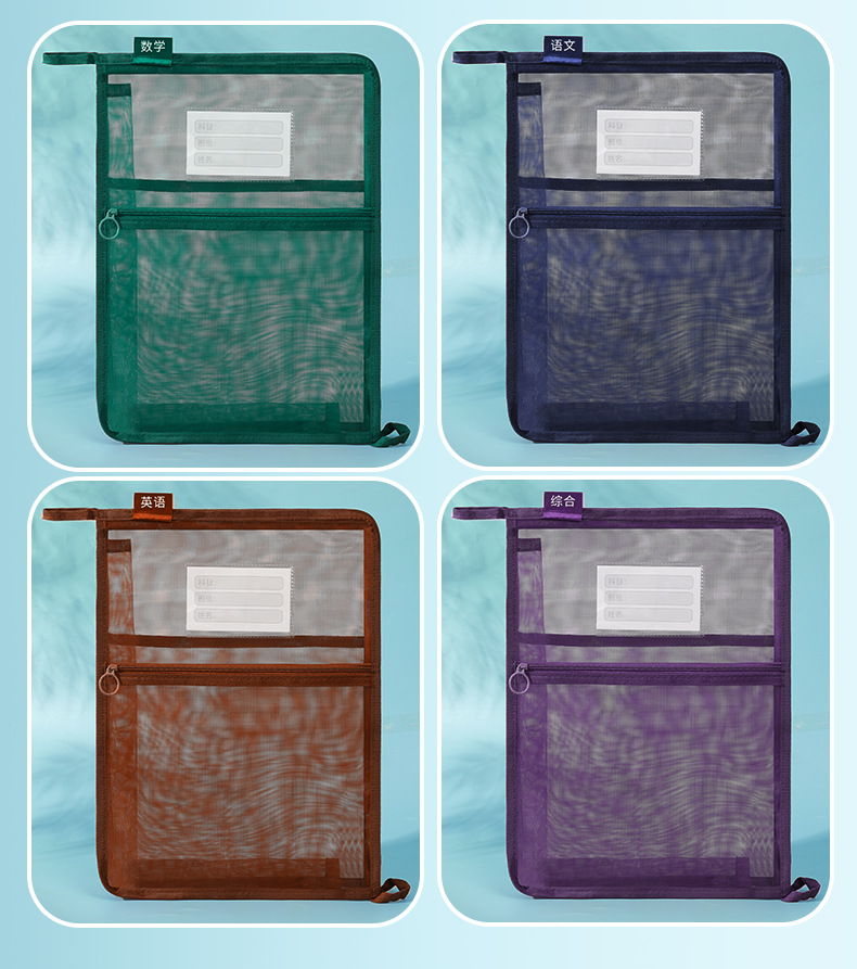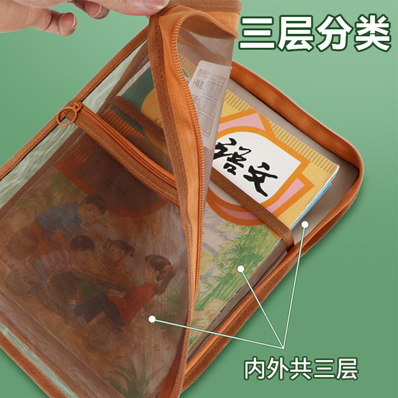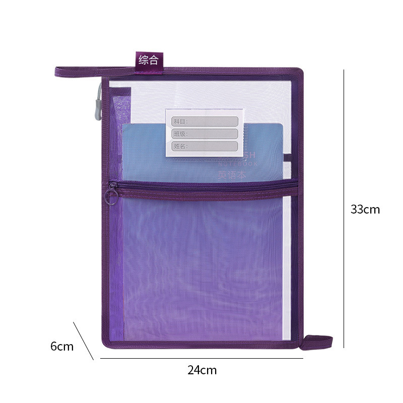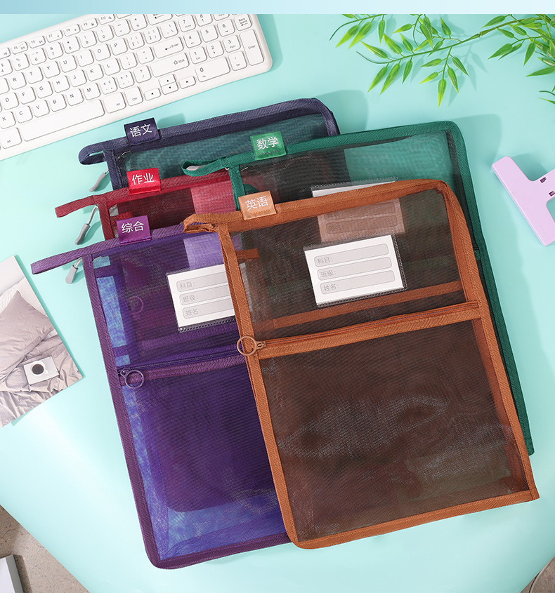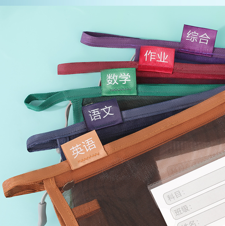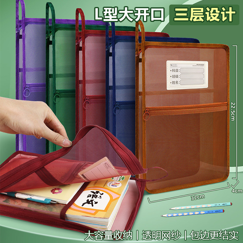 创意大容量L型网纱科目袋透明办公拉链文件袋学生手提试卷收纳袋