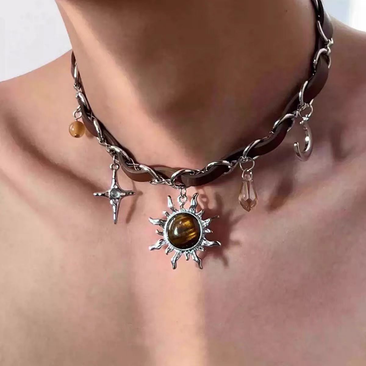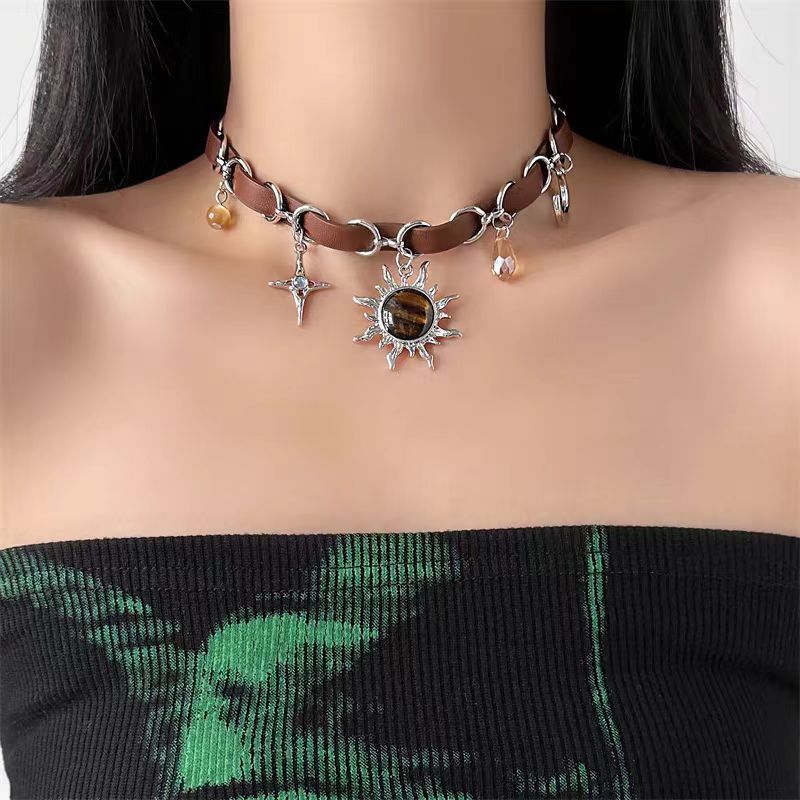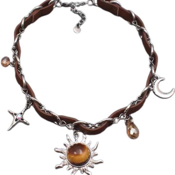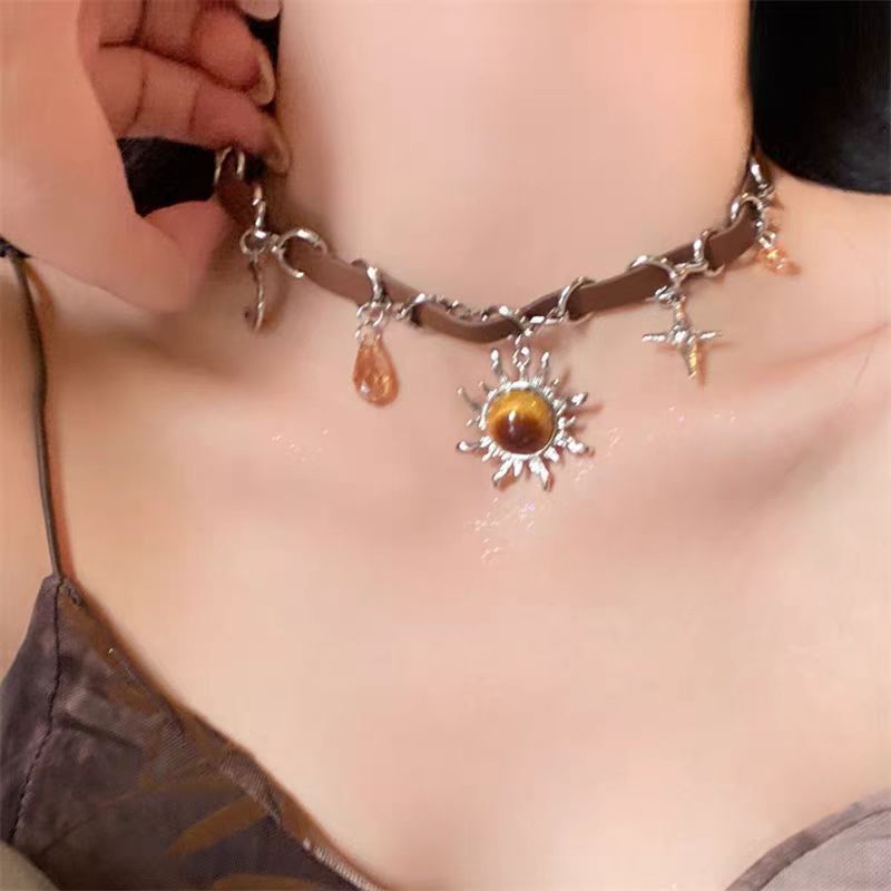 美拉德太阳花项链女秋冬小众轻奢高级感毛衣链配饰棕色复古锁骨链