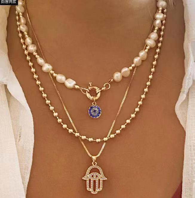 欧美跨境热卖 夸张合金镶钻多层项链 女士珍珠眼睛手掌吊坠链子