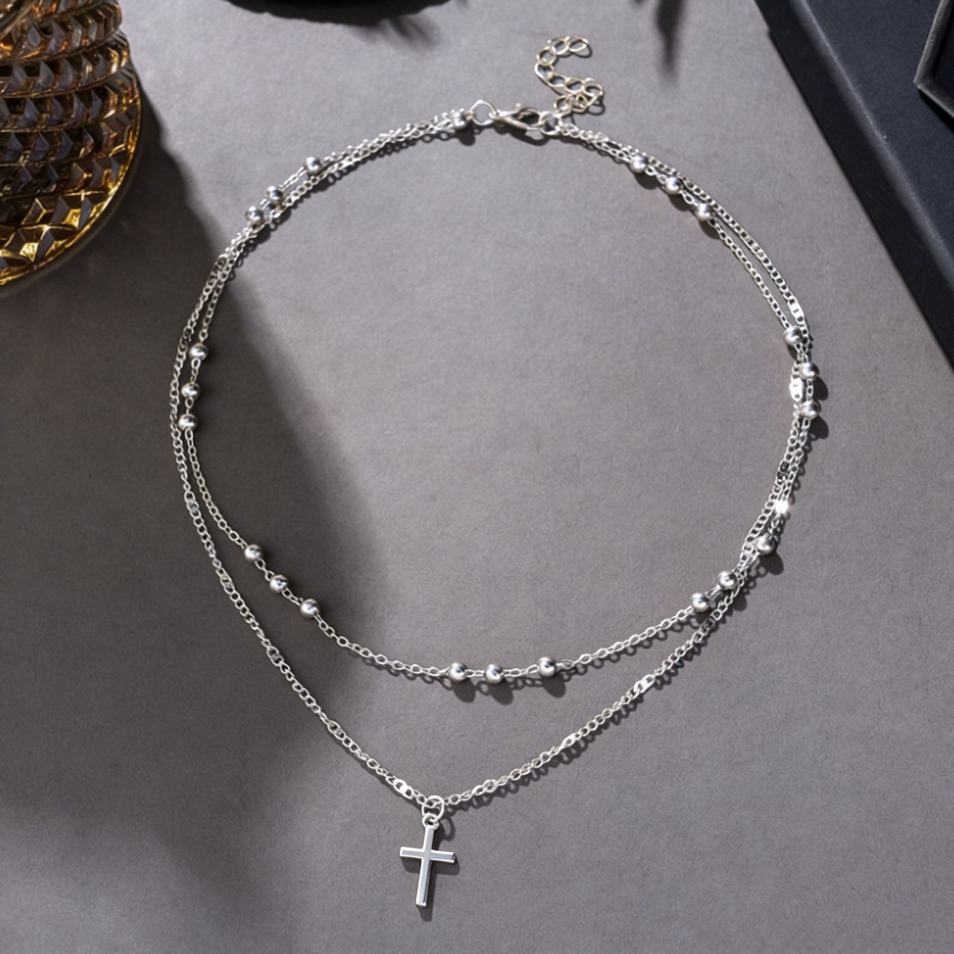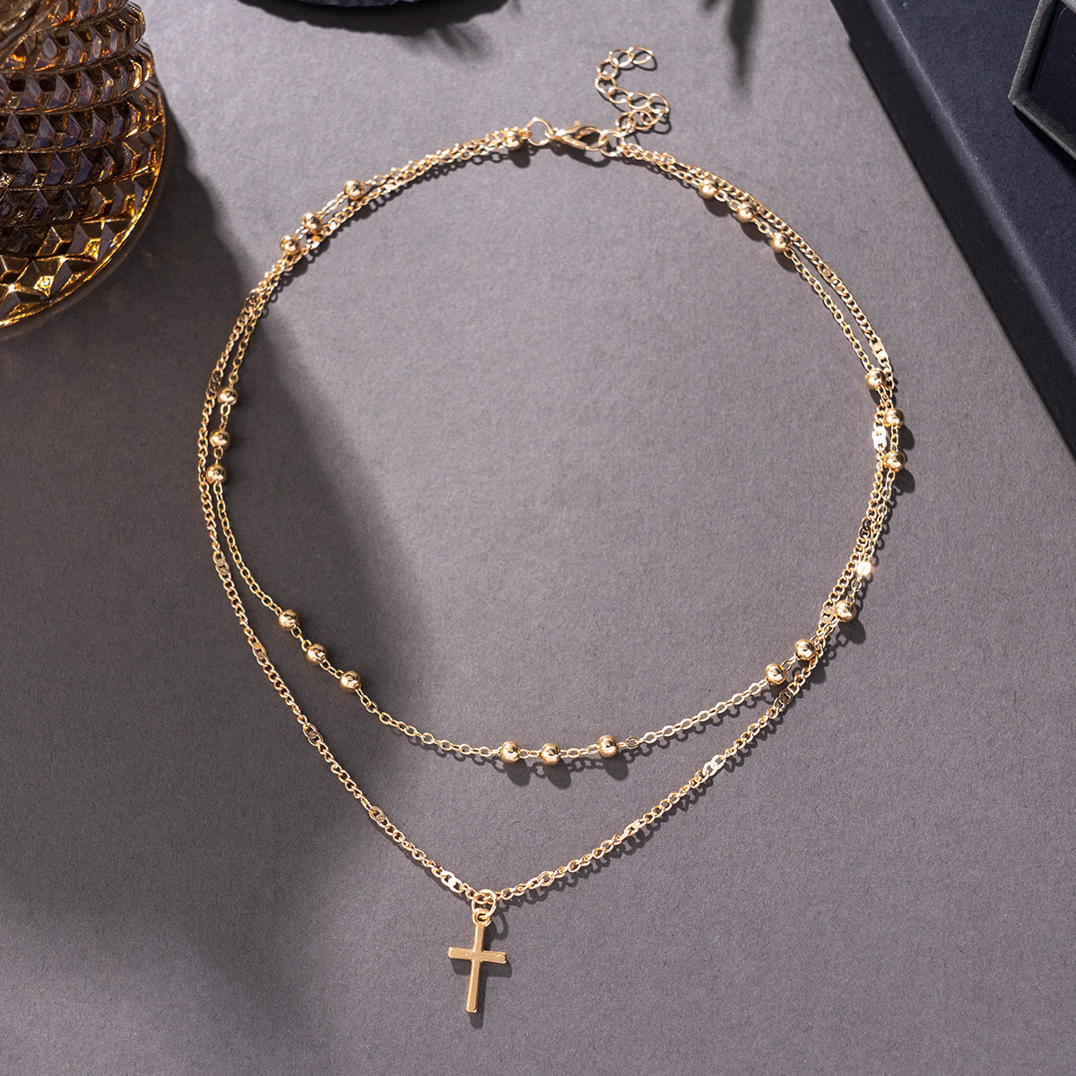 欧美跨境热卖 个性潮流可叠戴十字架双层项链金色圆珠链条锁骨链