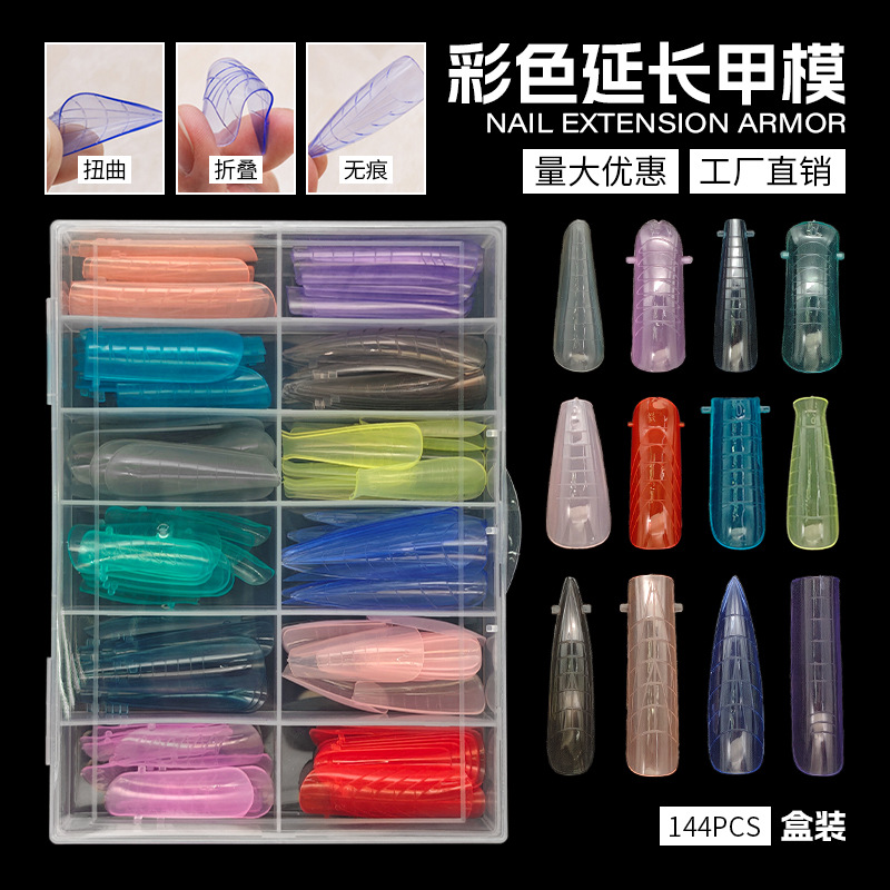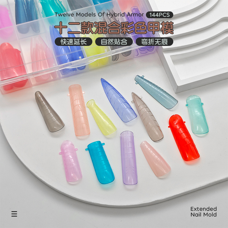 跨境爆款延长甲模144片盒装无纸托延长彩色12款混款水晶甲模甲片