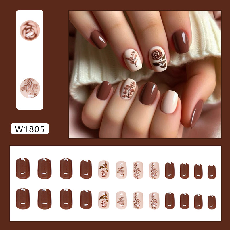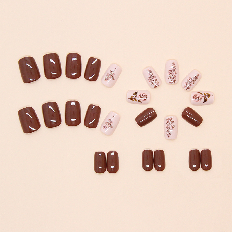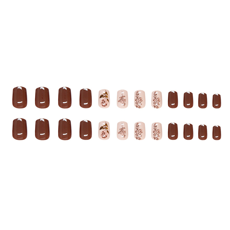 外贸美甲片纯色线条穿戴甲可拆卸美甲片简约玫瑰假指甲短甲24片