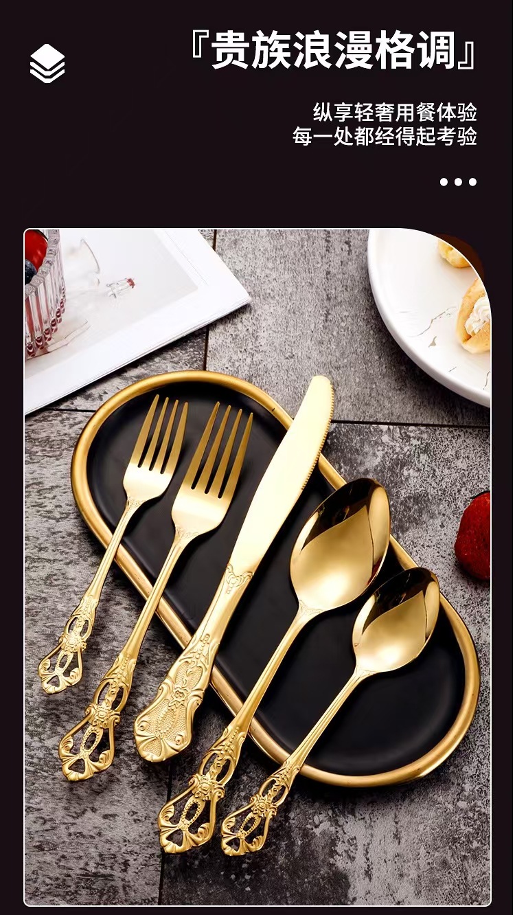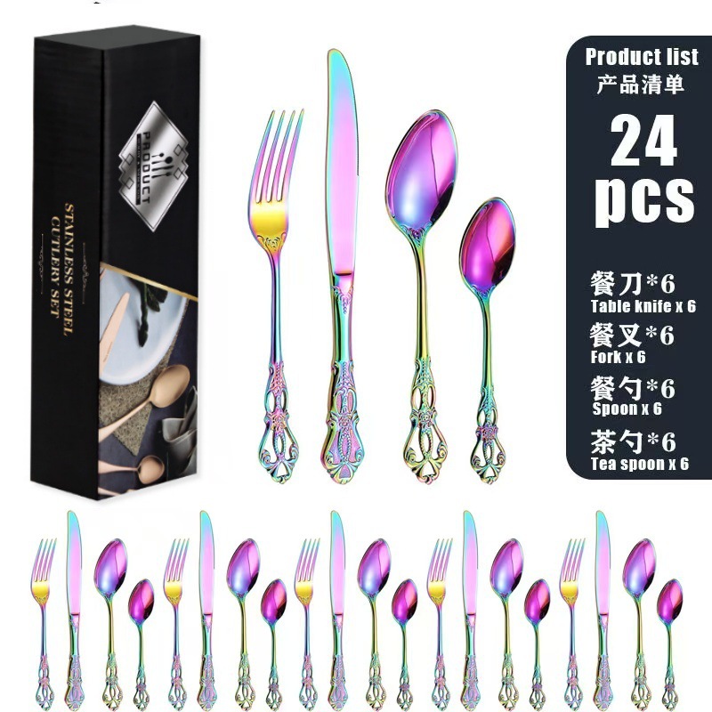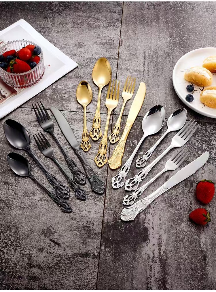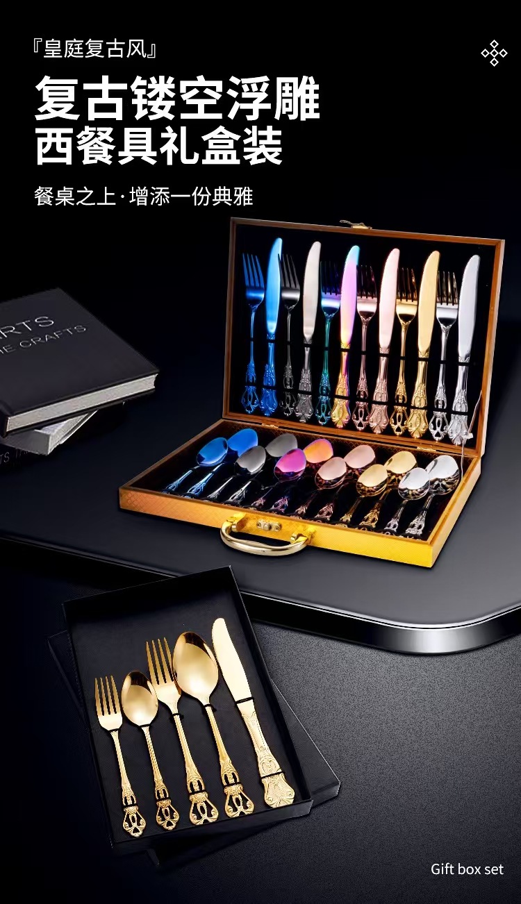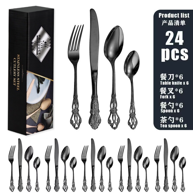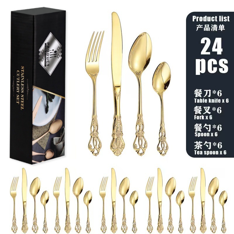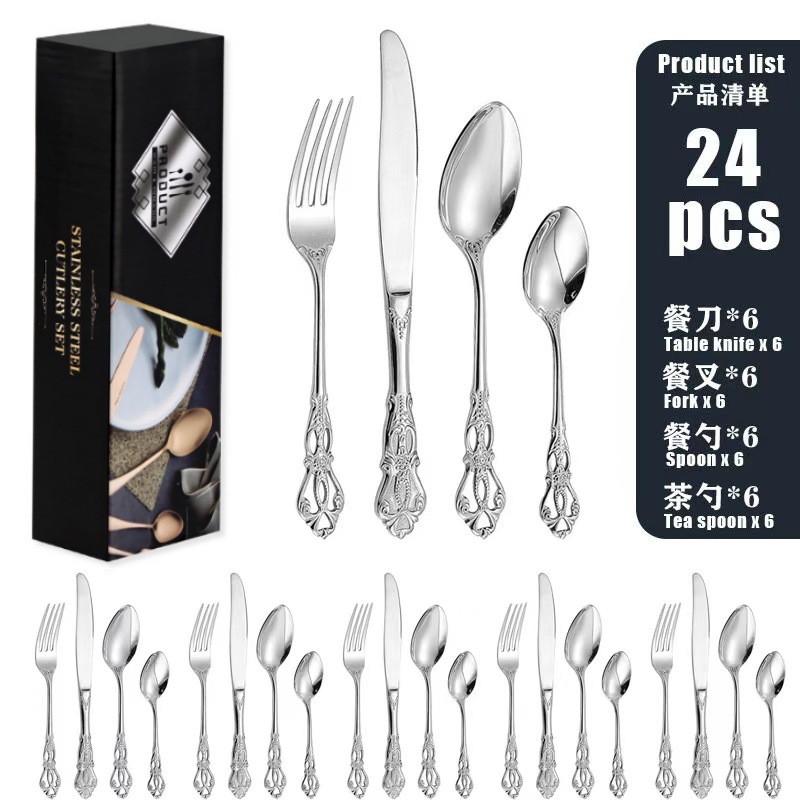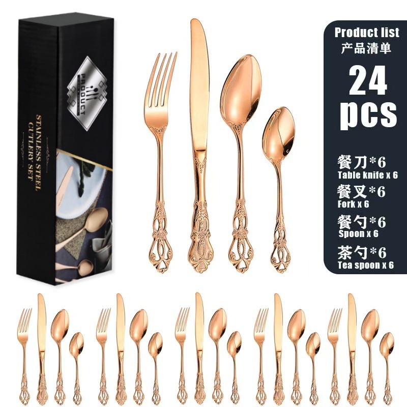 跨境不锈钢刀叉勺餐具皇庭浮雕镂空24件套西餐牛排刀叉勺礼品套装