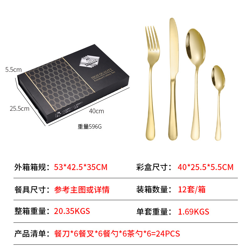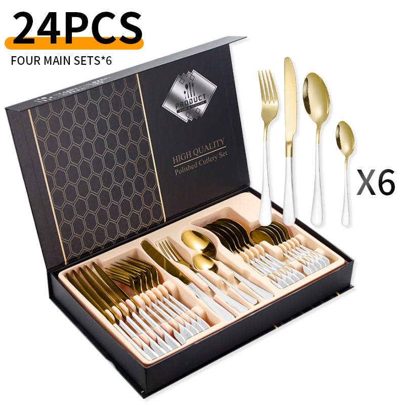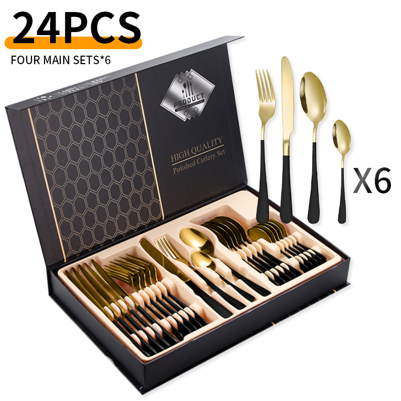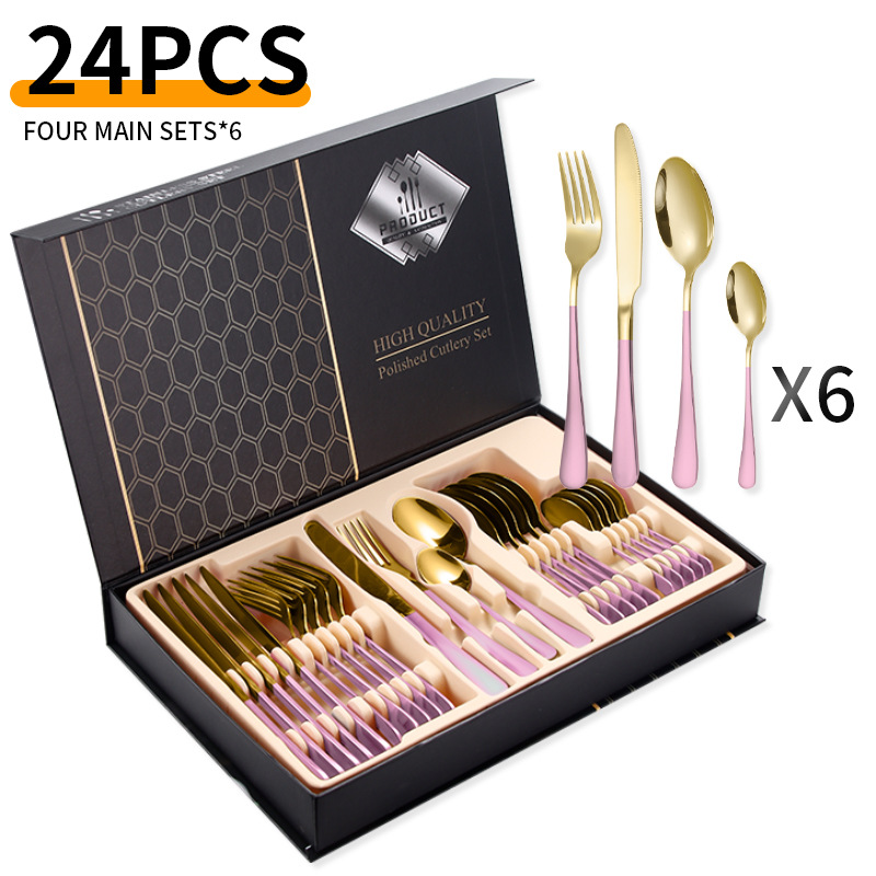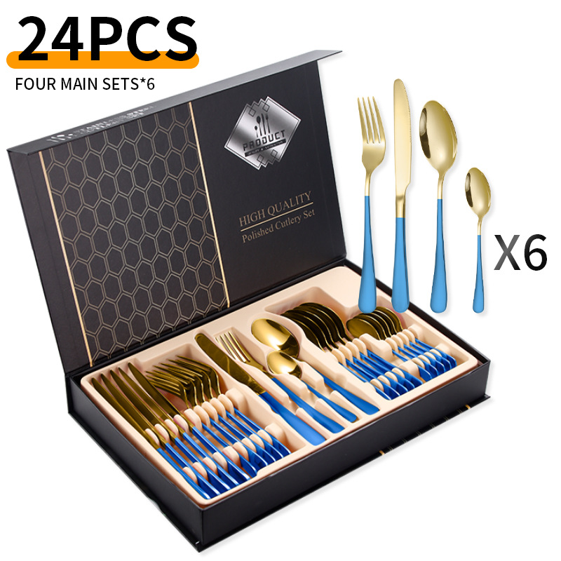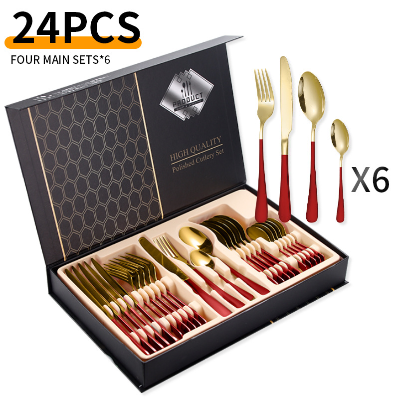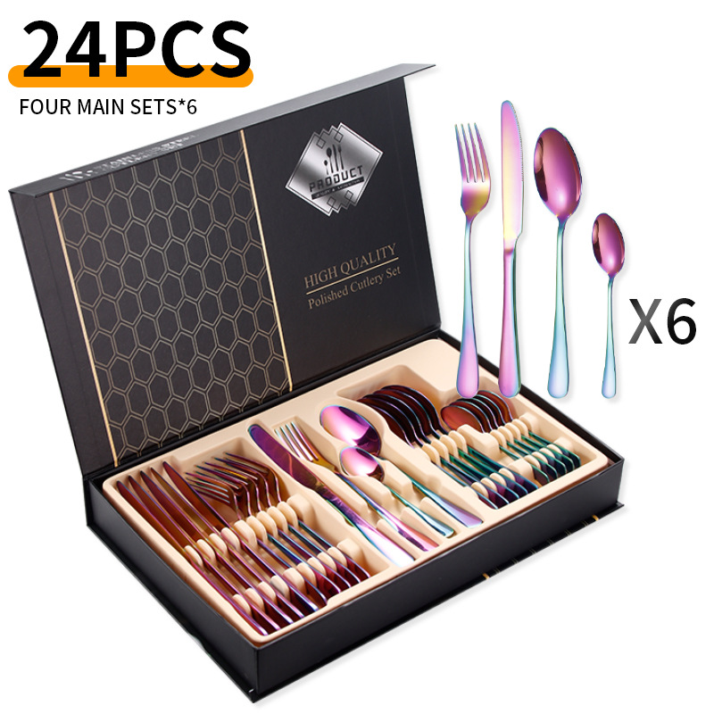跨境热销不锈钢餐具刀叉勺24件套网红翻盖盒装1010系列镀钛刀叉勺