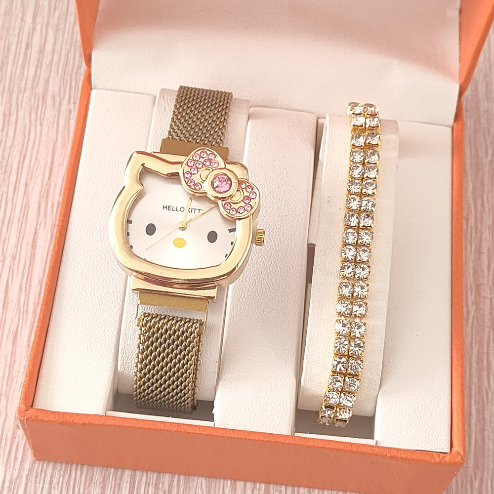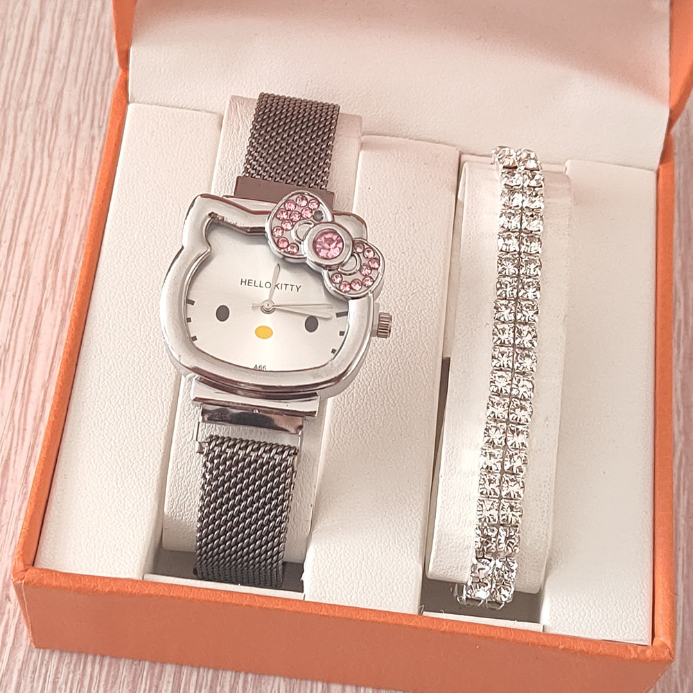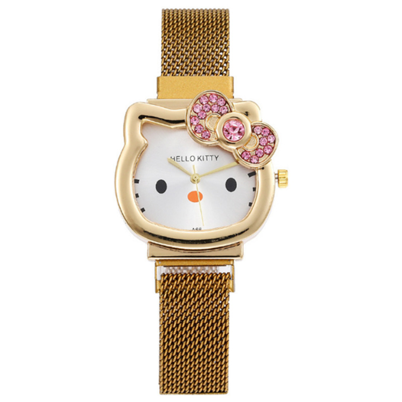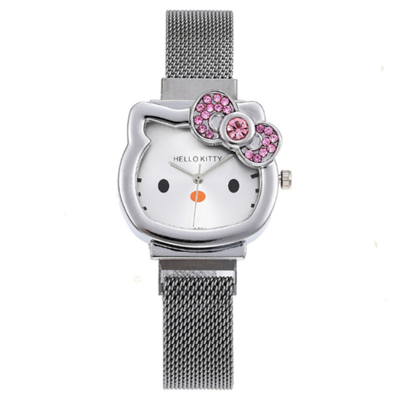 时尚卡通猫咪手表女士镶钻蝴蝶结儿童米兰网带吸铁石腕表现货批发
