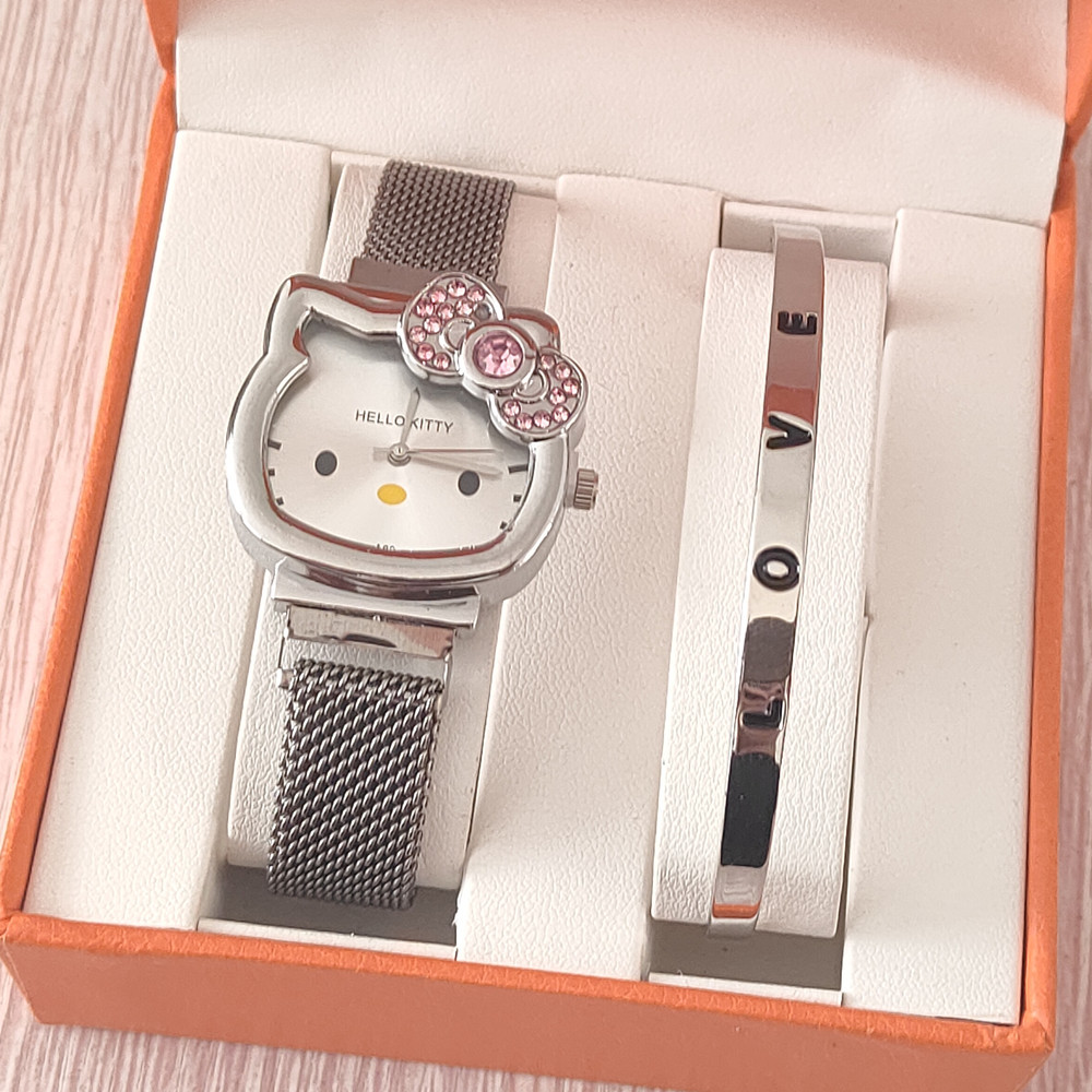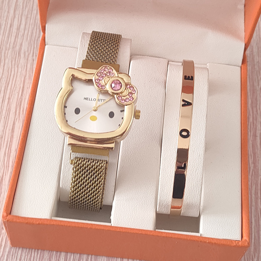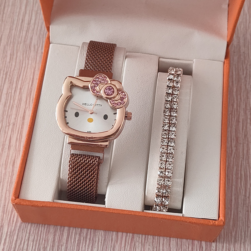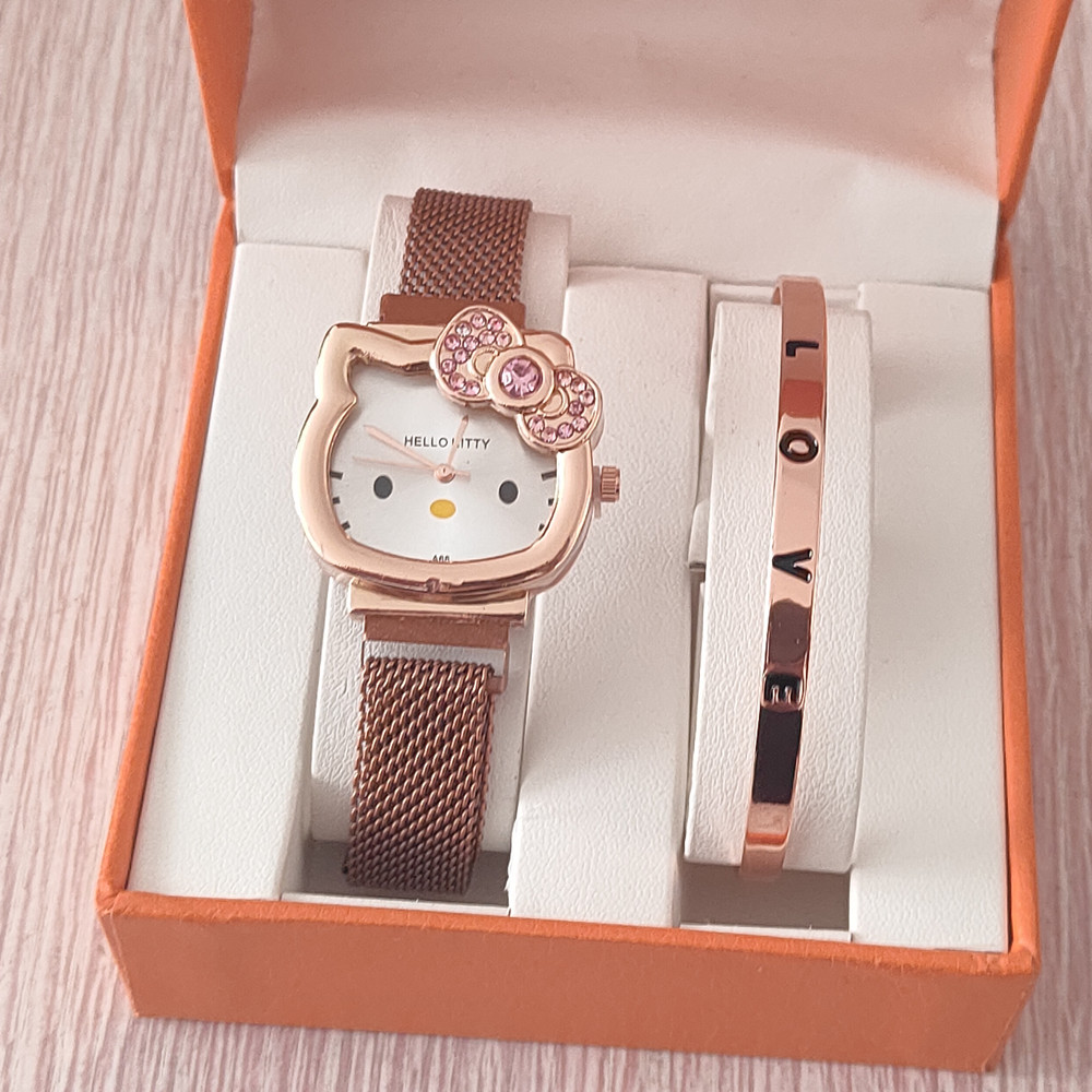 时尚卡通猫咪手表女士镶钻蝴蝶结儿童米兰网带吸铁石腕表现货批发
