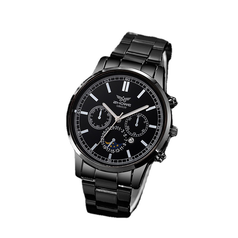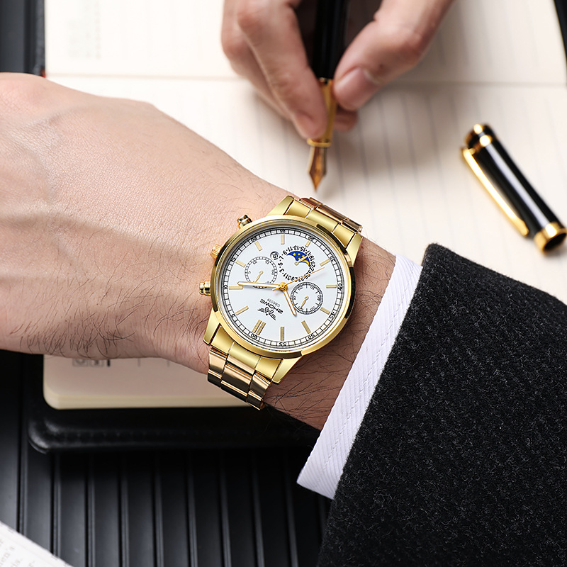 跨境热销男士商务新款时尚腕表假三眼网带日历非机械石英手表批发