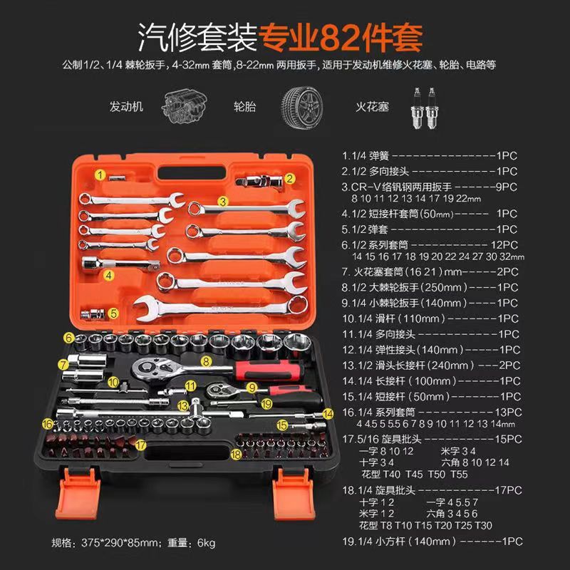 厂家82件套汽修工具套装24齿棘轮铬钒钢套筒工具组合维修组套工具