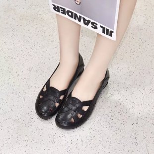 一脚蹬妈妈凉鞋女鞋2025新款春夏平底中老年女鞋镂空皮鞋低跟板鞋