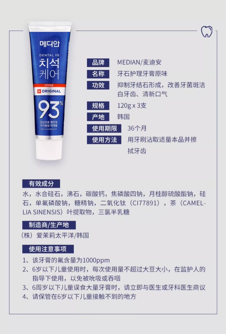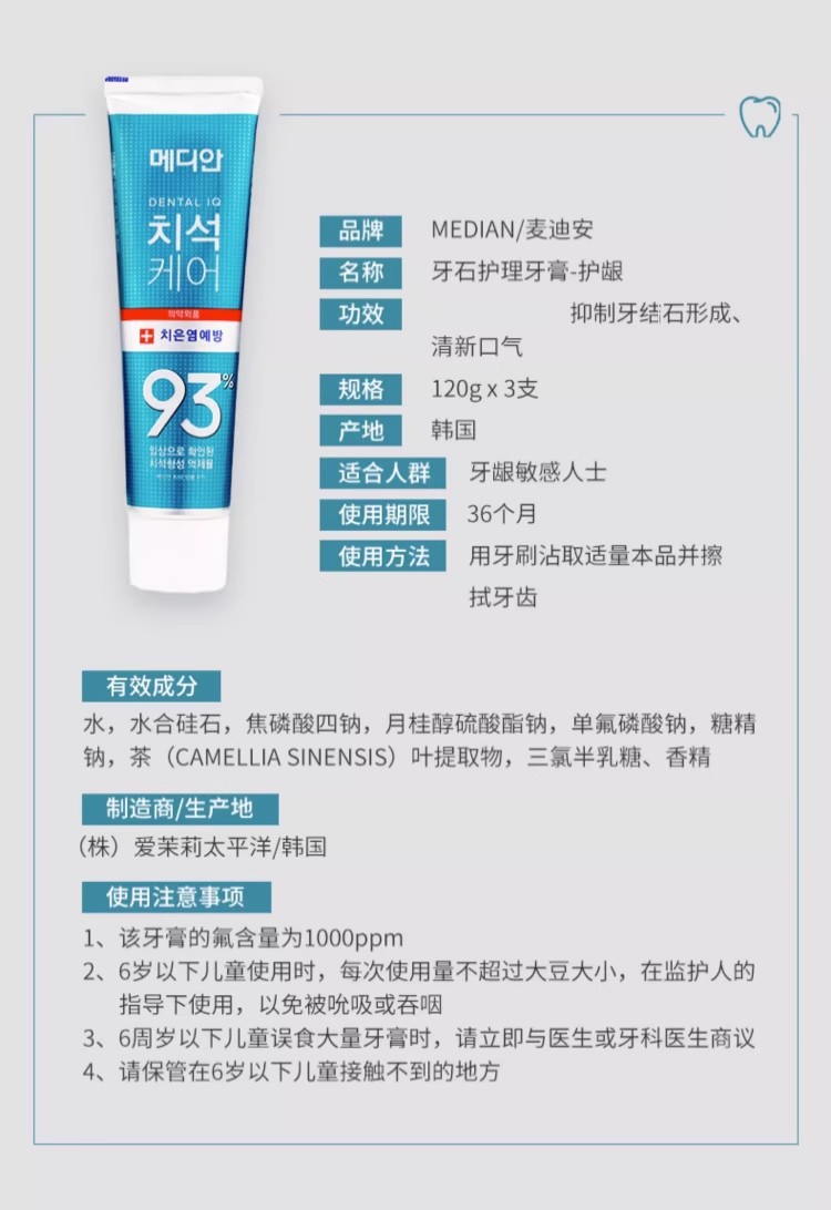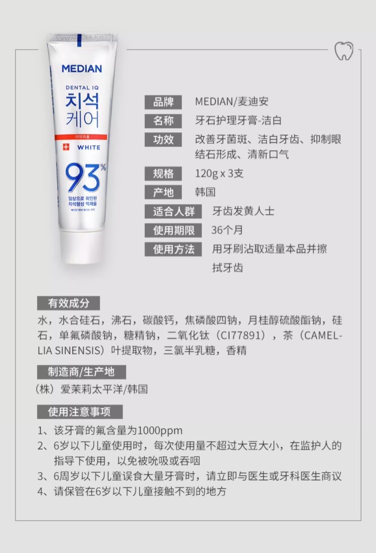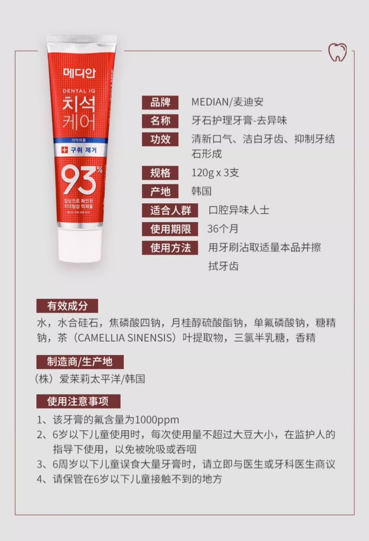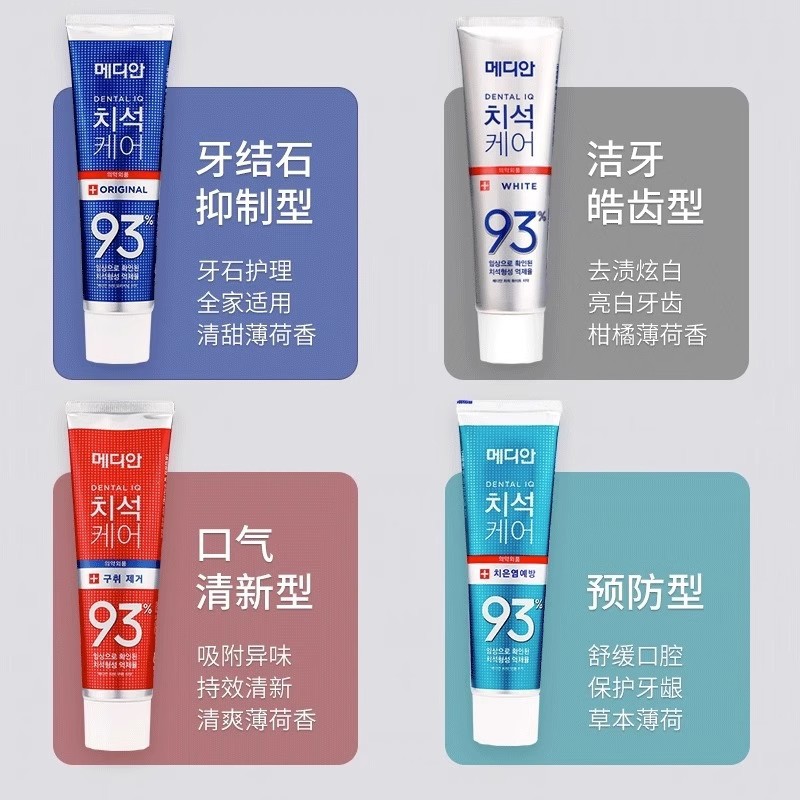 韩国进口茉莉美迪安93牙膏120g清新口气去渍 原装正品成人牙膏
