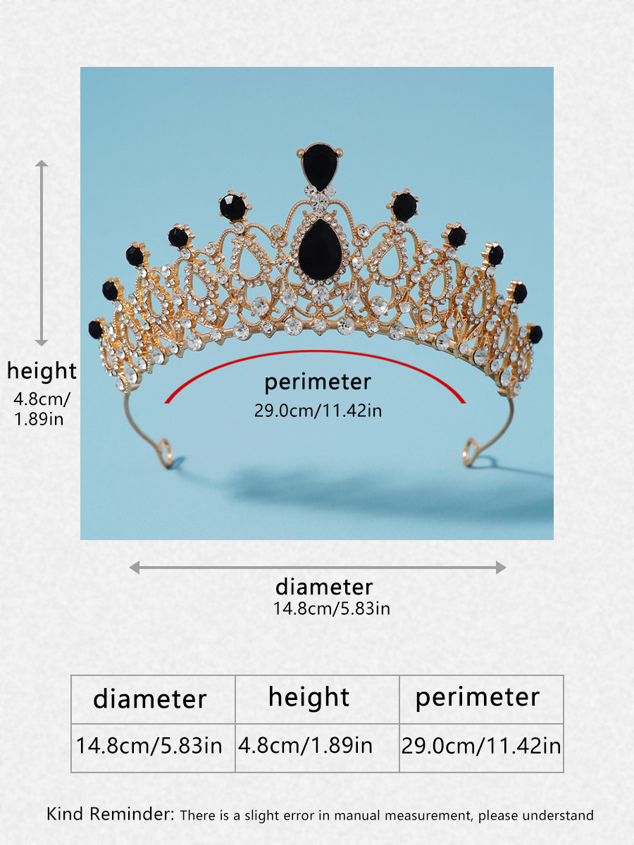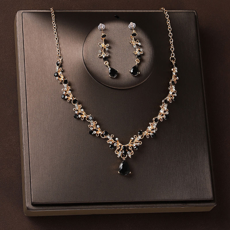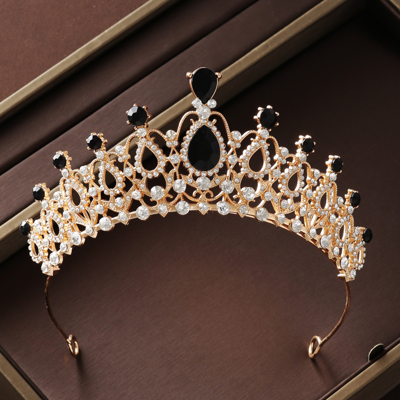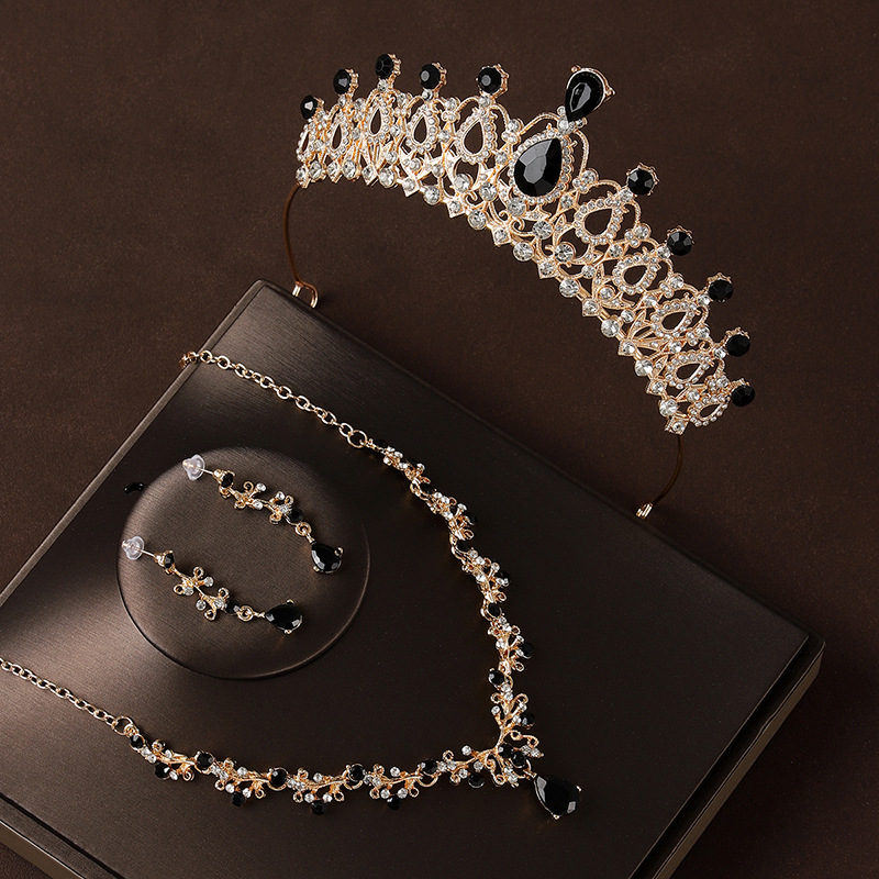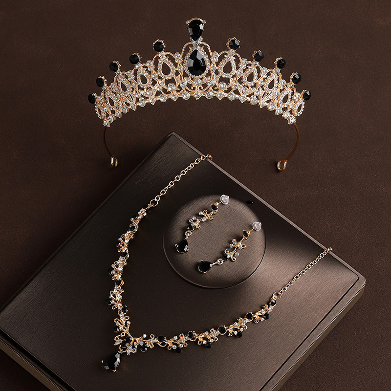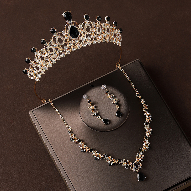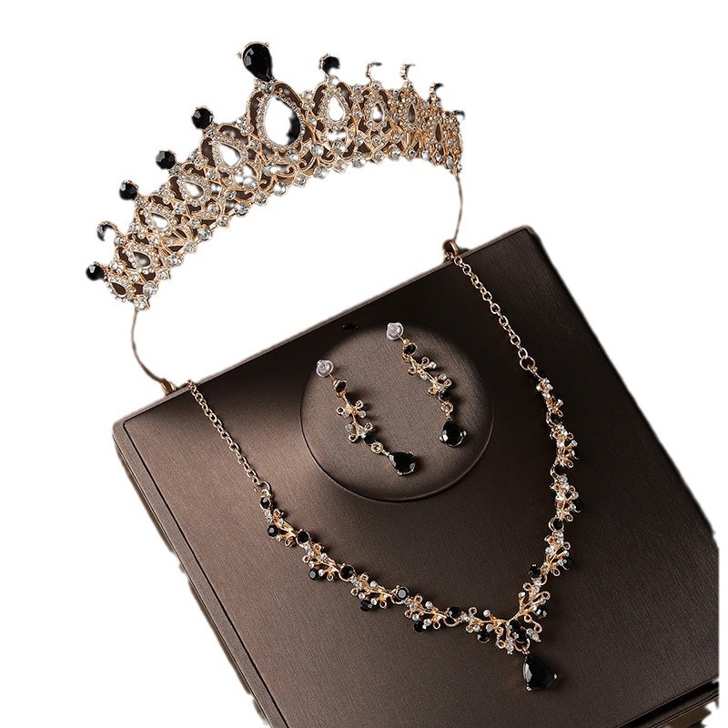 皇冠头饰三件套黑色复古公主生日王冠项链耳环新娘婚纱晚礼服首饰