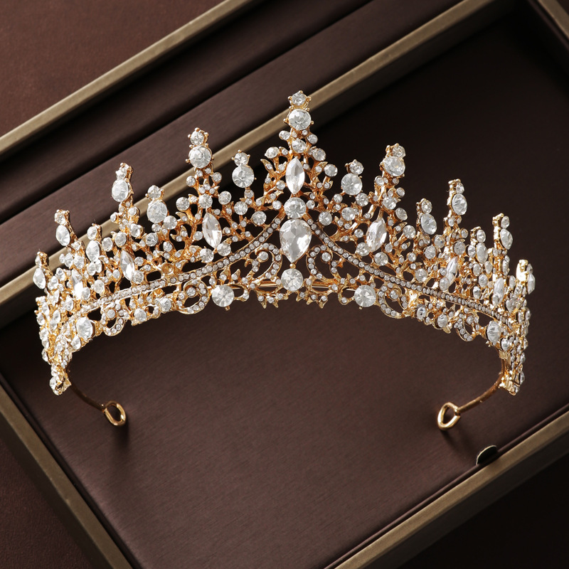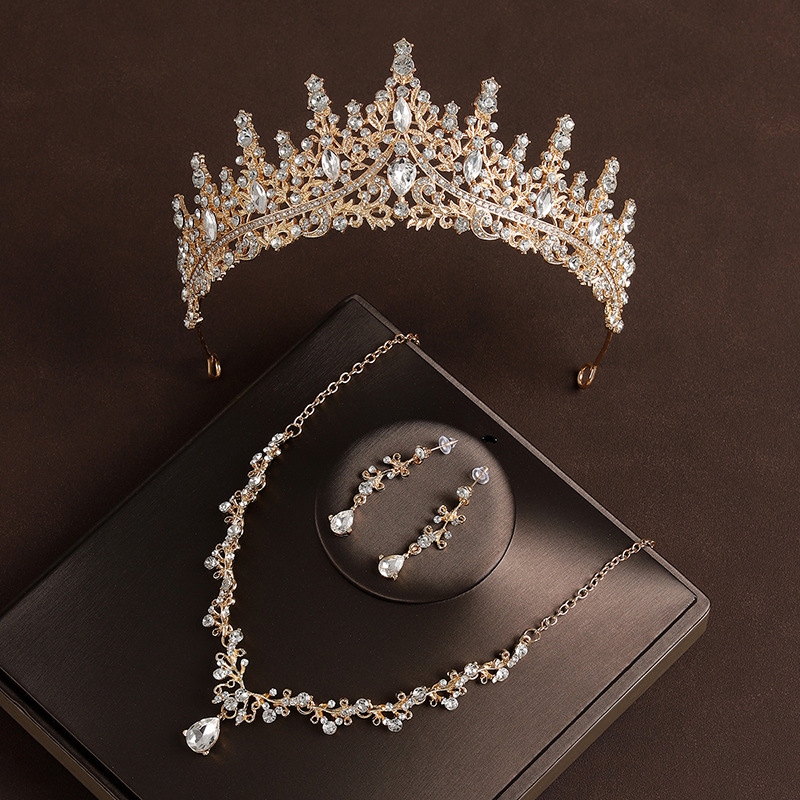 皇冠头饰项链耳环香槟金色复古生日王冠发饰新娘婚纱礼服三件套装