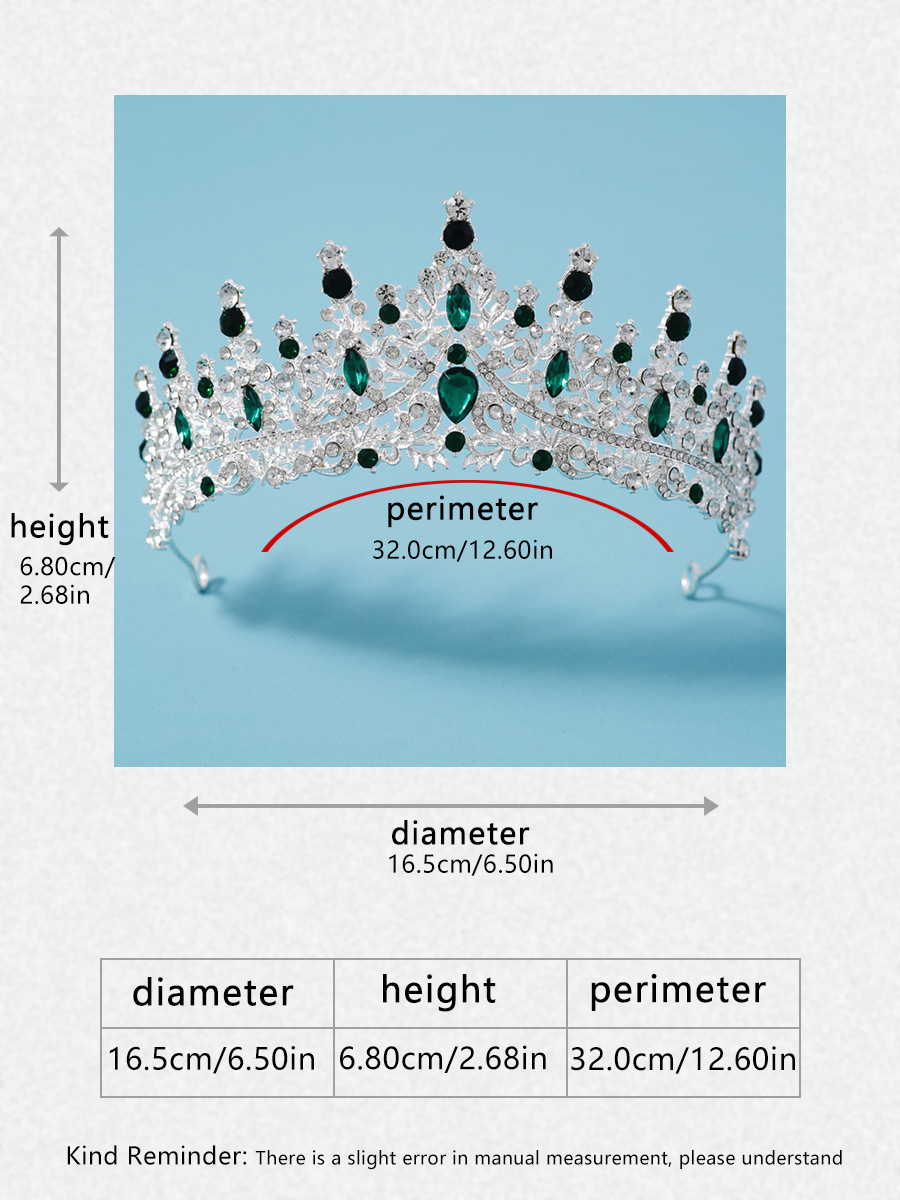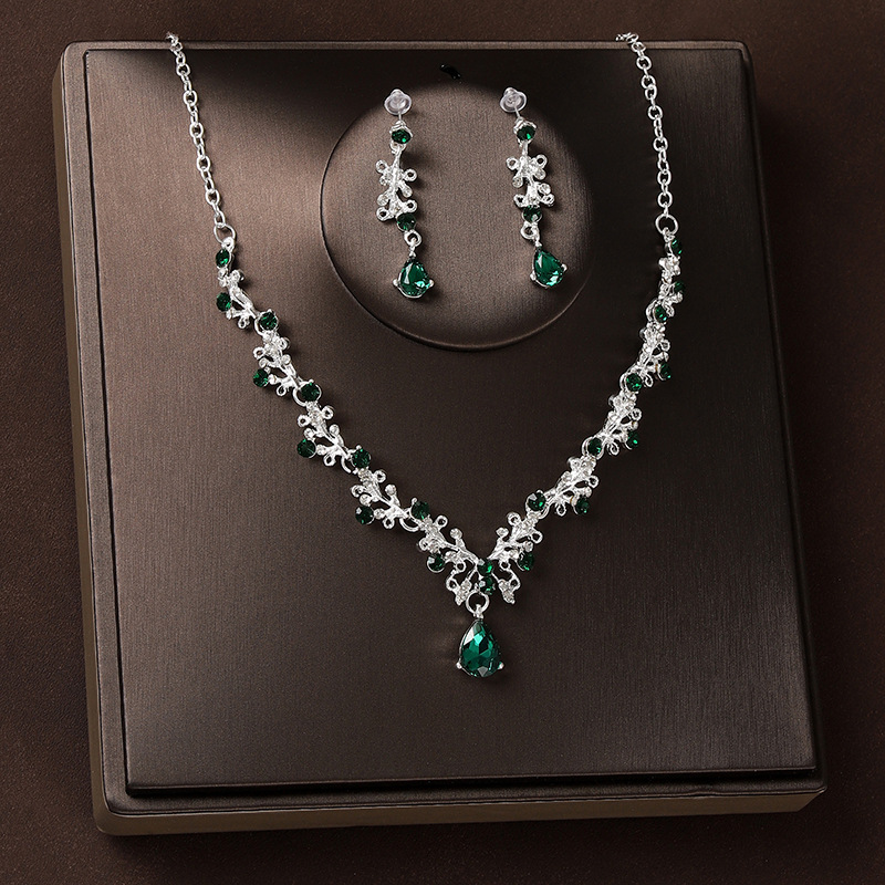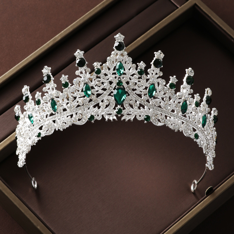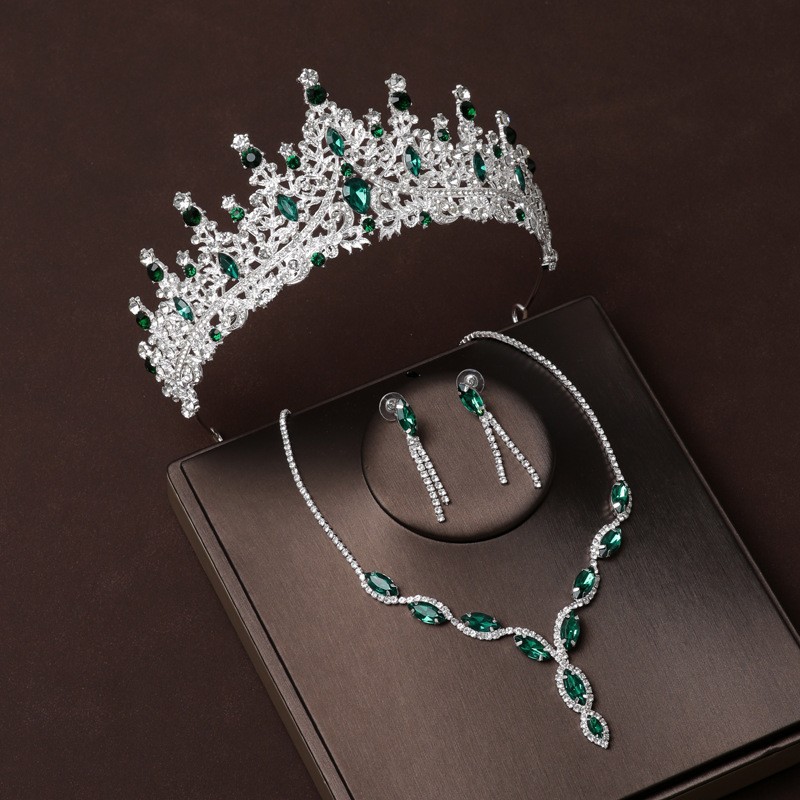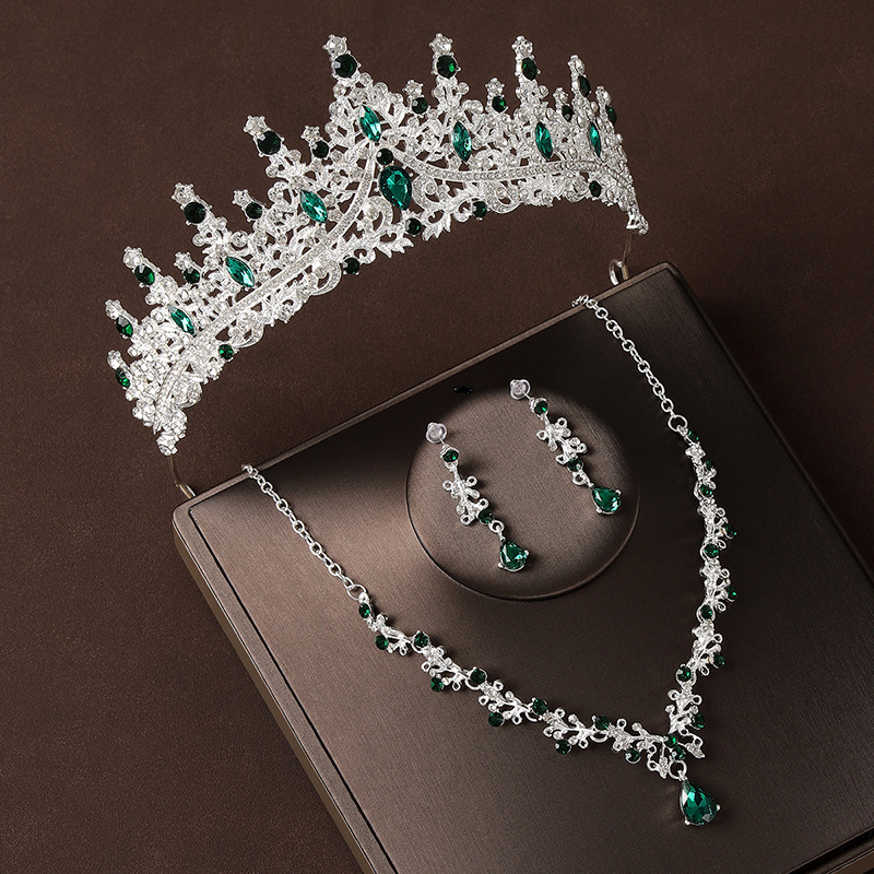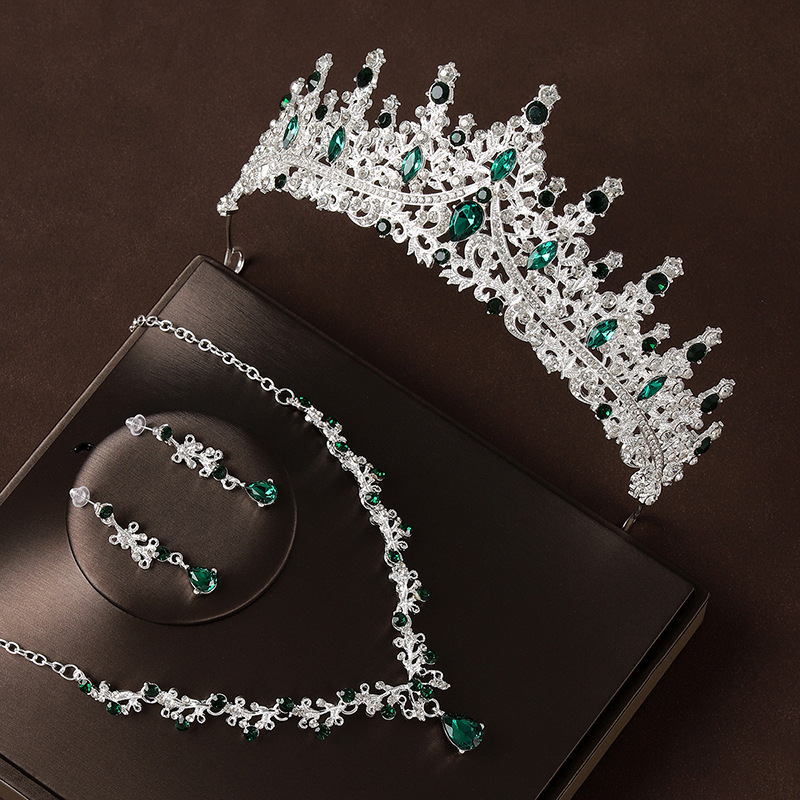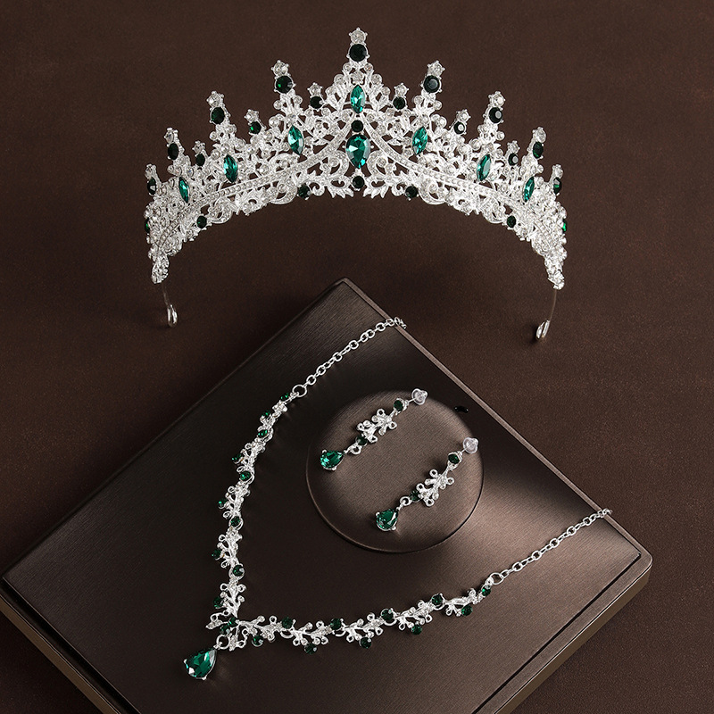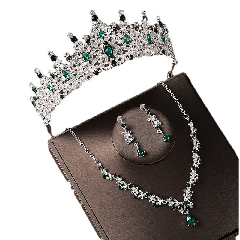 皇冠头饰项链耳环复古绿色水钻生日王冠发饰新娘婚纱礼服三件套装