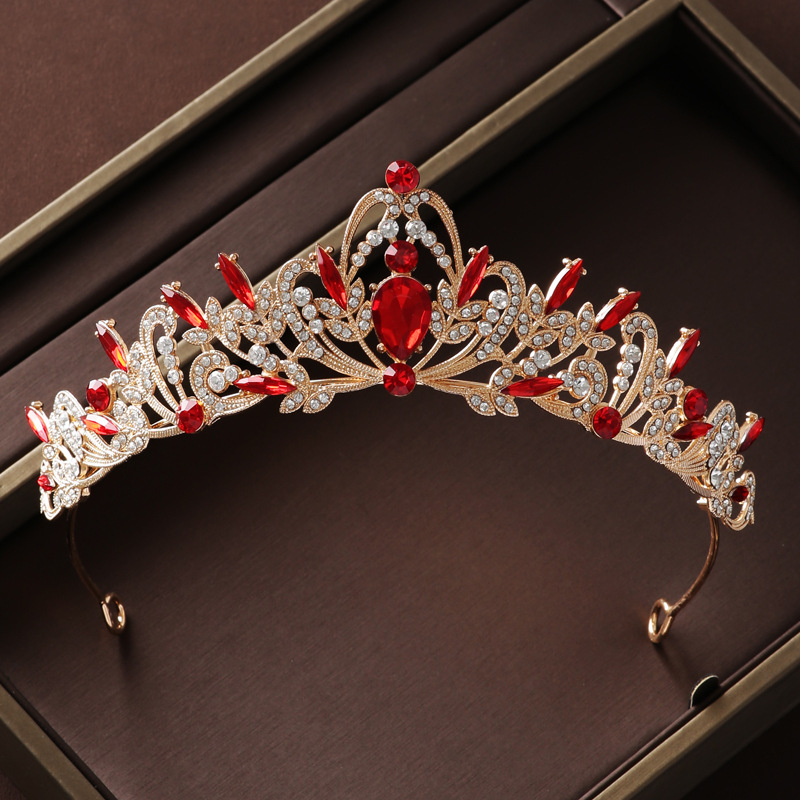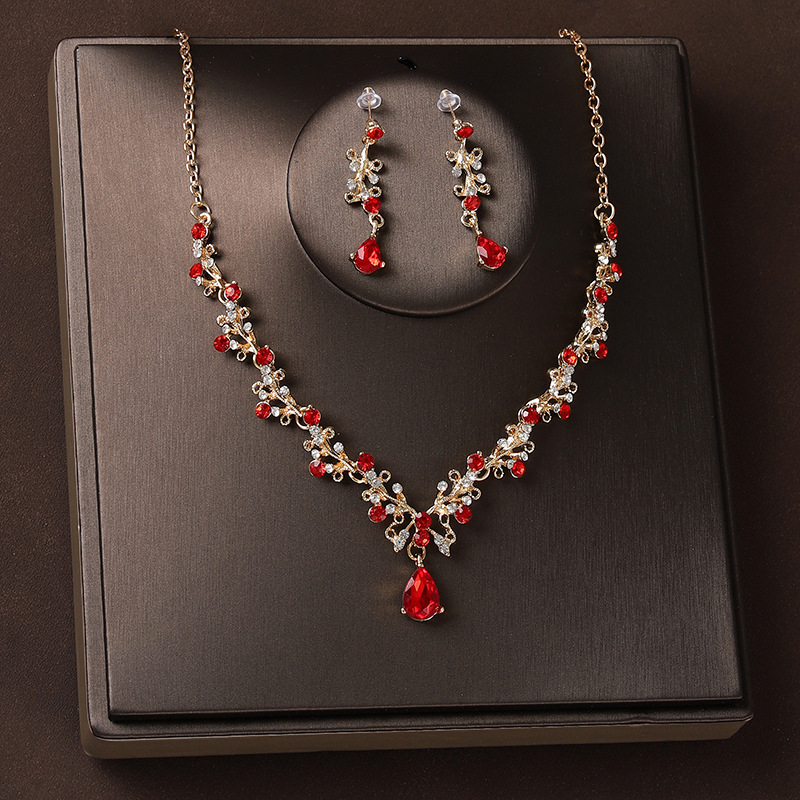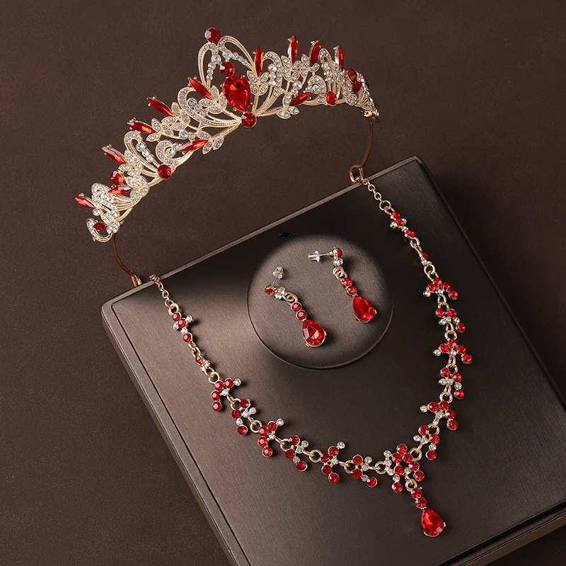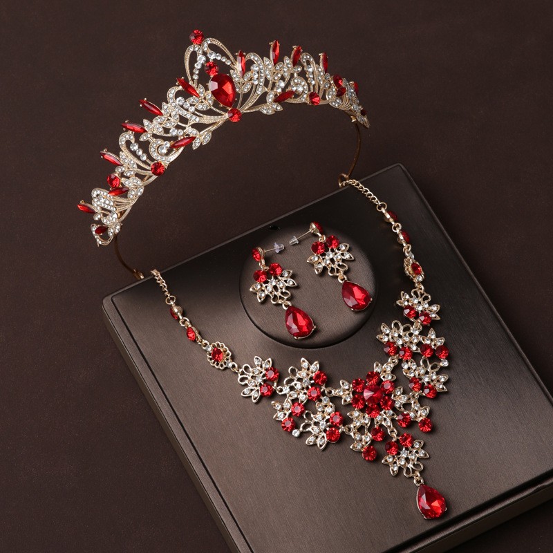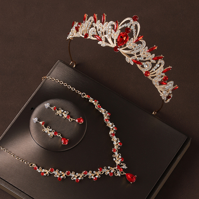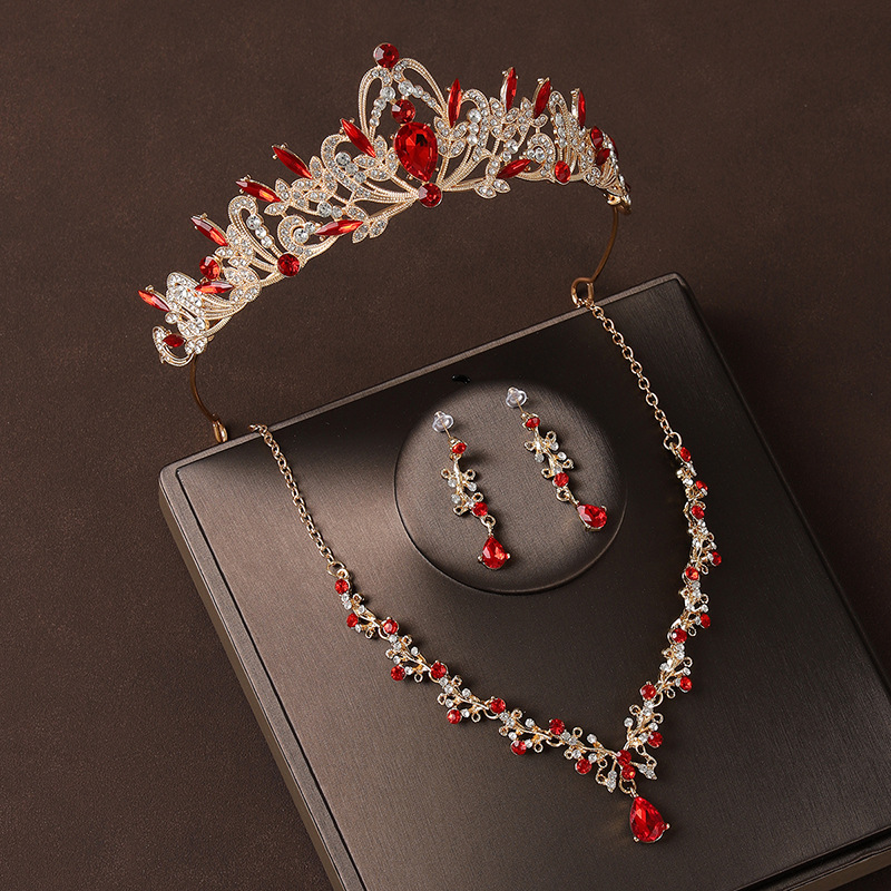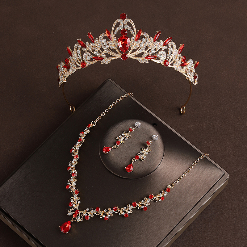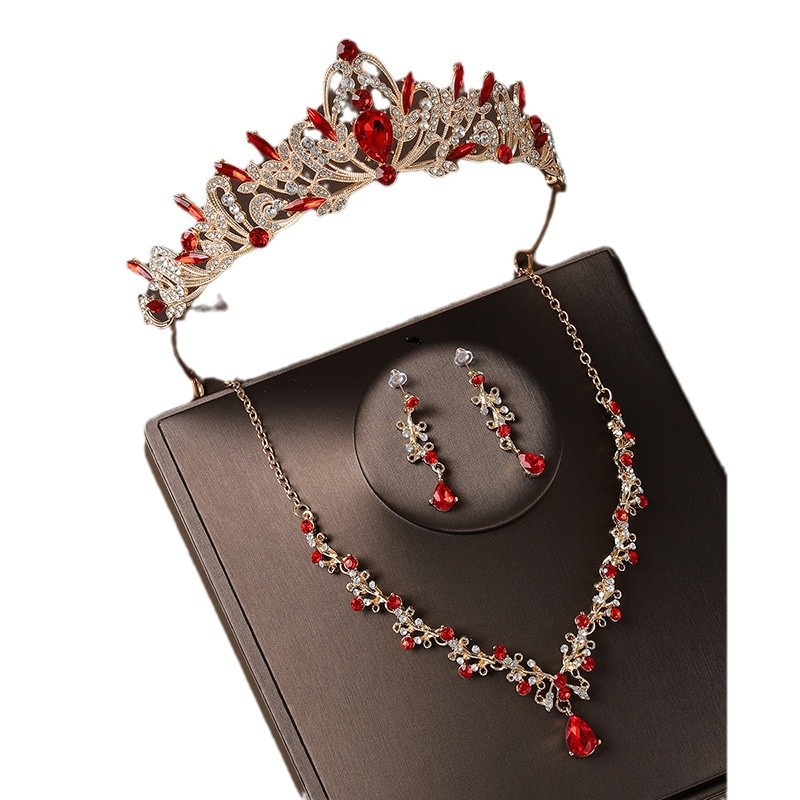 皇冠头饰三件套巴洛克红钻王冠项链耳环高级感新娘晚礼服首饰套装