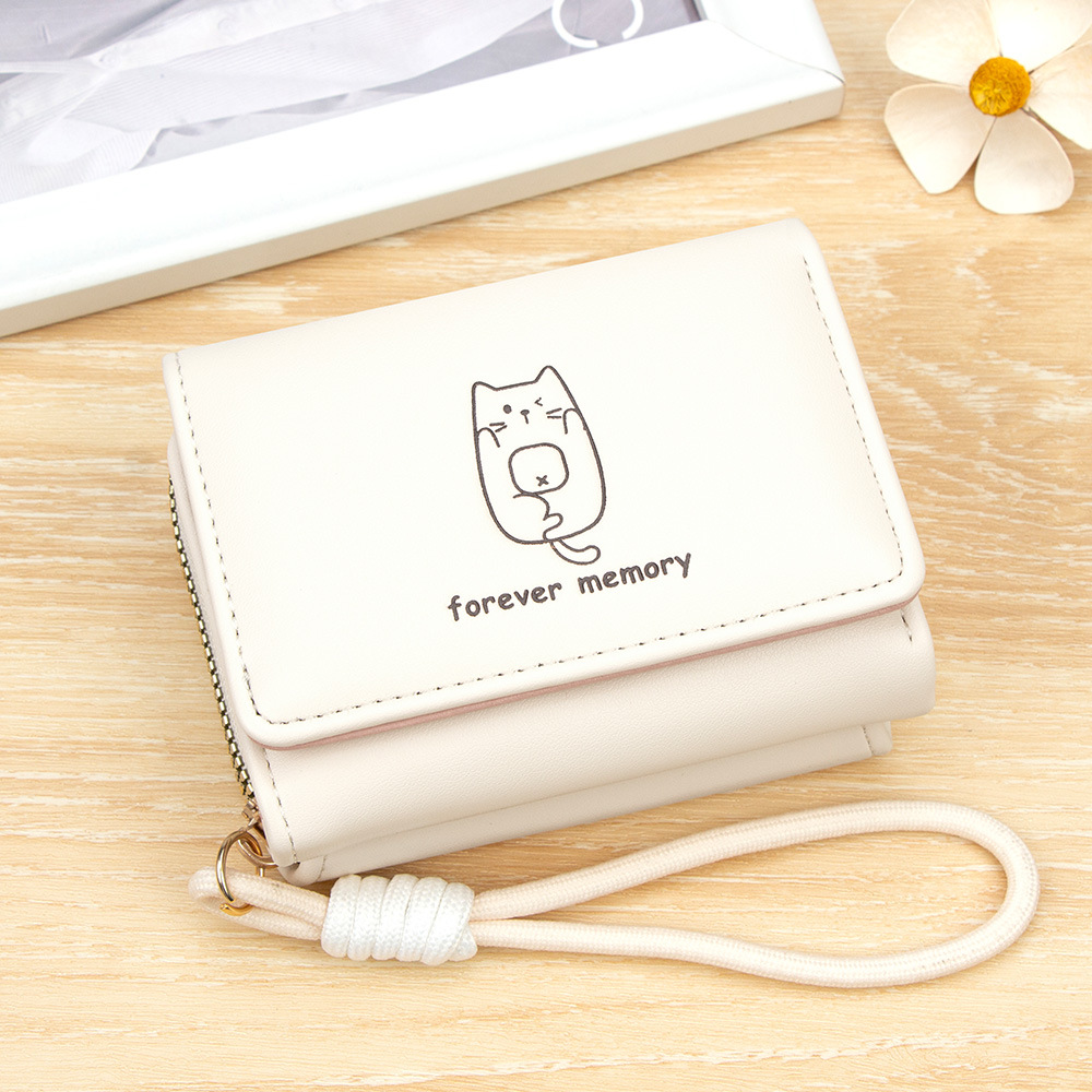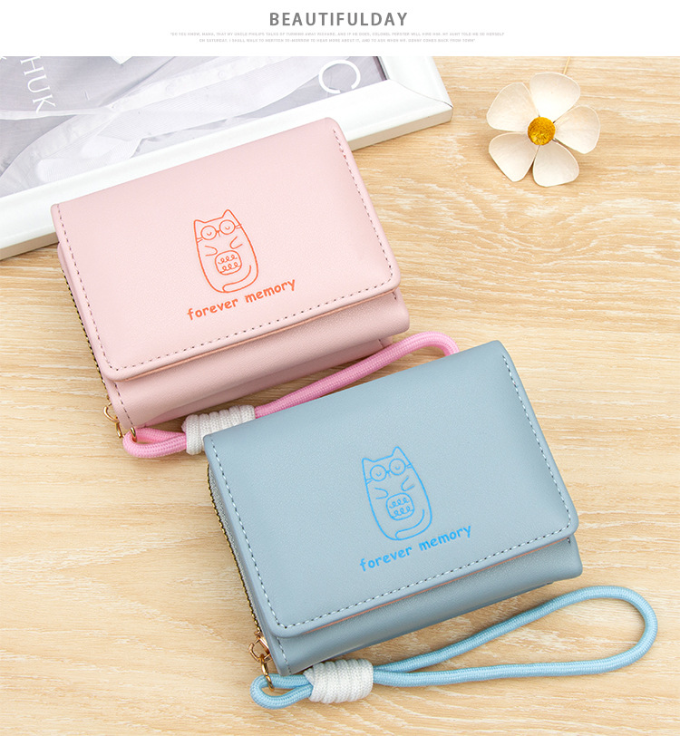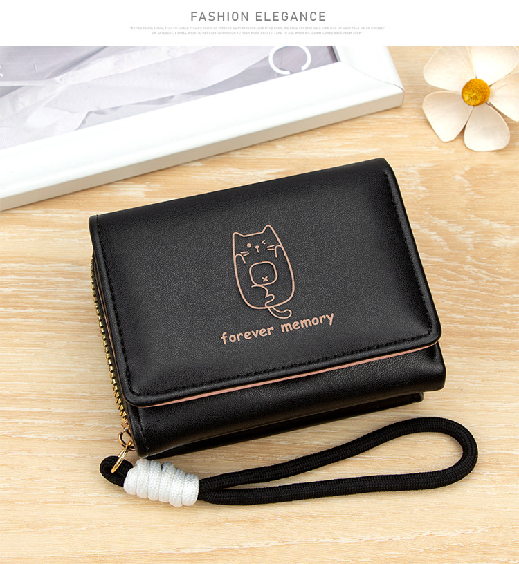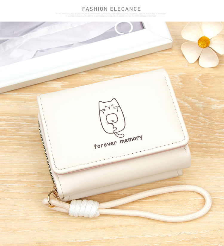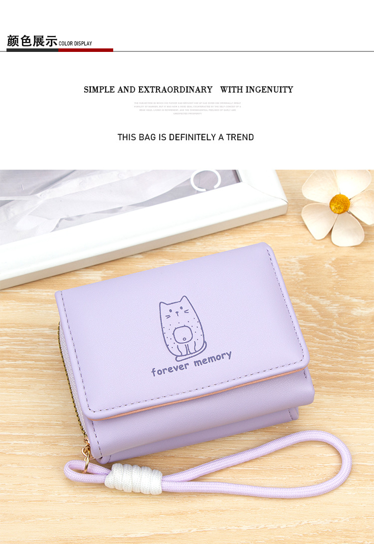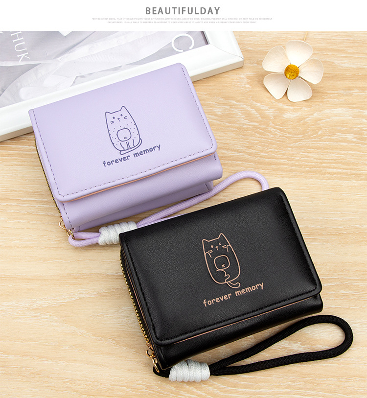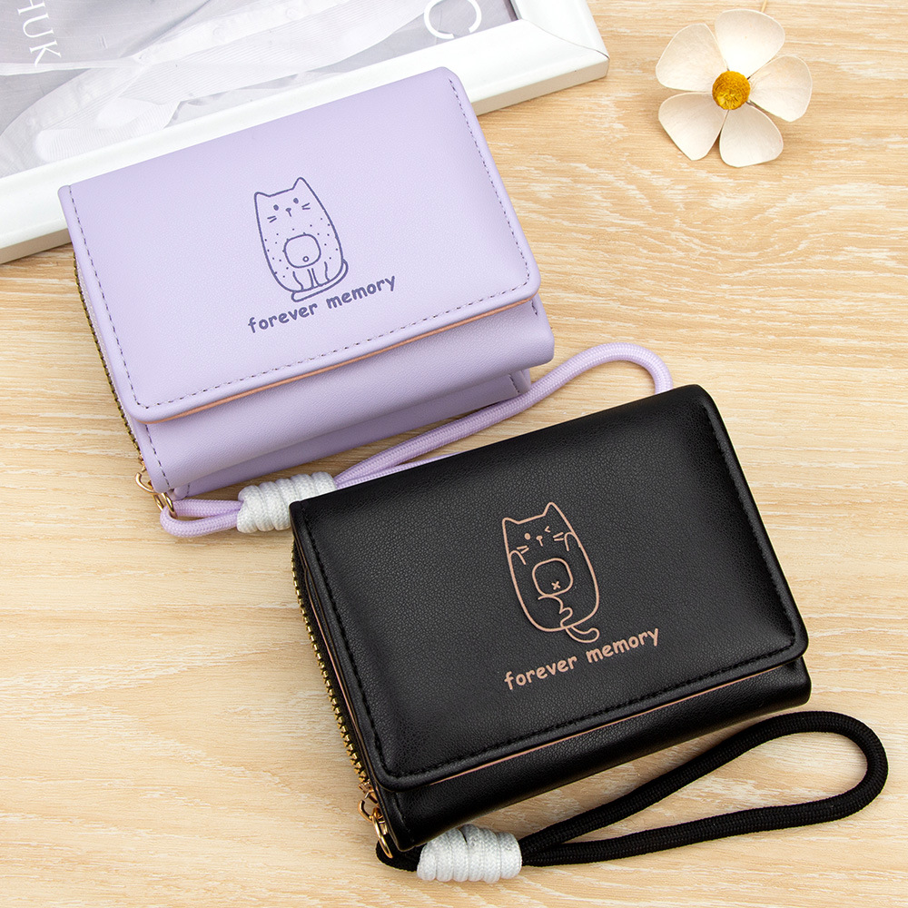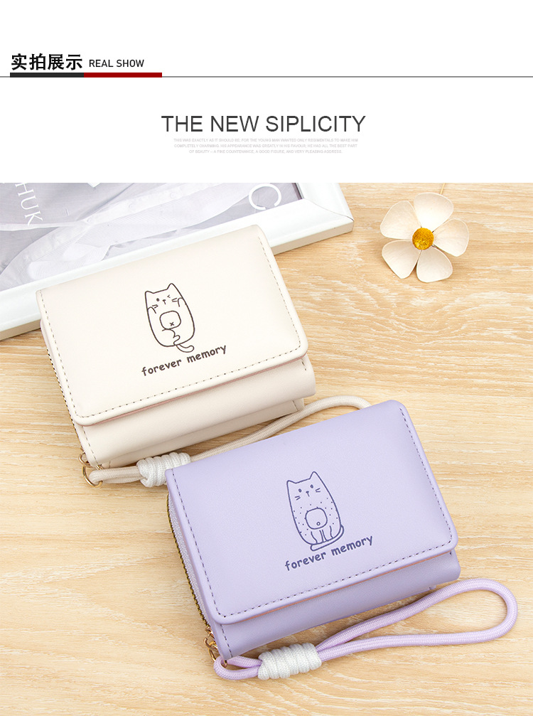 INS风日式可爱小猫女生钱包短款 大容量卡包拉链零钱包挂绳手拿包