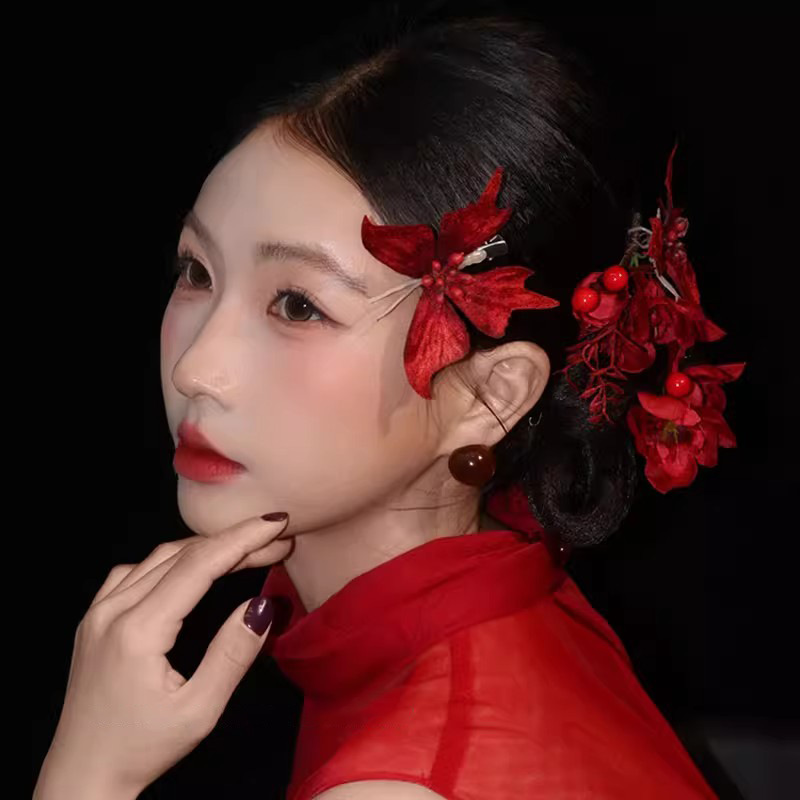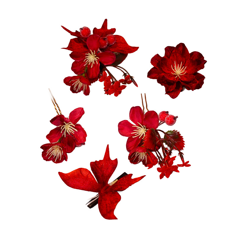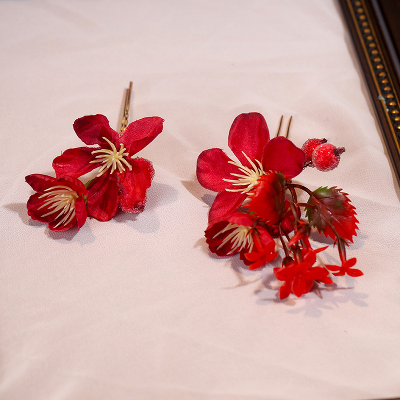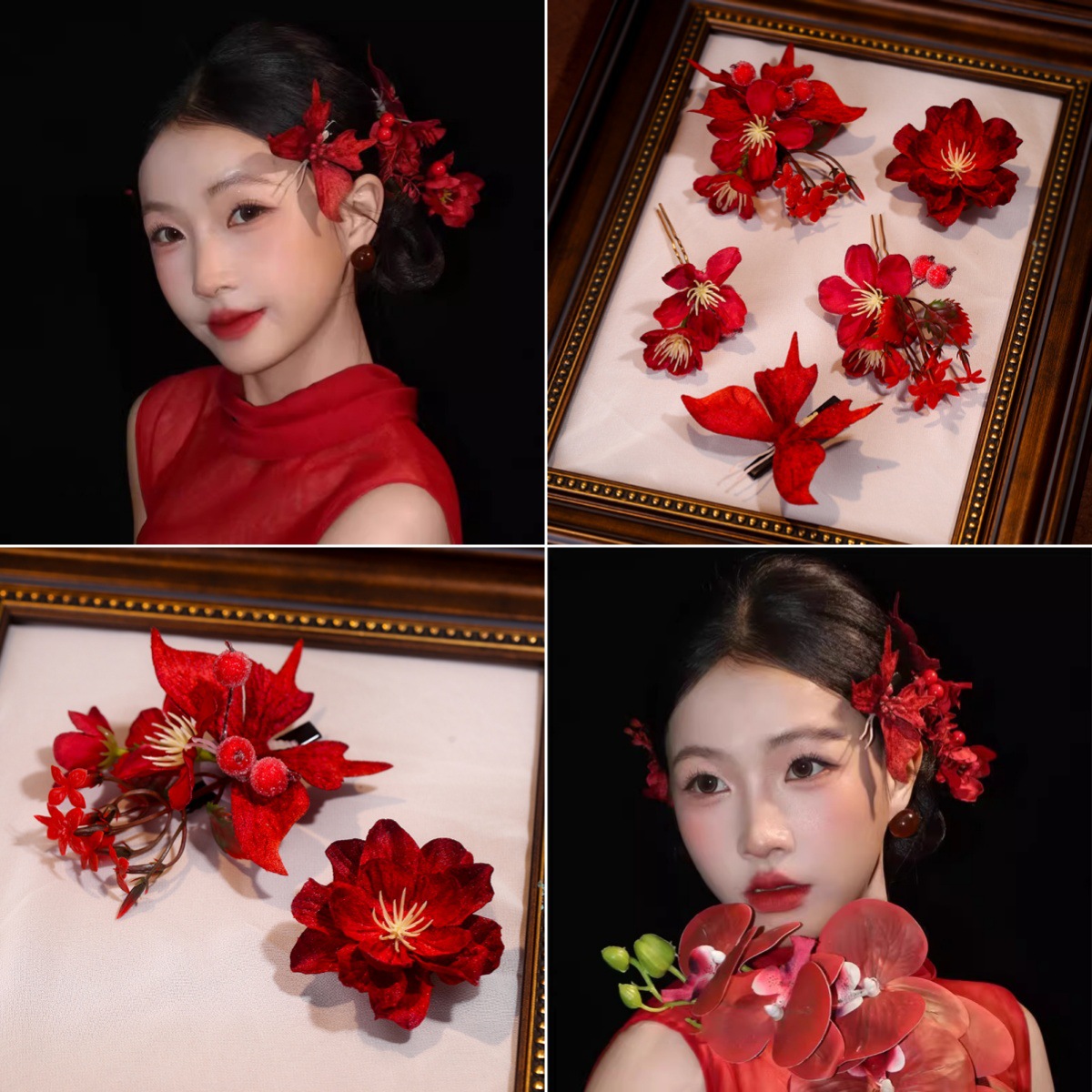 新中式新娘红色花朵蝴蝶发夹发钗敬酒服跟妆甜美造型发饰批发套装