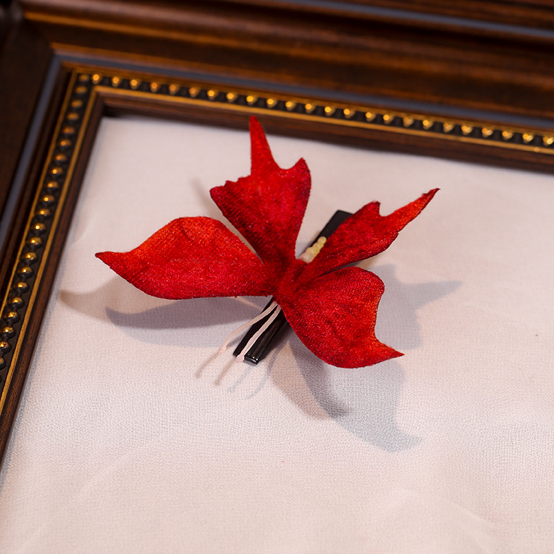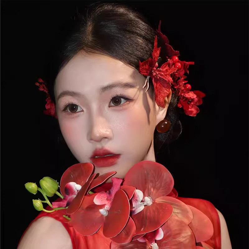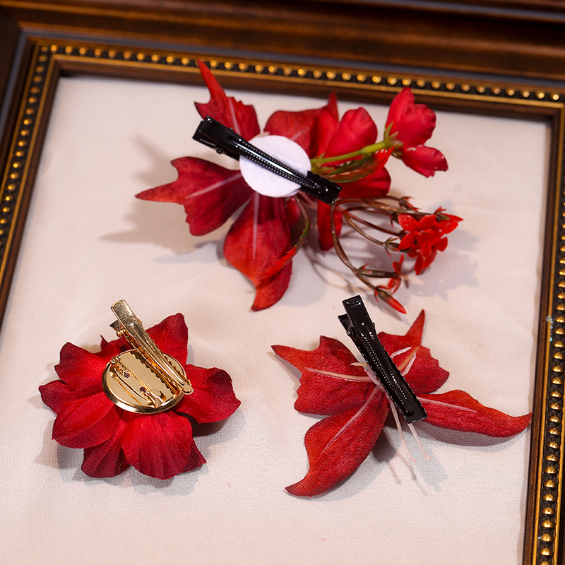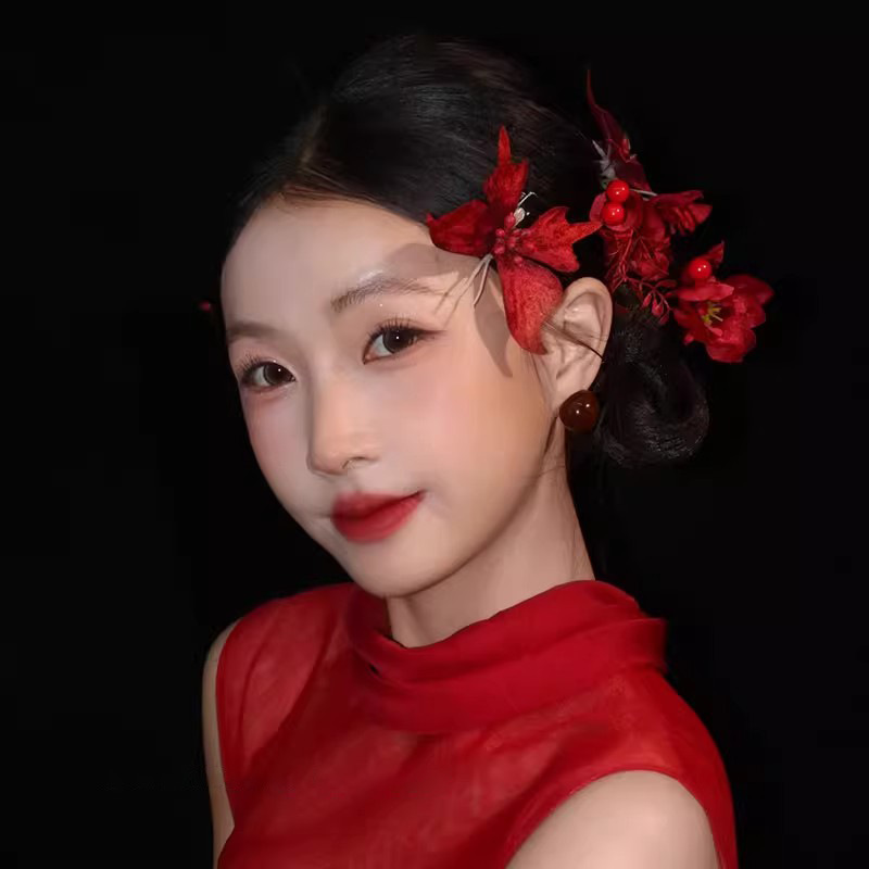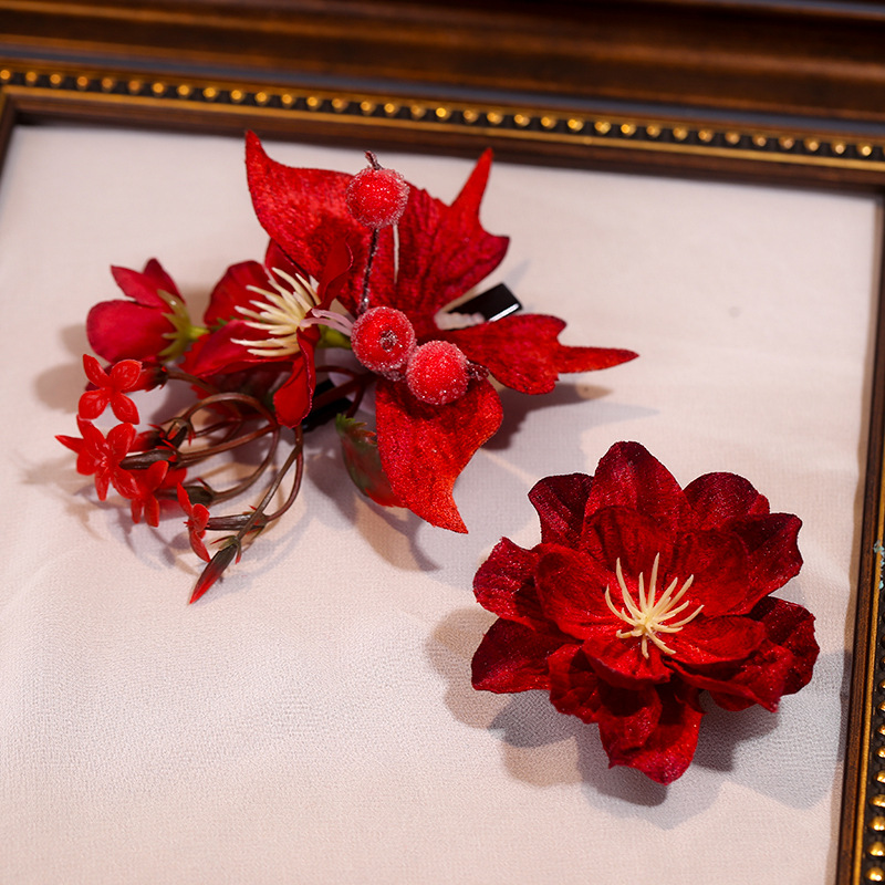 新中式新娘红色花朵蝴蝶发夹发钗敬酒服跟妆甜美造型发饰批发套装