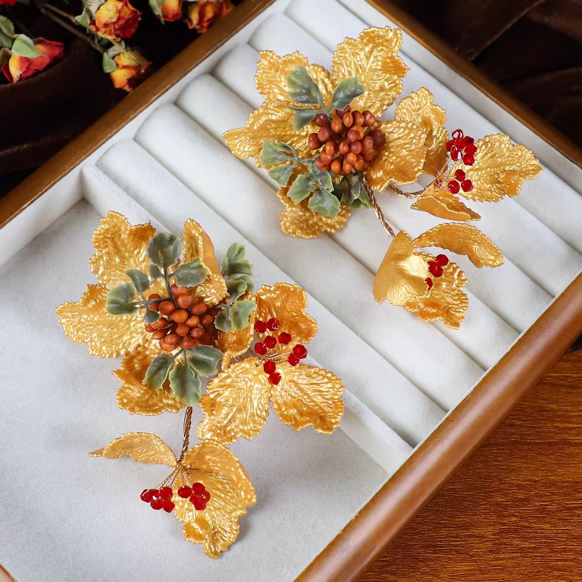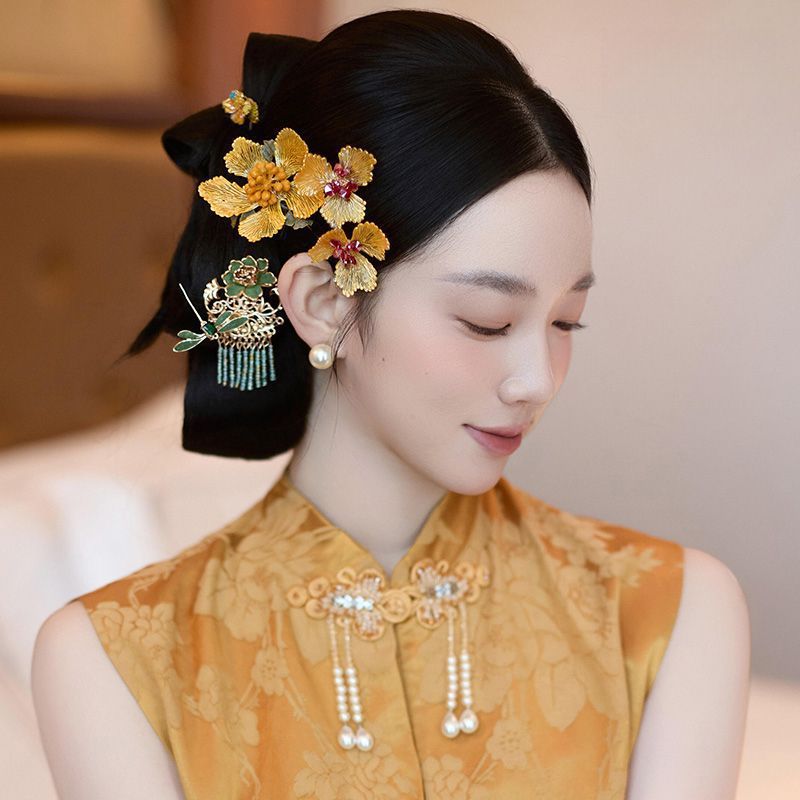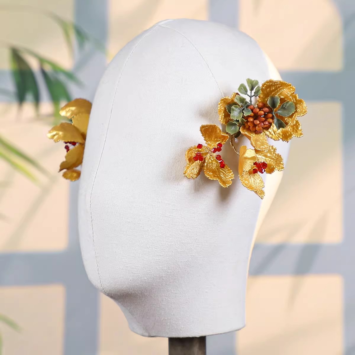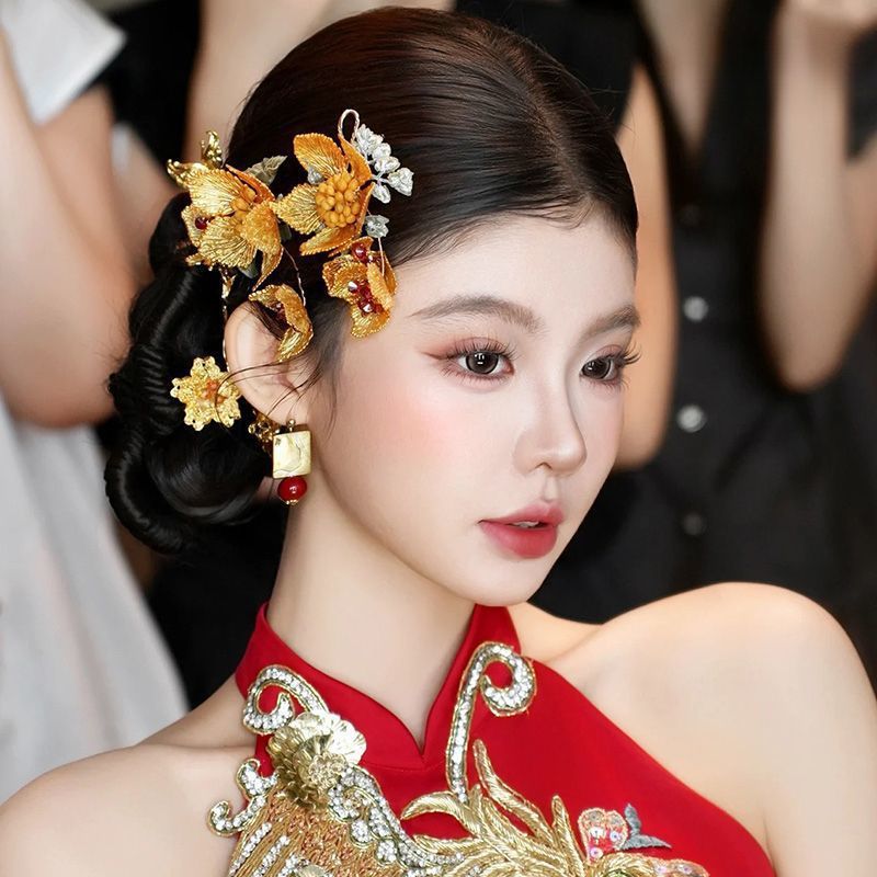 国风金色花朵侧边发饰汉服旗袍搭配头饰新娘秀禾龙凤盘发配饰批发