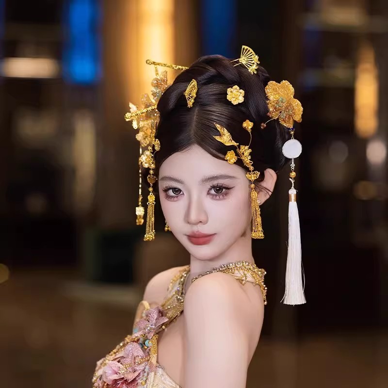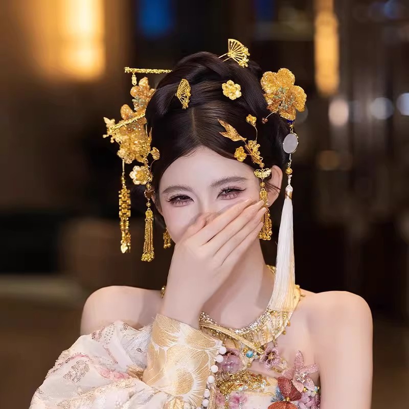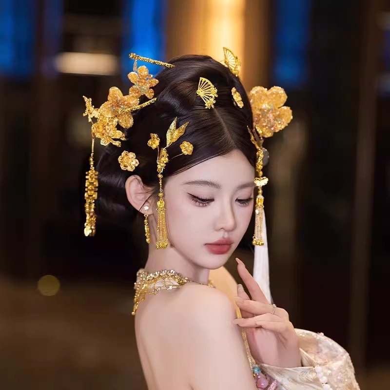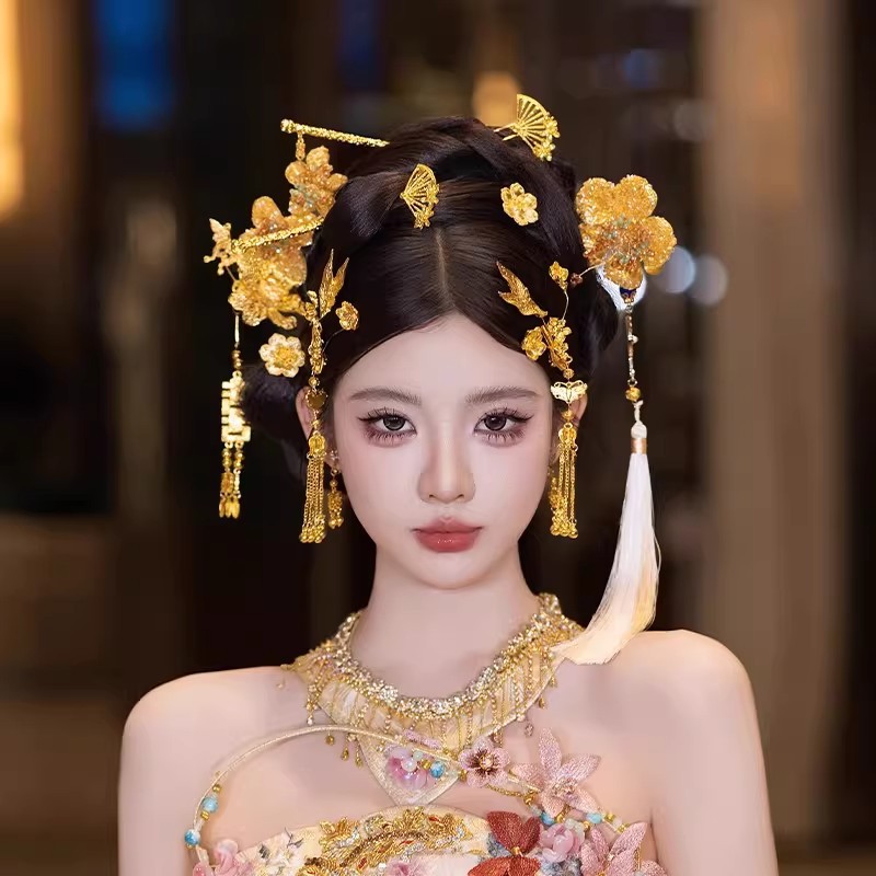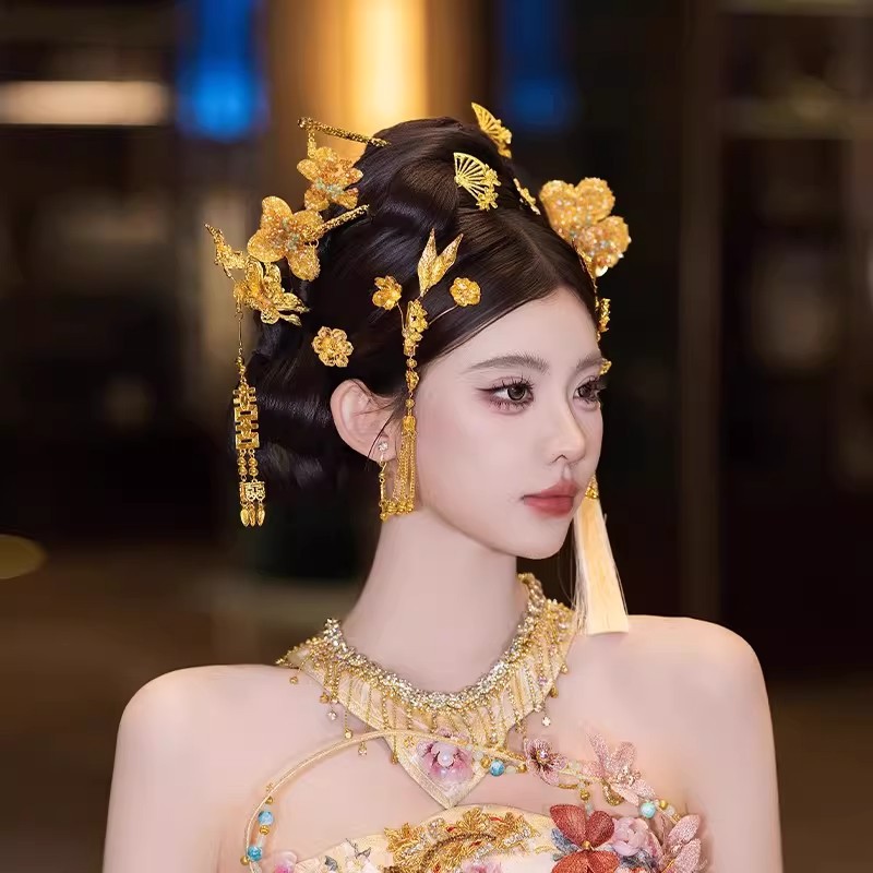 新款中式新娘头饰金色奢华大气步摇发簪秀禾服龙凤褂流苏配饰批发